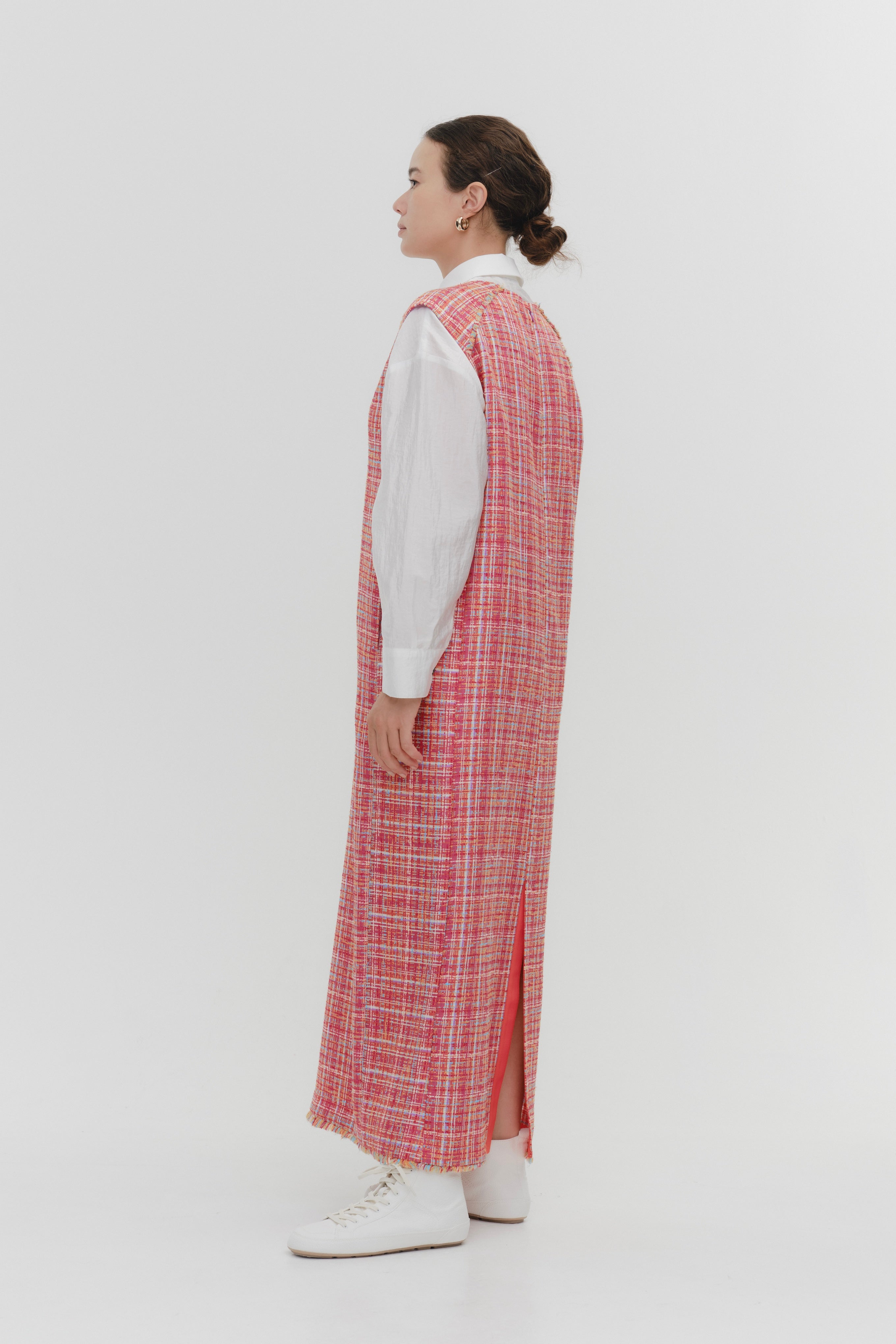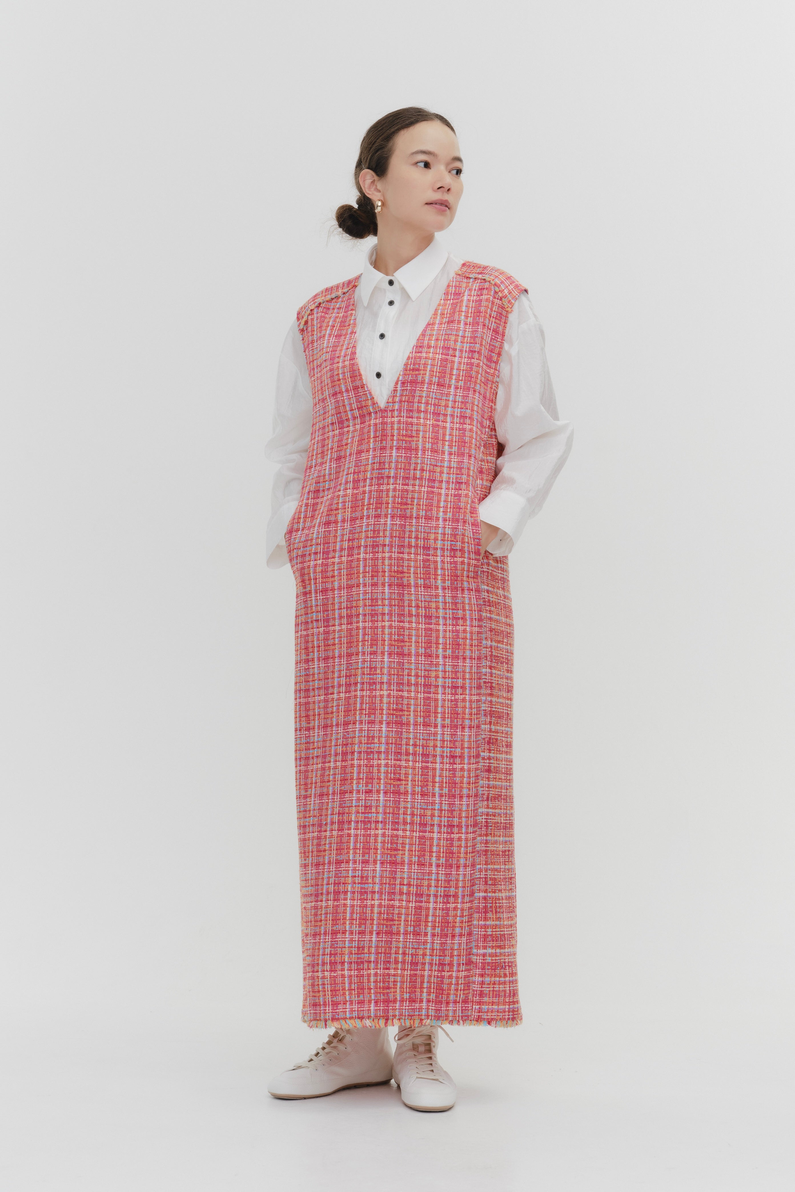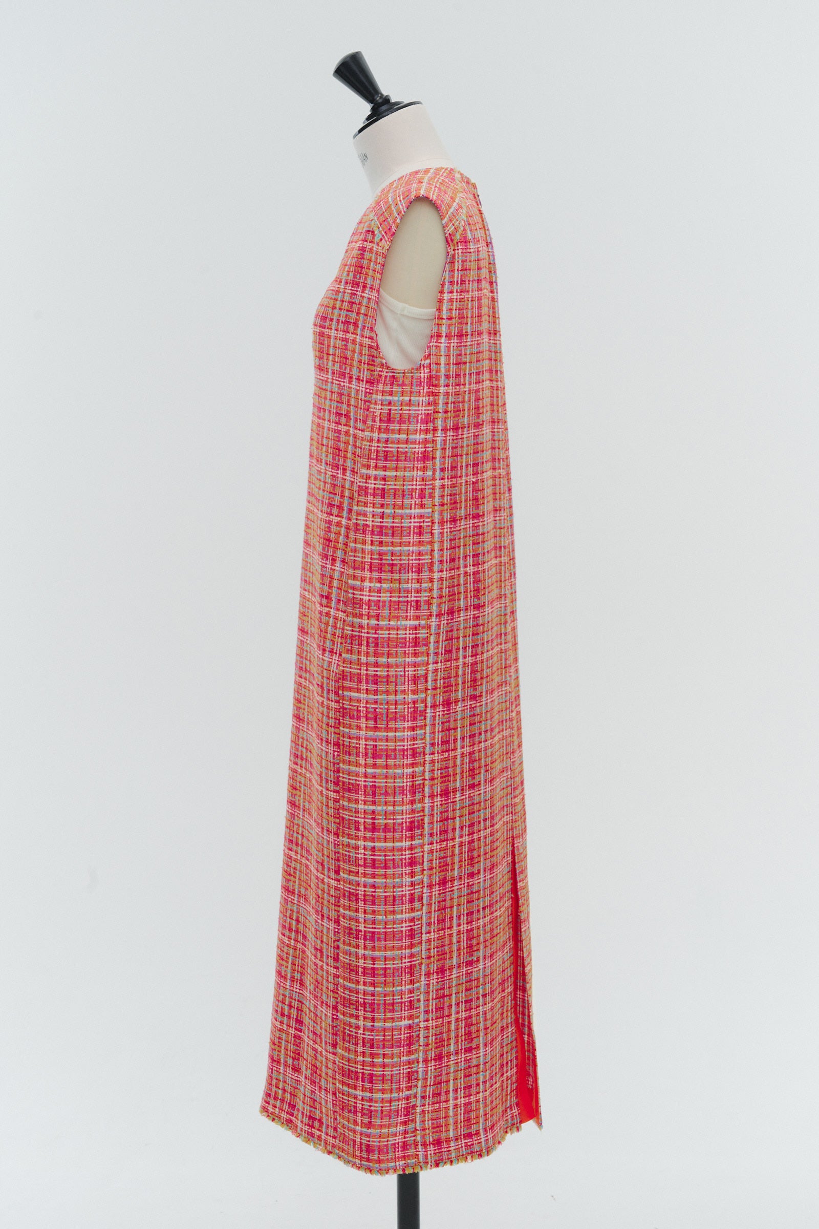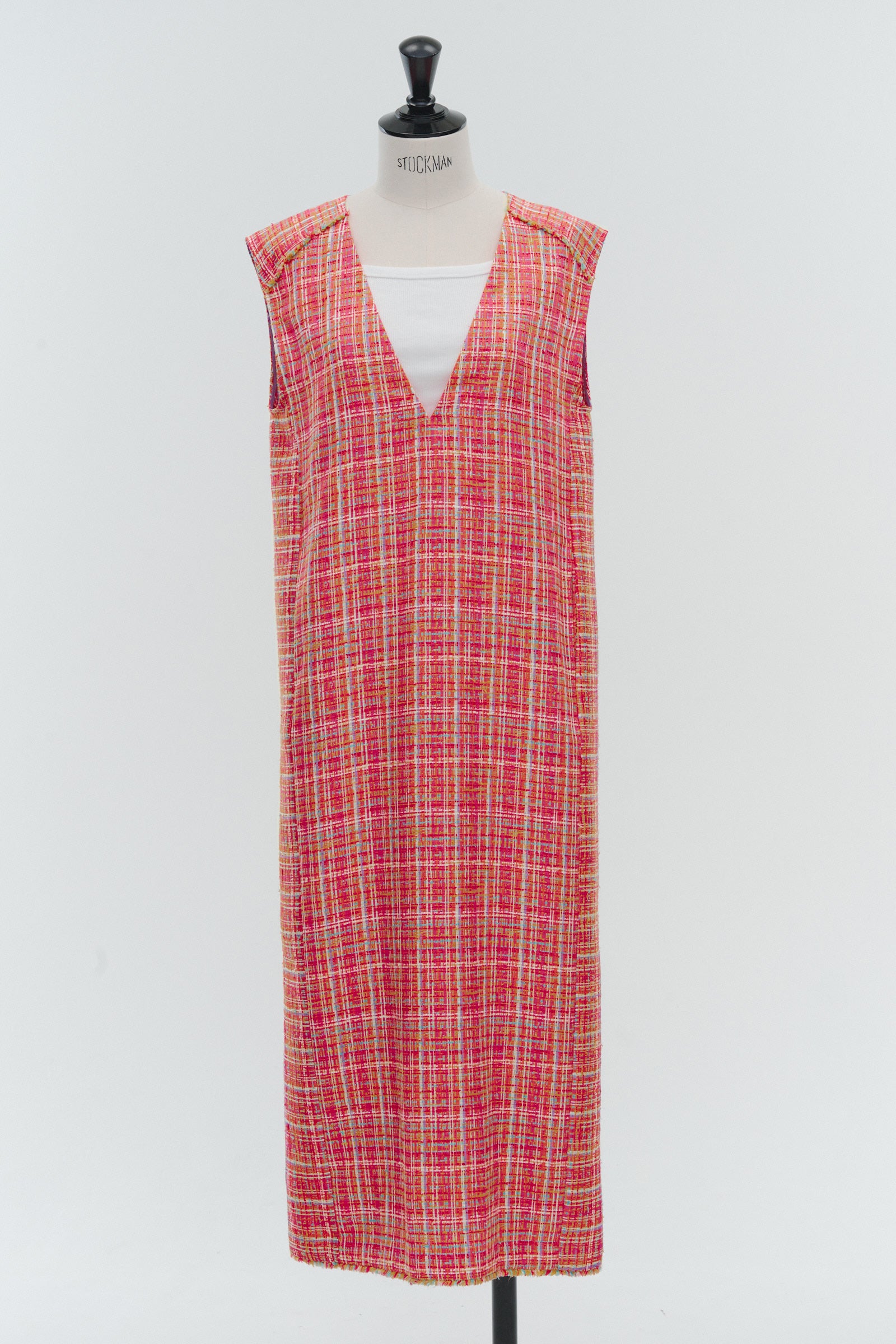 This piece is crafted from a tweed material featuring a vibrant combination of colors that exudes a luxurious and elegant atmosphere. The fabric is an original material by <yori>, made in Japan. With a longer length that reaches below the knees and a clean V-neckline, this dress creates a sleek and sophisticated impression. The fringe details placed throughout and the flattering I-line silhouette add a touch of glamour and femininity. The slit grosgrain and the interior binding are accented with eye-catching colors, delivering the lively and cheerful color combinations characteristic of yori.