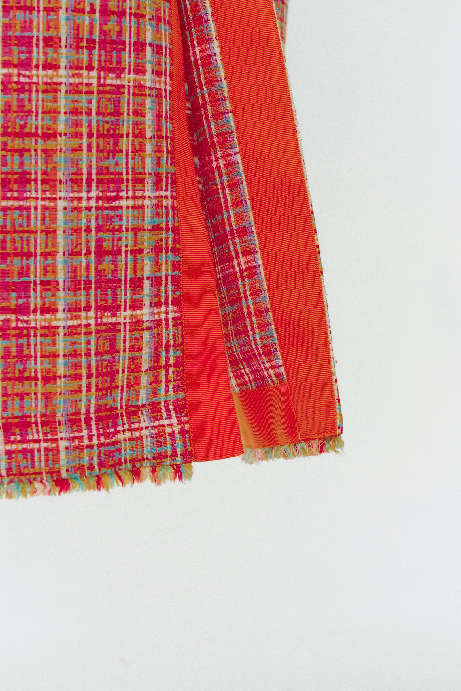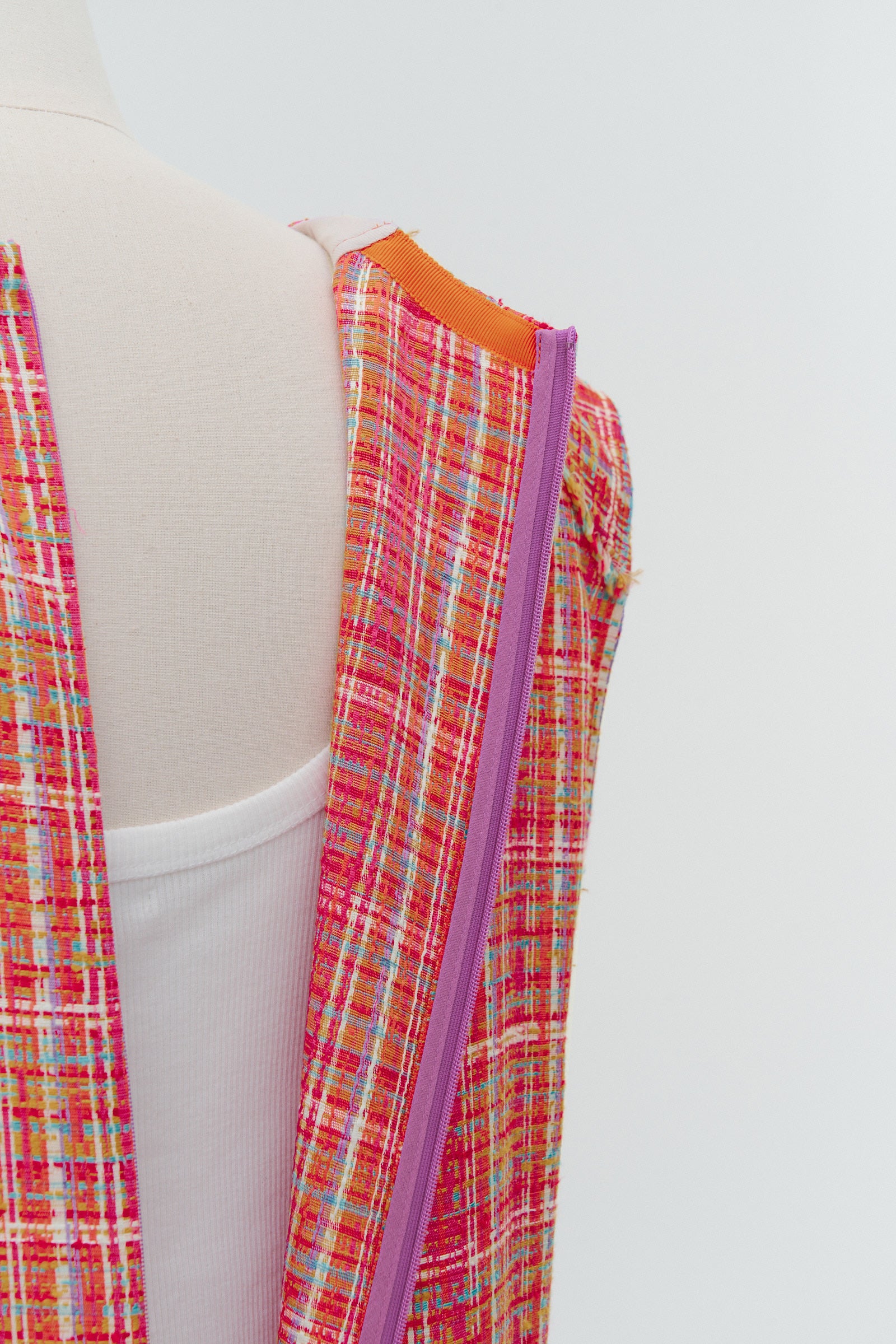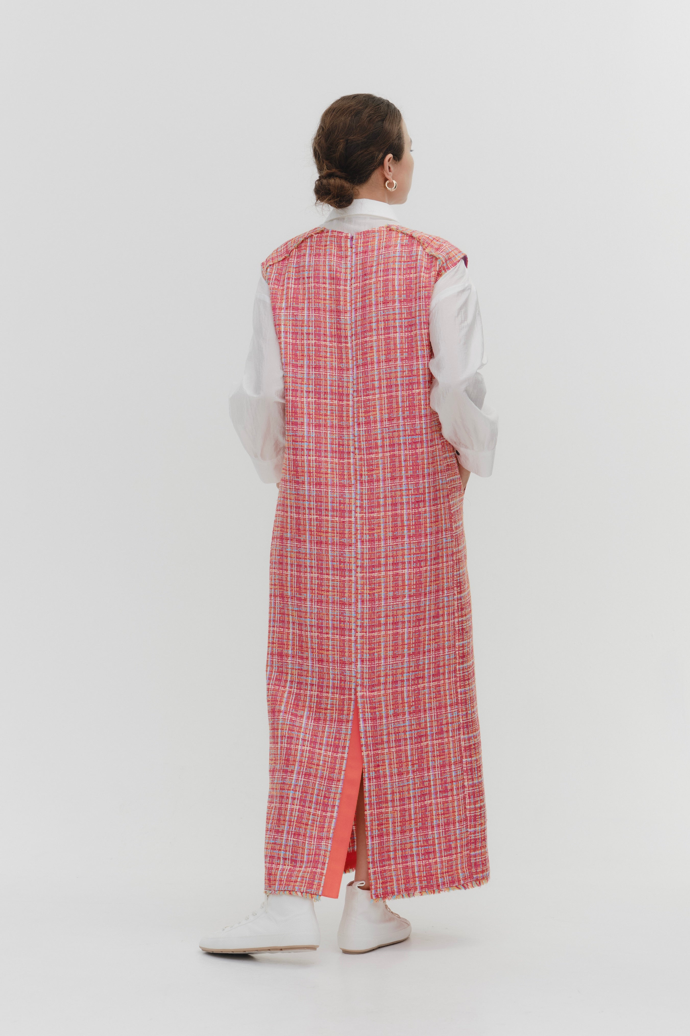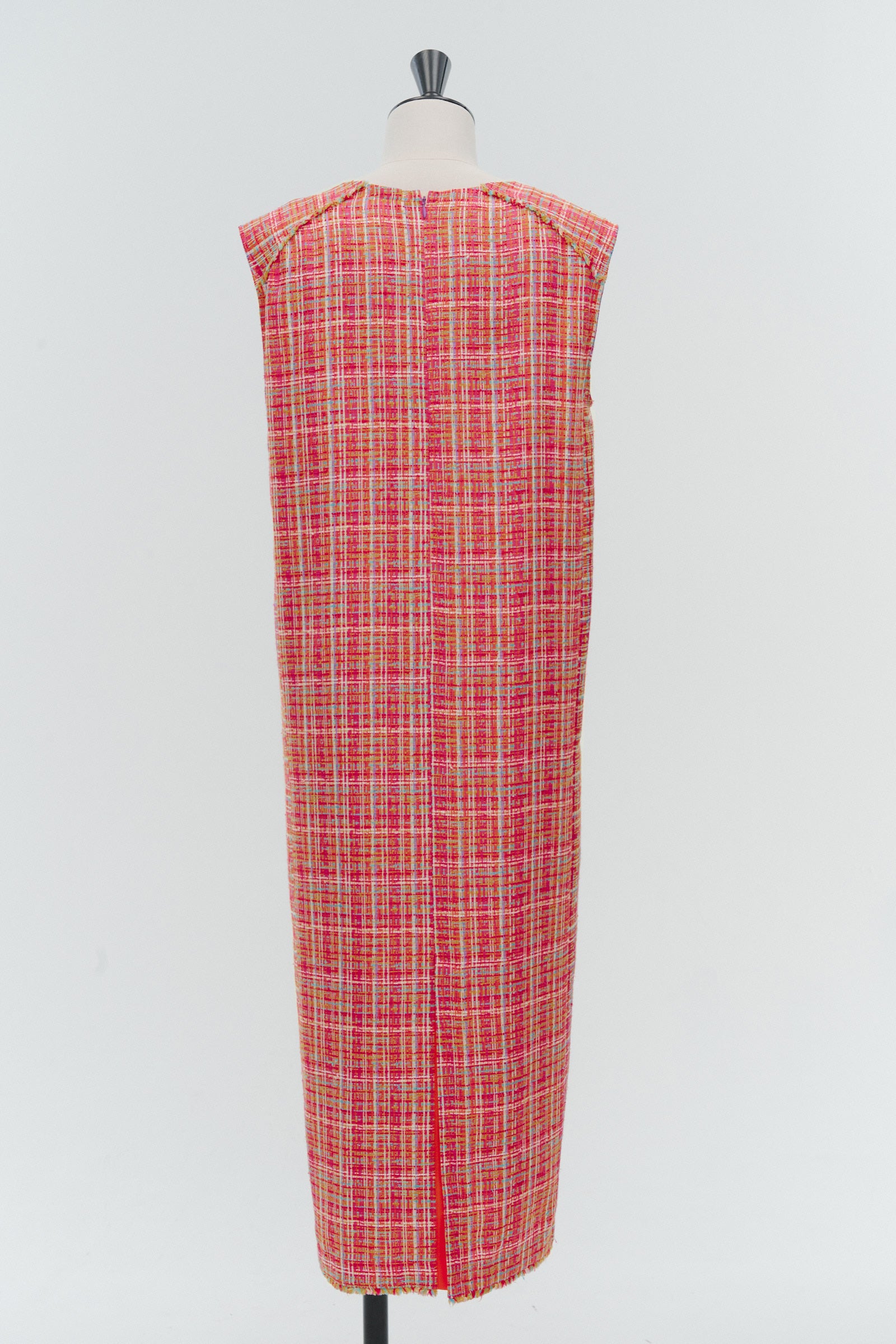 This piece is crafted from a tweed material featuring a vibrant combination of colors that exudes a luxurious and elegant atmosphere. The fabric is an original material by <yori>, made in Japan. With a longer length that reaches below the knees and a clean V-neckline, this dress creates a sleek and sophisticated impression. The fringe details placed throughout and the flattering I-line silhouette add a touch of glamour and femininity. The slit grosgrain and the interior binding are accented with eye-catching colors, delivering the lively and cheerful color combinations characteristic of yori.