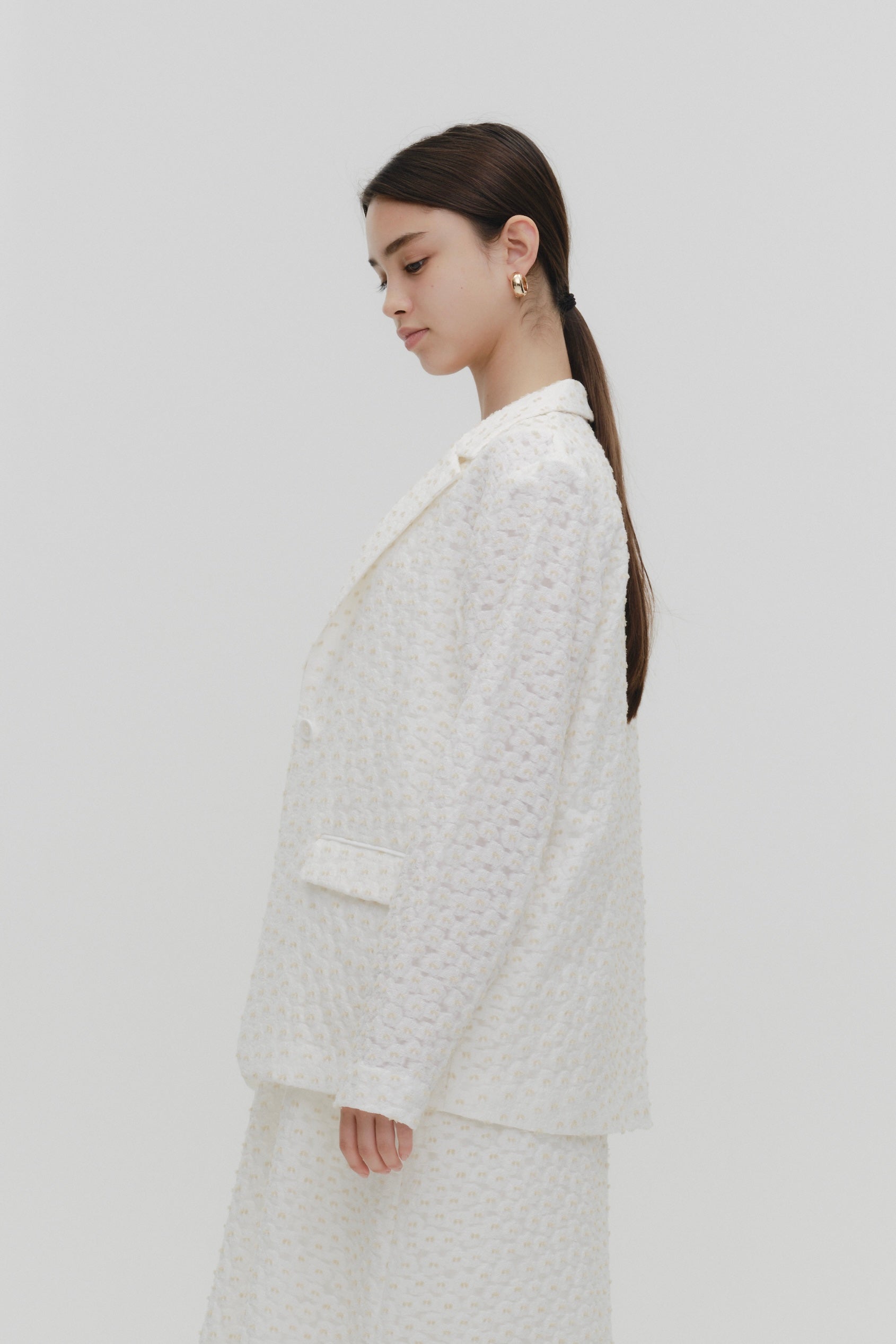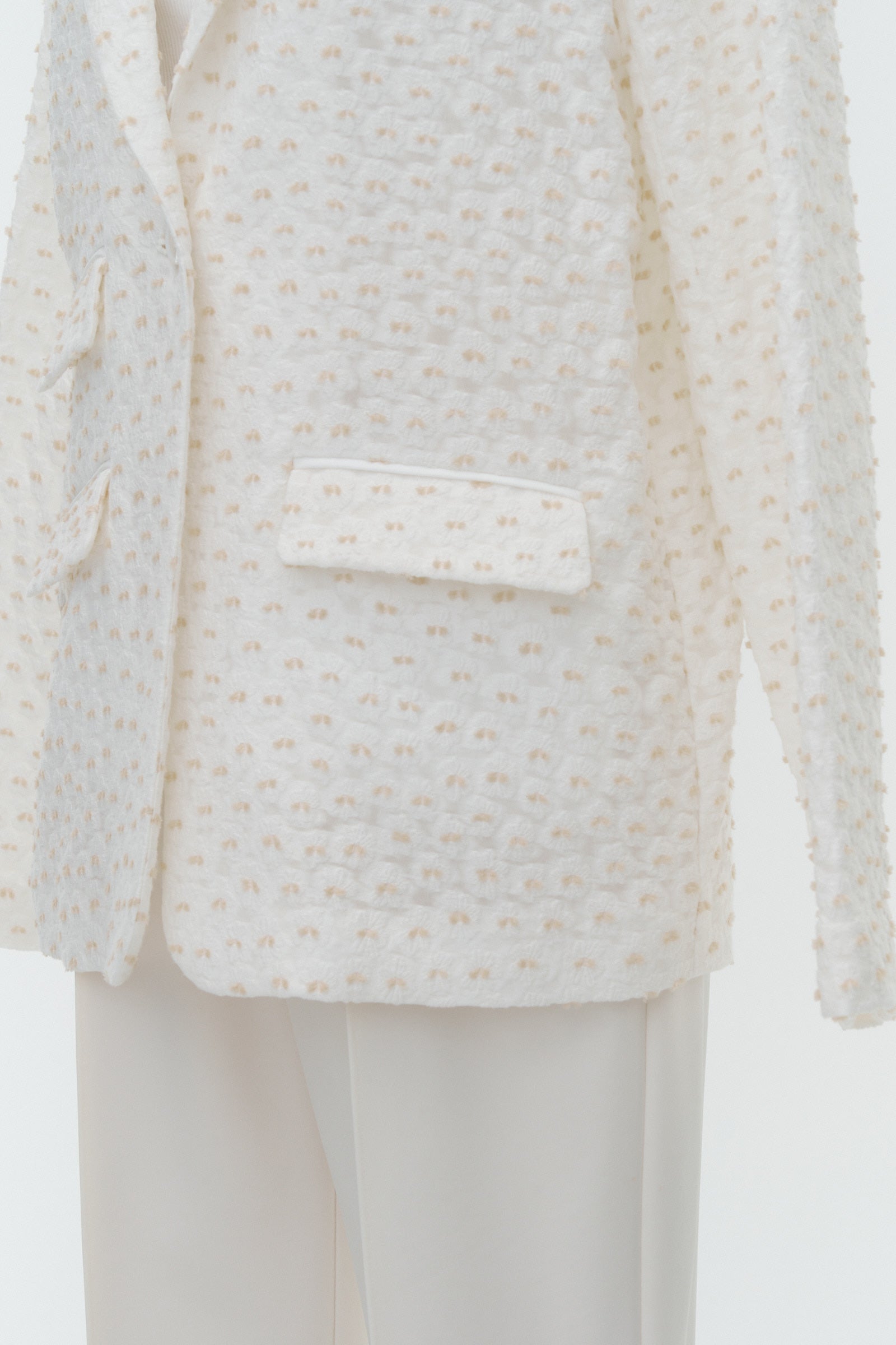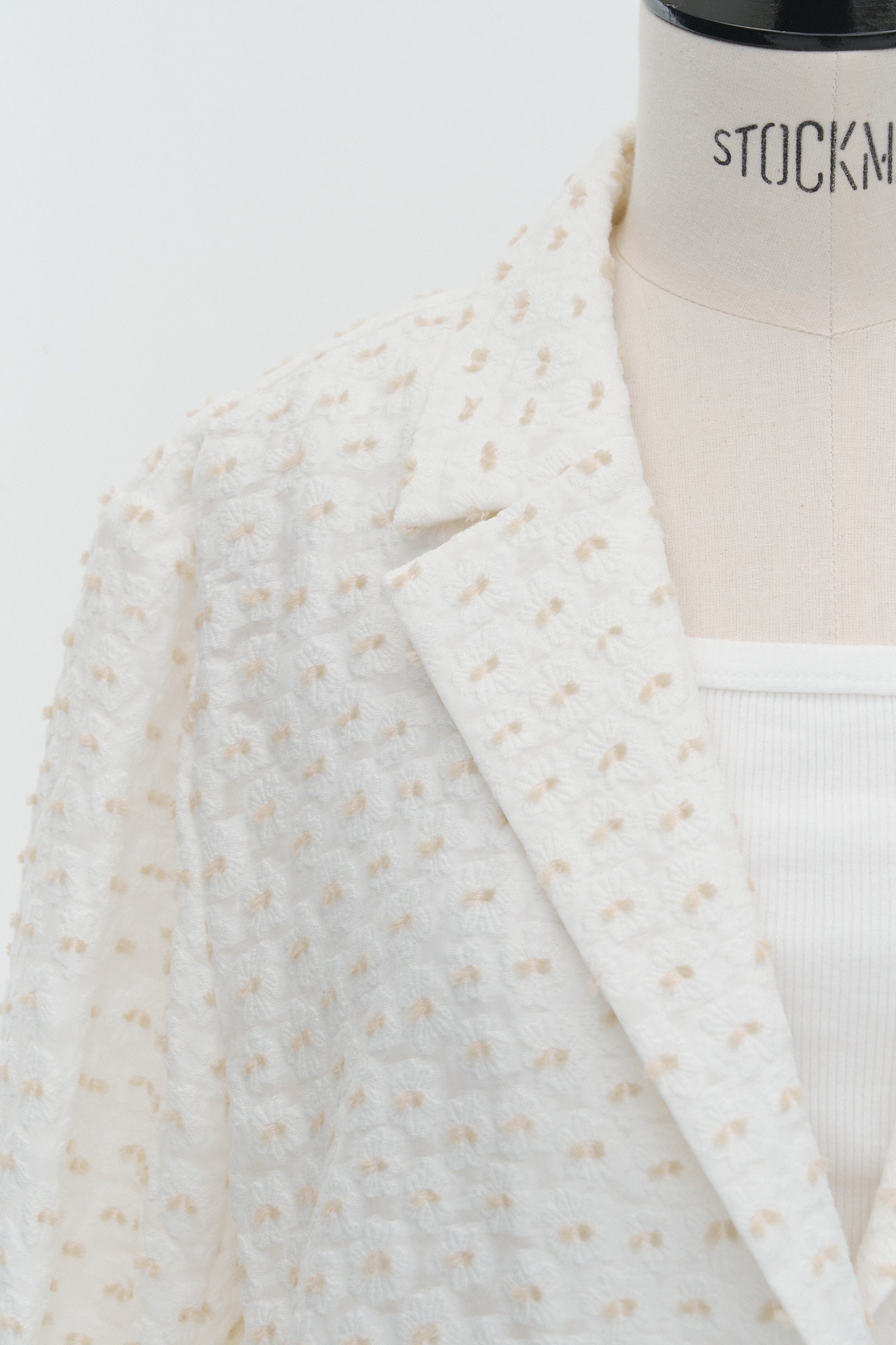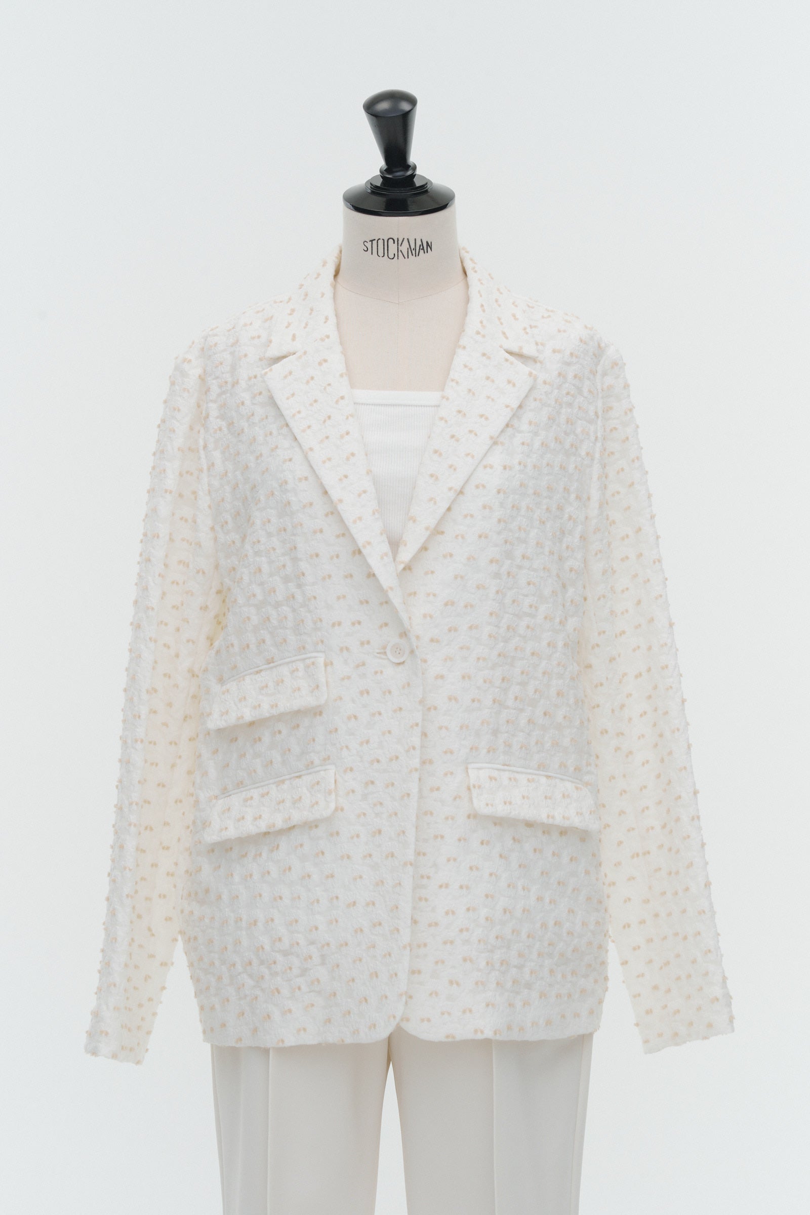 Description (EN): This series features the exclusive "shirocon" jacquard fabric, merging elegant charm with a refined, sophisticated style. Made from organza, the fabric is lightweight, soft, and naturally drapes with subtle transparency and rich texture. The jacket, crafted from this delicate material, radiates a graceful and polished aura. Designed to be worn like a cardigan, it offers versatile wear for both professional and casual occasions. Its light construction makes layering over denim or a T-shirt effortless, while the single-button closure maintains a sleek, streamlined silhouette whether closed or open. For a cohesive look, pair it with other pieces from the chamomile series.