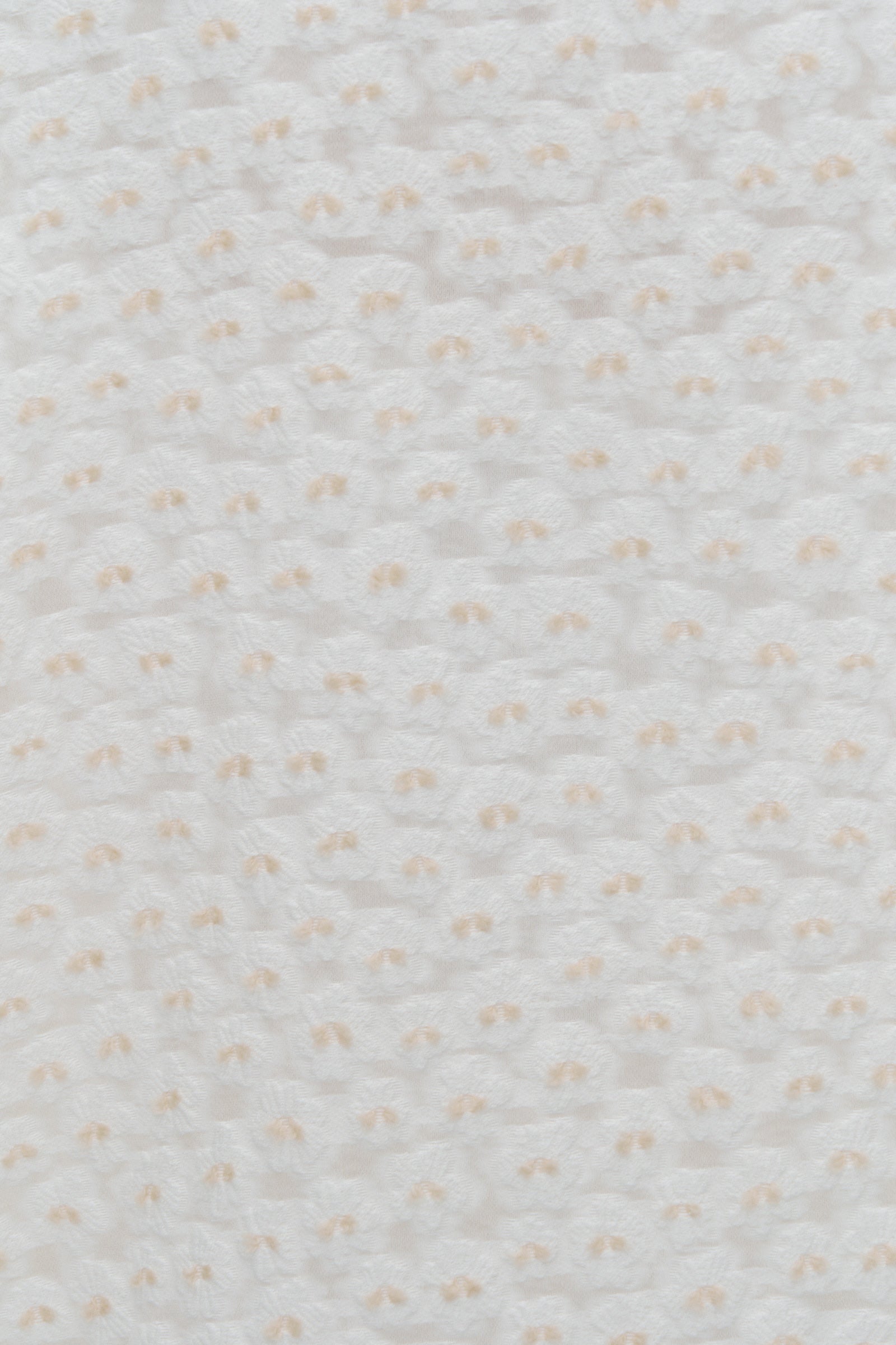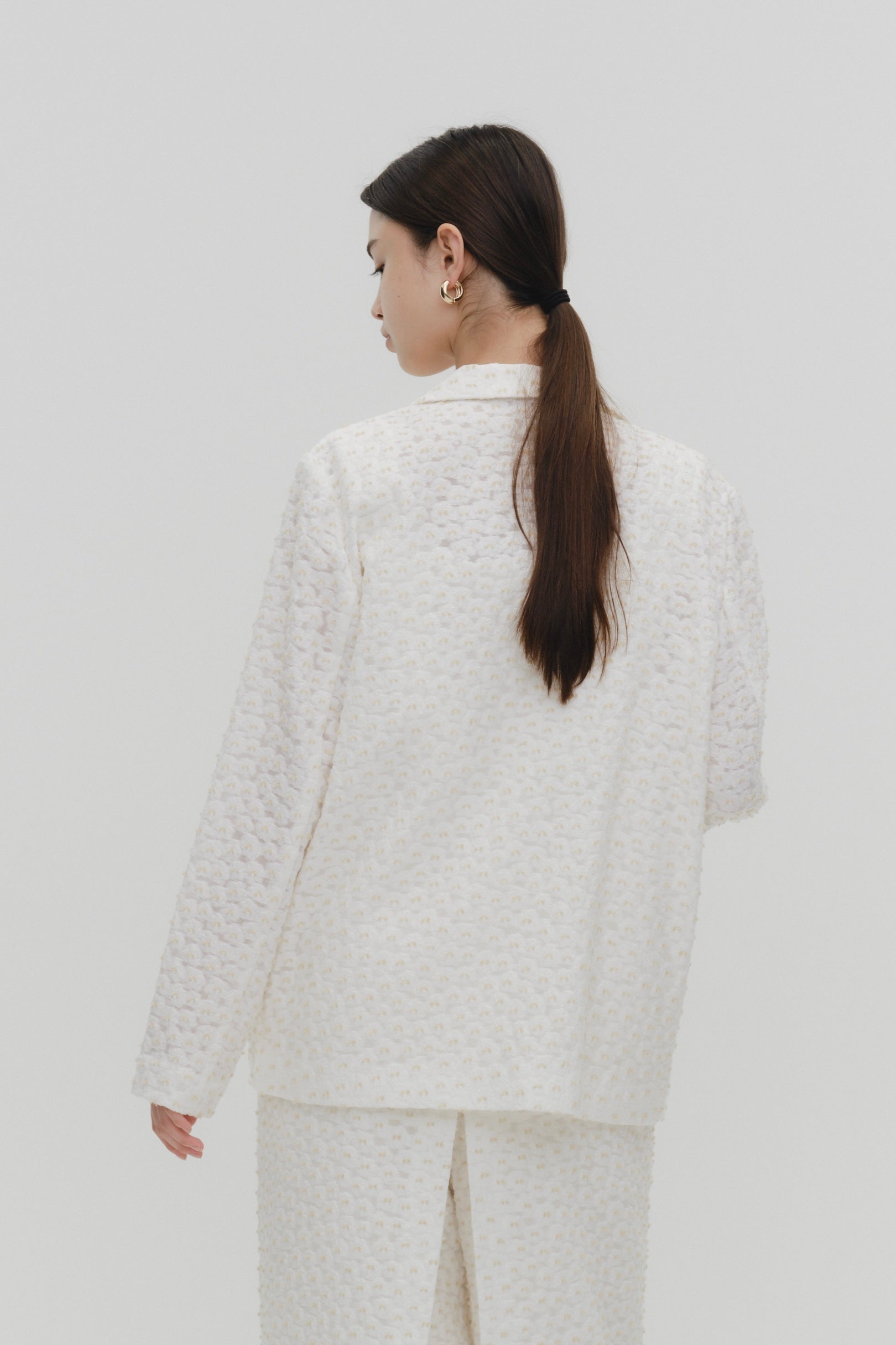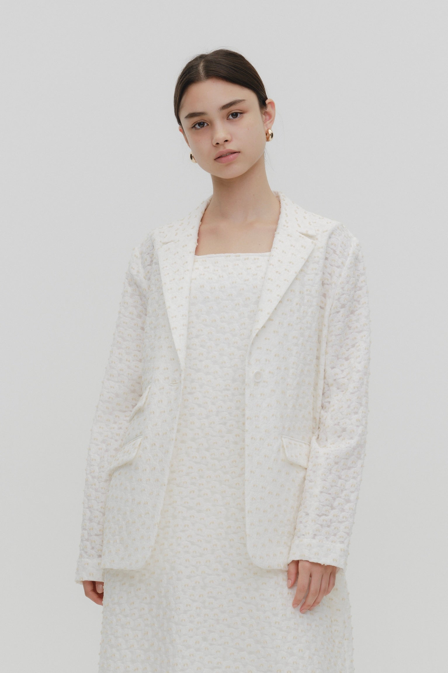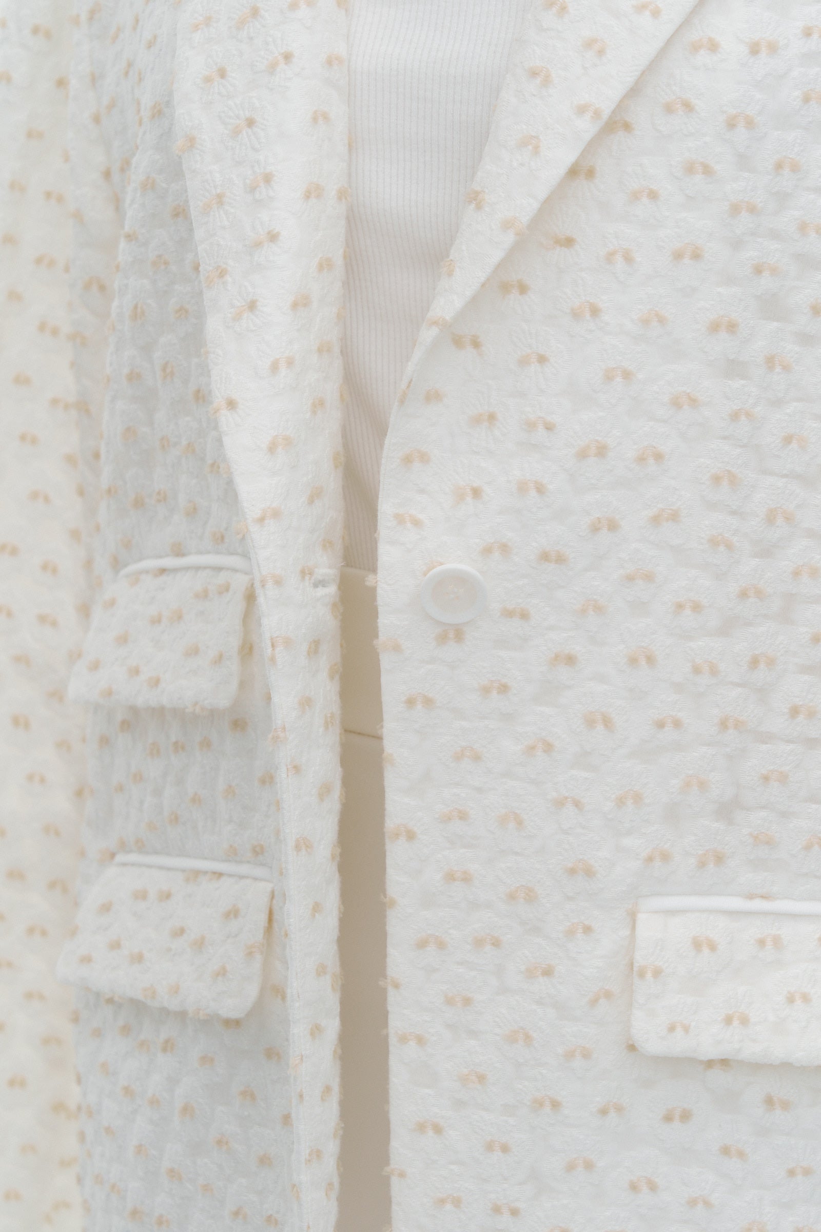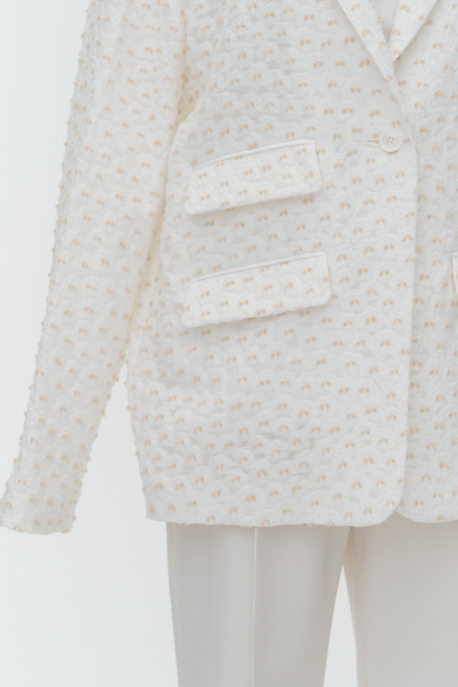 Description (EN): This series features the exclusive "shirocon" jacquard fabric, merging elegant charm with a refined, sophisticated style. Made from organza, the fabric is lightweight, soft, and naturally drapes with subtle transparency and rich texture. The jacket, crafted from this delicate material, radiates a graceful and polished aura. Designed to be worn like a cardigan, it offers versatile wear for both professional and casual occasions. Its light construction makes layering over denim or a T-shirt effortless, while the single-button closure maintains a sleek, streamlined silhouette whether closed or open. For a cohesive look, pair it with other pieces from the chamomile series.