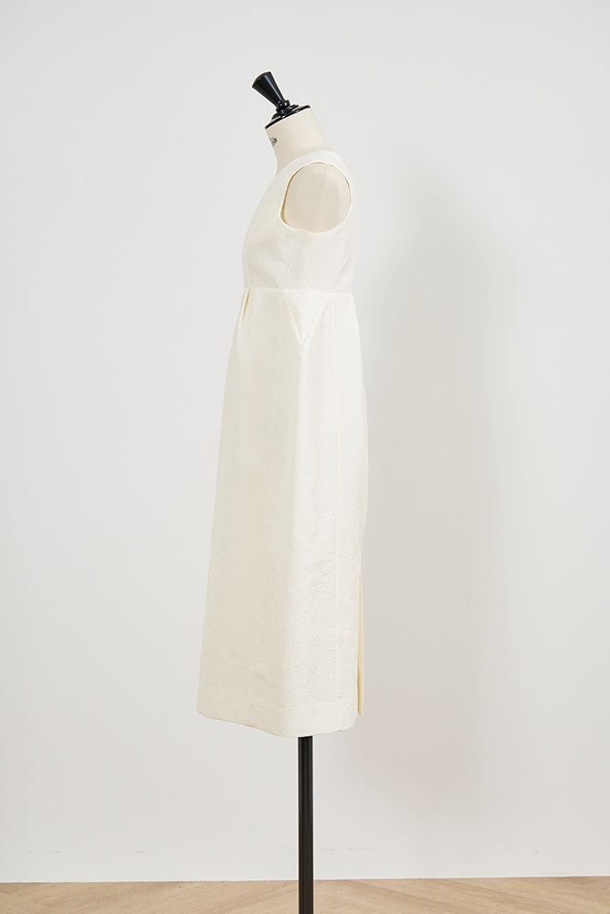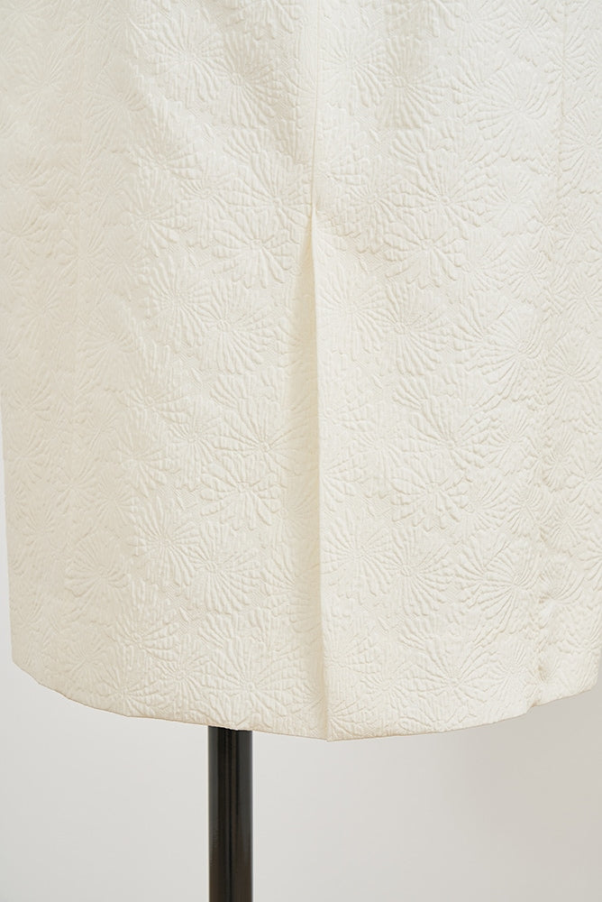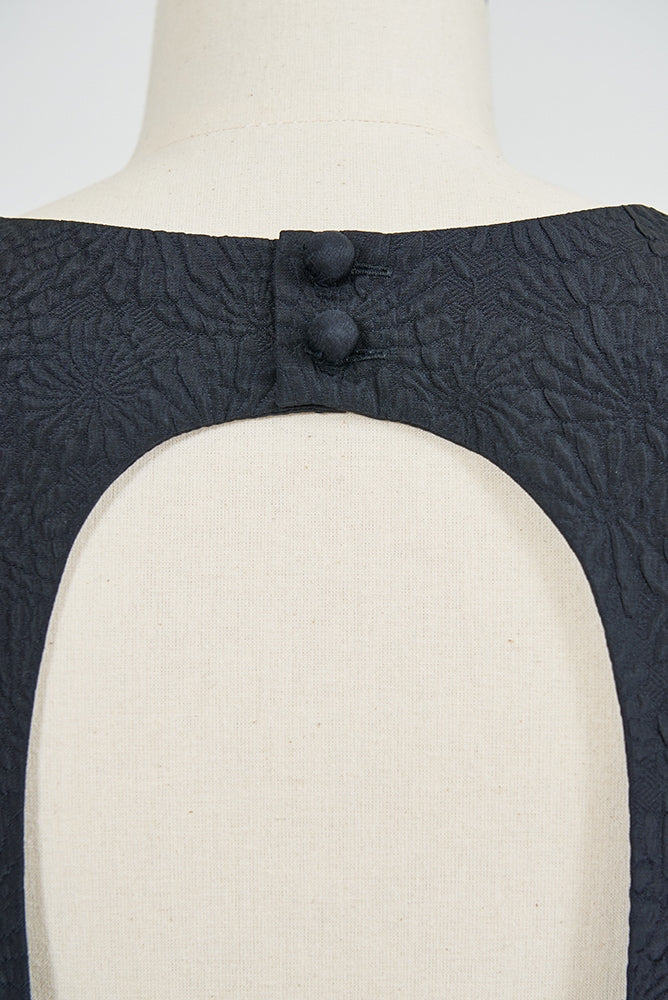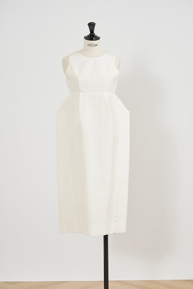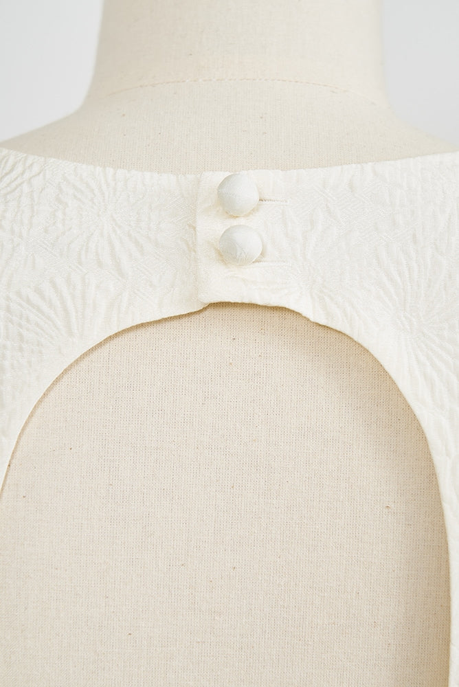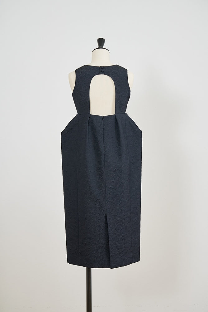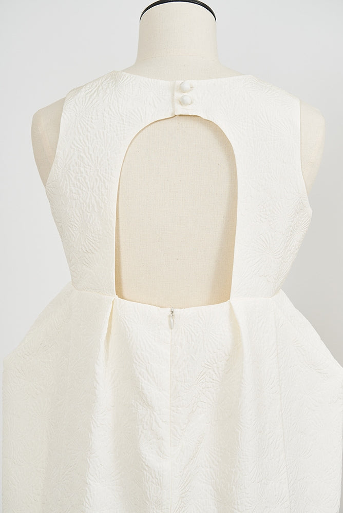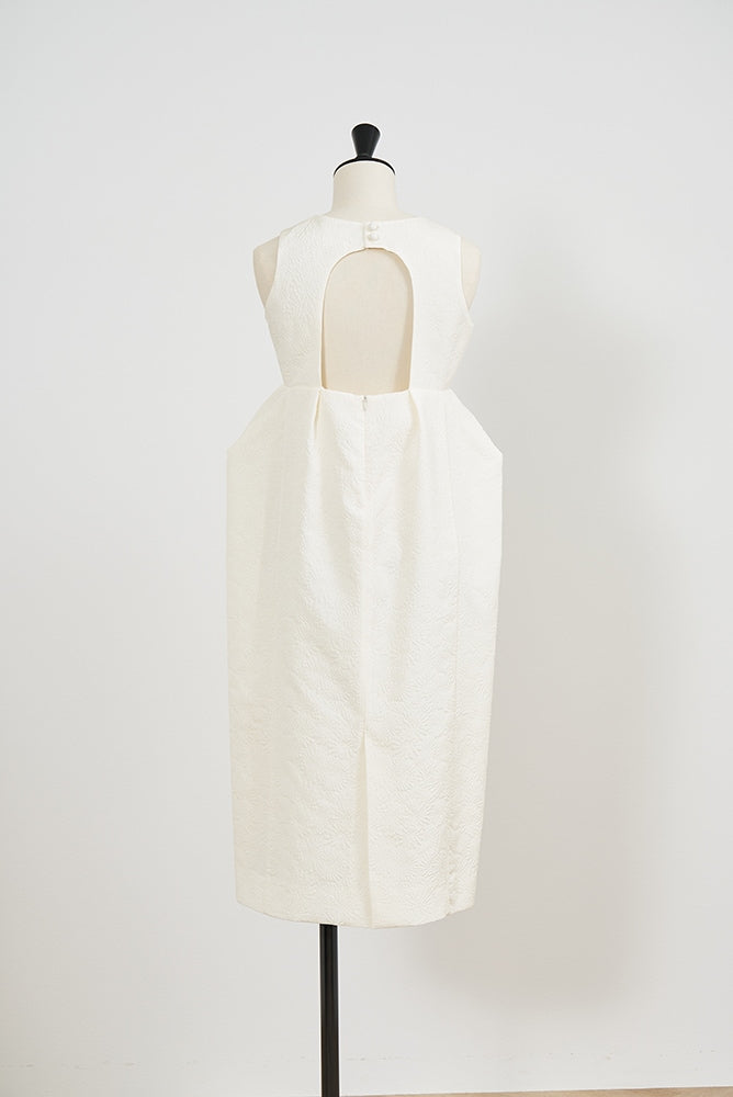 Description (EN): This dress boasts a striking three-dimensional design and a subtle, elegant sheen that evokes the delicate texture of "wasanbon" traditional Japanese sugar. Crafted from jacquard fabric, it features a vivid and detailed floral pattern. The daring open back adds a distinctive shirocon flair, complemented by round covered buttons that lend a touch of playfulness. Thoughtful fabric shaping at the sides creates a flattering silhouette from every viewpoint. Wear it on its own or layer with a turtleneck or jacket for a refined ensemble. Note that the white version is unlined and does not include pockets.