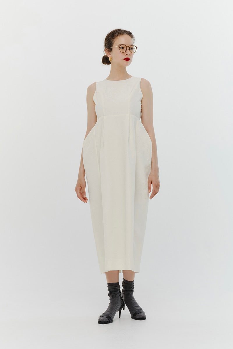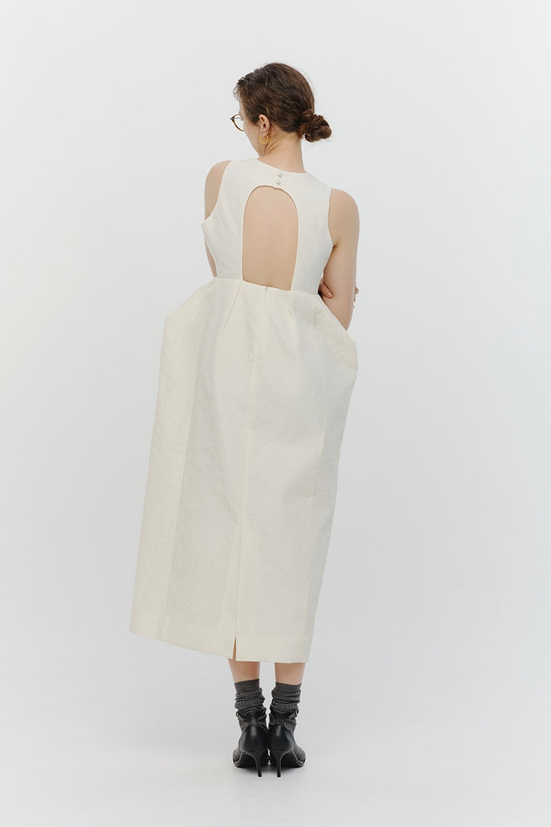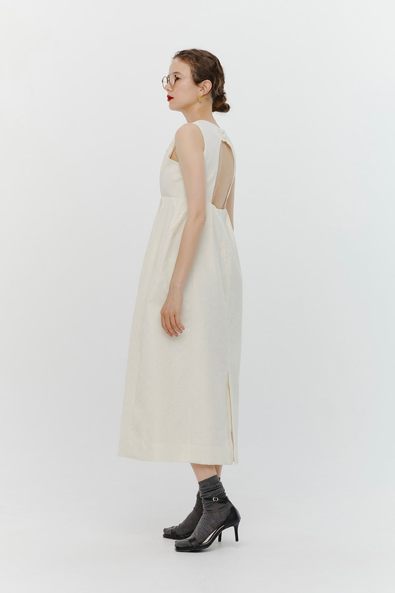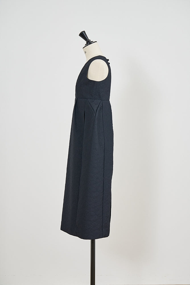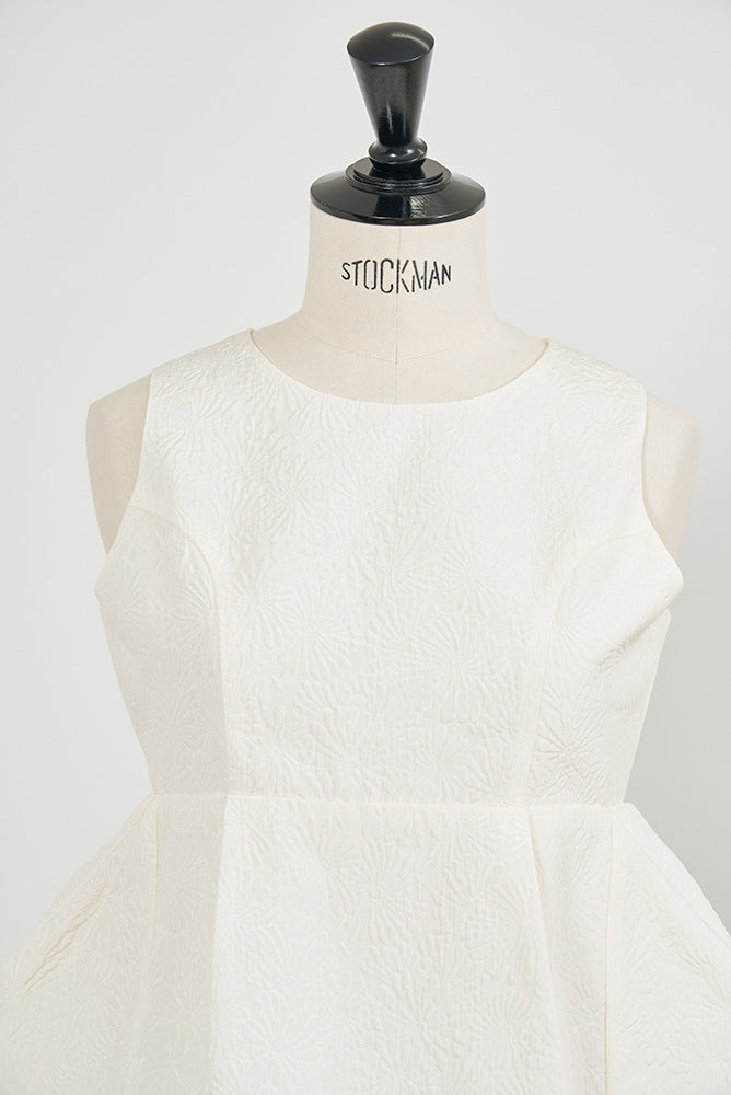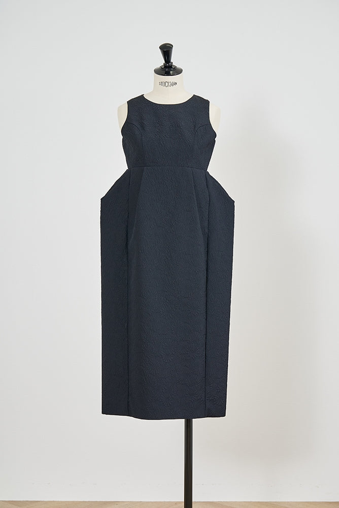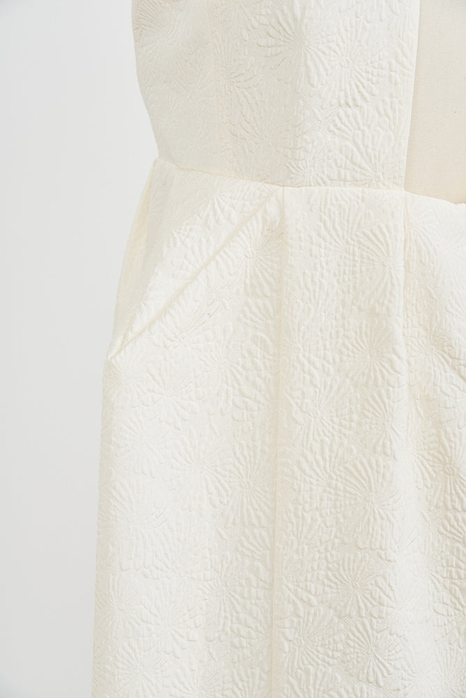 Description (EN): This dress boasts a striking three-dimensional design and a subtle, elegant sheen that evokes the delicate texture of "wasanbon" traditional Japanese sugar. Crafted from jacquard fabric, it features a vivid and detailed floral pattern. The daring open back adds a distinctive shirocon flair, complemented by round covered buttons that lend a touch of playfulness. Thoughtful fabric shaping at the sides creates a flattering silhouette from every viewpoint. Wear it on its own or layer with a turtleneck or jacket for a refined ensemble. Note that the white version is unlined and does not include pockets.