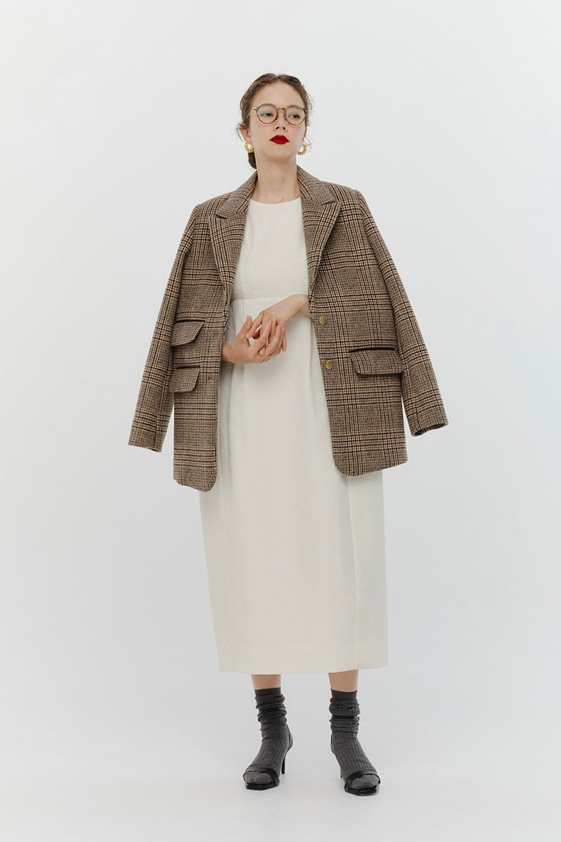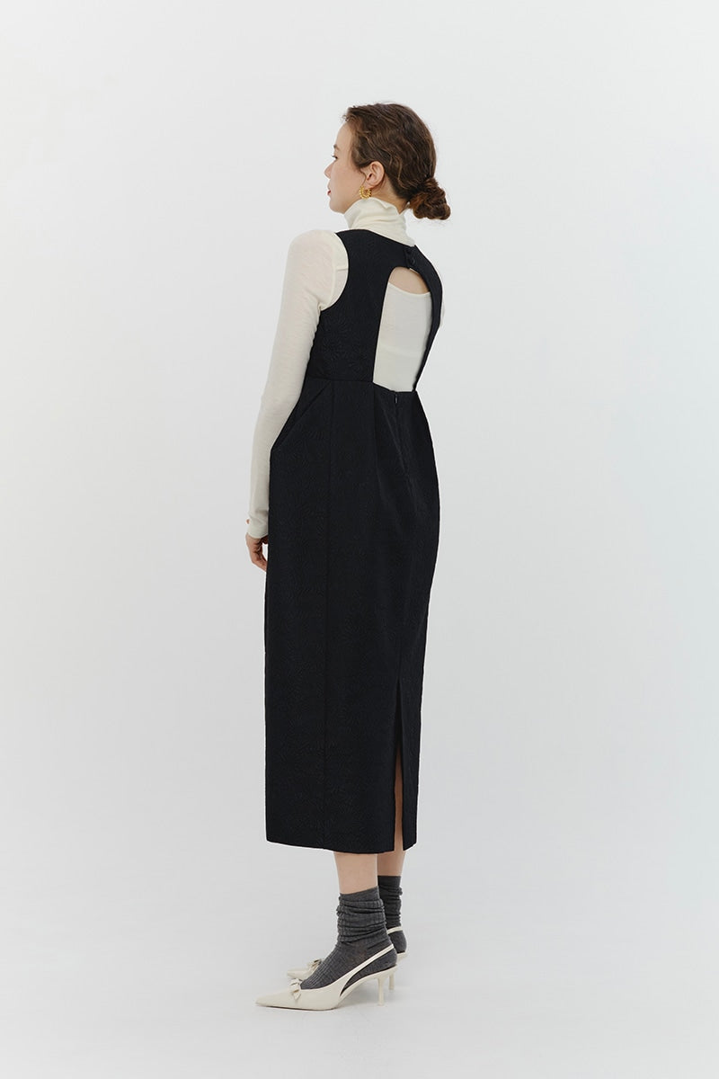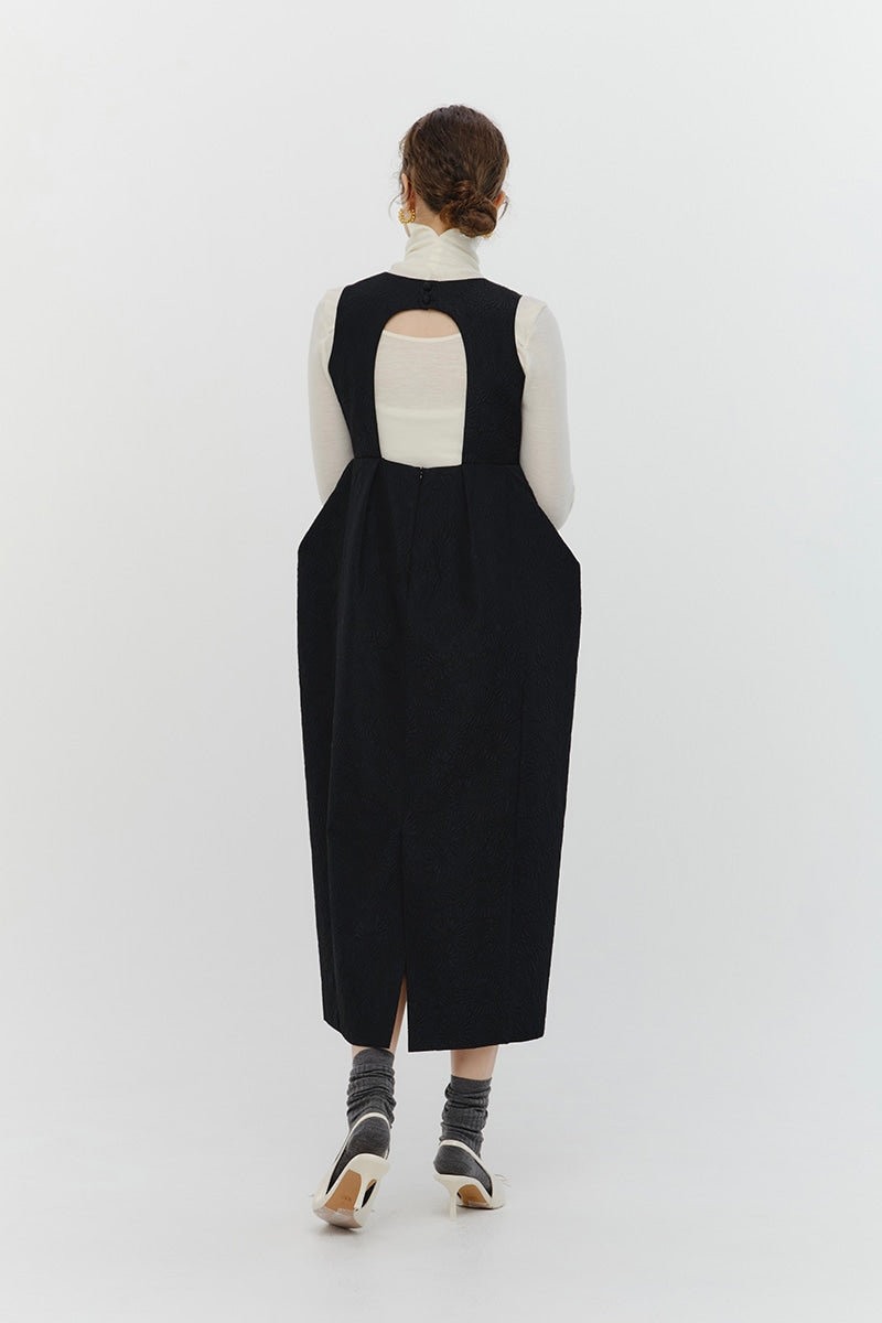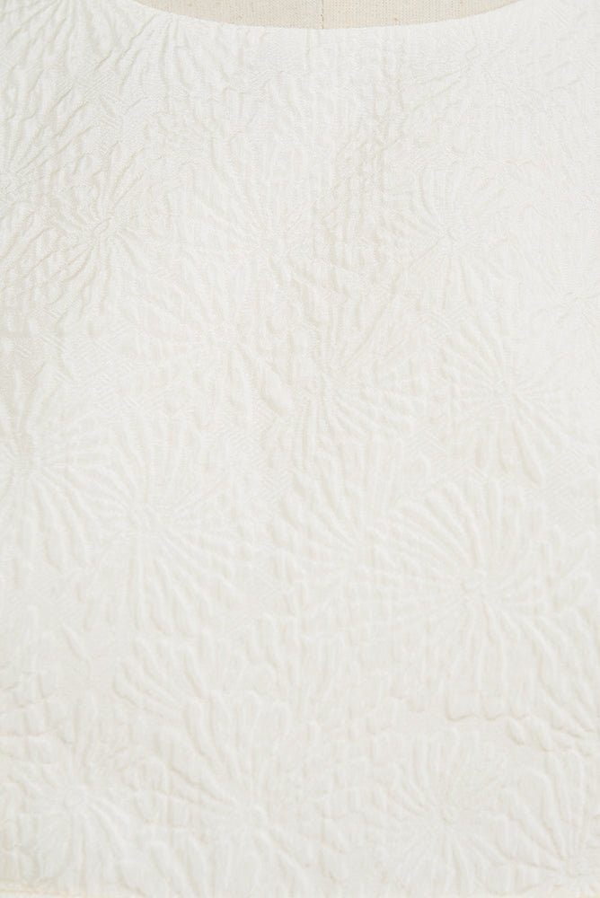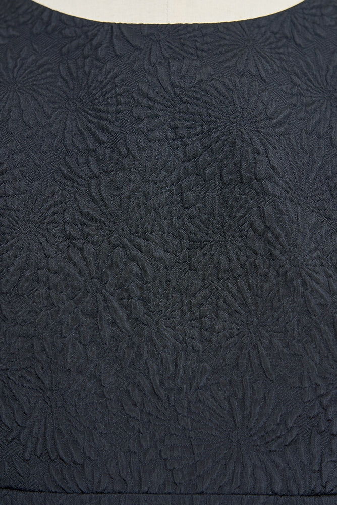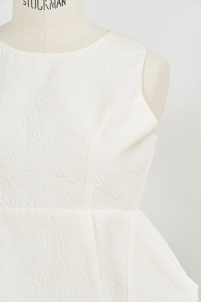 Description (EN): This dress boasts a striking three-dimensional design and a subtle, elegant sheen that evokes the delicate texture of "wasanbon" traditional Japanese sugar. Crafted from jacquard fabric, it features a vivid and detailed floral pattern. The daring open back adds a distinctive shirocon flair, complemented by round covered buttons that lend a touch of playfulness. Thoughtful fabric shaping at the sides creates a flattering silhouette from every viewpoint. Wear it on its own or layer with a turtleneck or jacket for a refined ensemble. Note that the white version is unlined and does not include pockets.