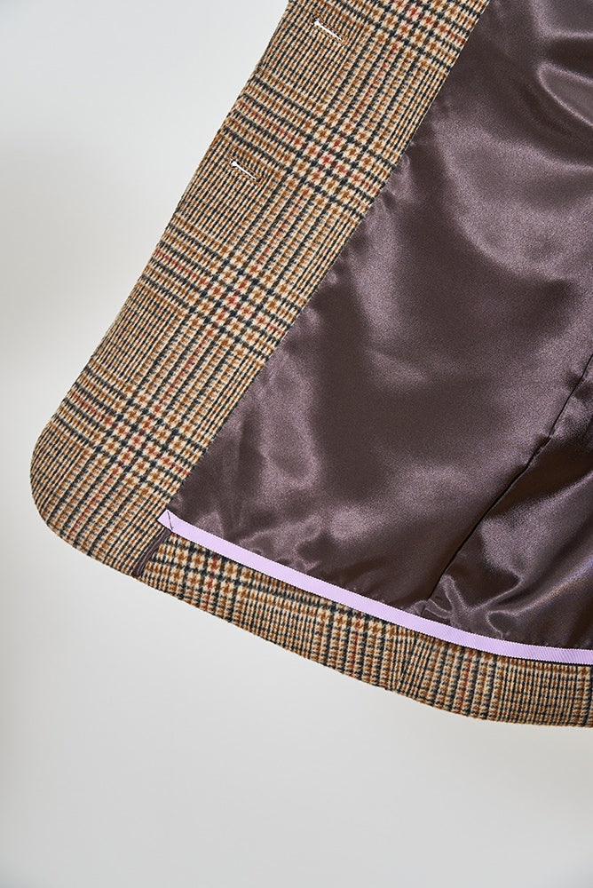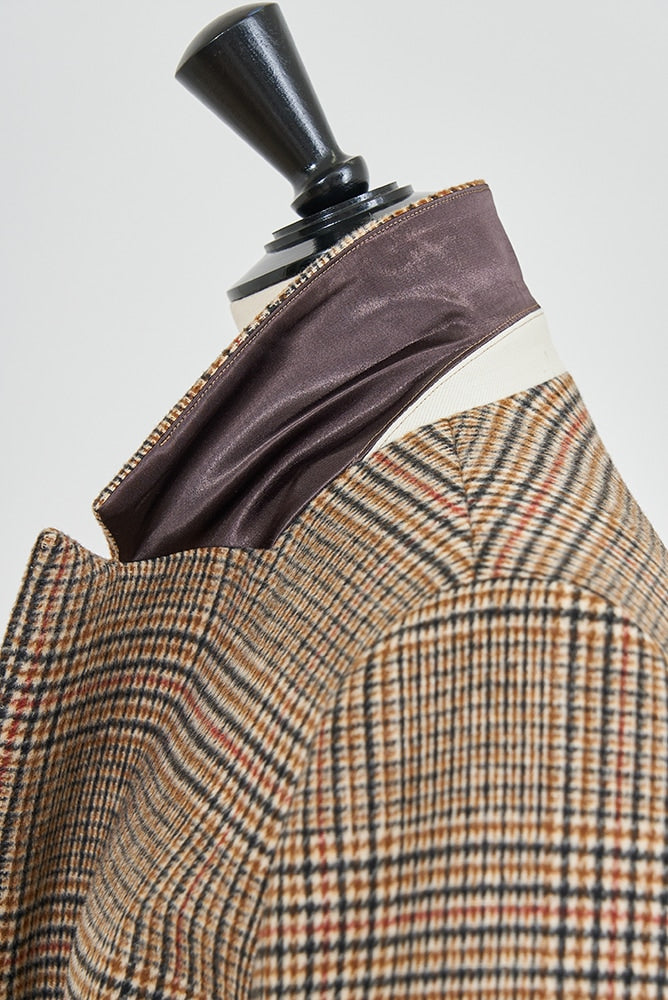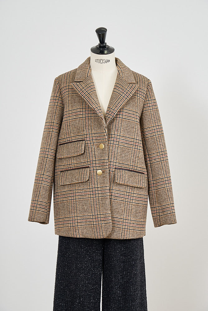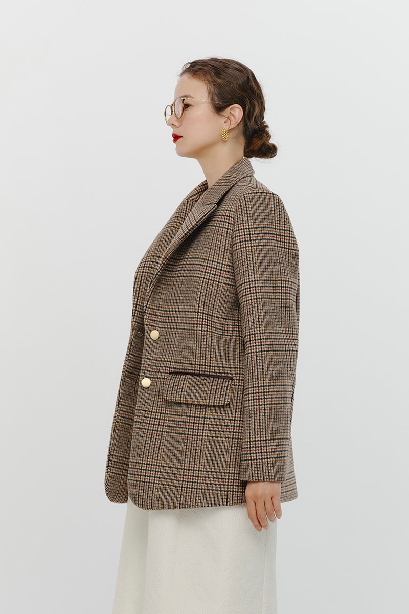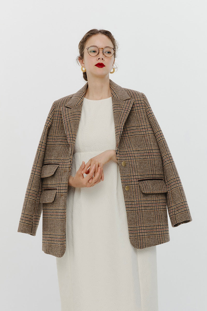 Description (EN): This jacket is crafted with two fabric : a soft brown houndstooth and a solid wool-blend twill with a structured feel thanks to its bonded construction. Designed exclusively by shirocon, it features a straight cut and longer length that covers the hips. The high-positioned two-button closure creates a modern look, while the lack of a back vent keeps the design sleek and simple. Satin accents on the collar underside and pockets add a refined detail, complemented by a matching satin lining for comfort. Perfect for versatile fall and winter styling, from professional settings to everyday casual wear.