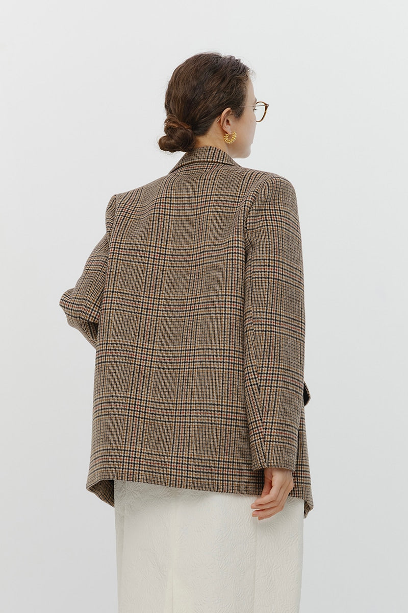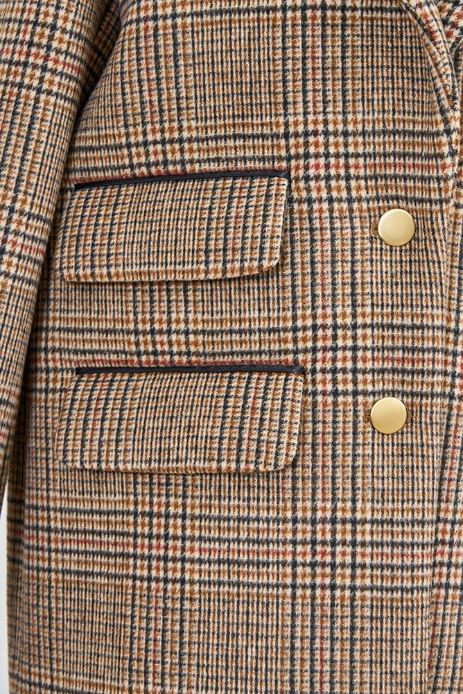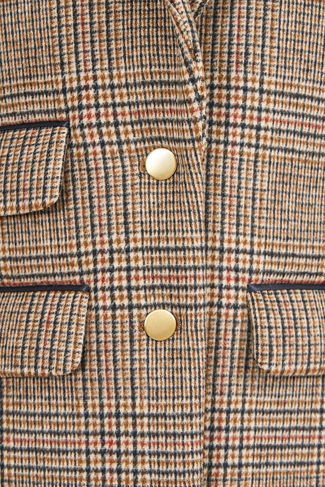 Beschreibung (DE): Diese Jacke ist aus zwei Stoffen gefertigt: einem weichen braunen Hahnentritt und einem unifarbenen Woll-Mix-Twill mit strukturiertem Gefühl dank verklebter Konstruktion. Exklusiv von Shirocon entworfen, besticht sie durch einen geraden Schnitt und längere Form, die die Hüften bedeckt. Der hoch positionierte Zwei-Knopf-Verschluss kreiert einen modernen Look, während das Fehlen eines Rückenschlitzes das Design elegant und schlicht hält. Satin-Akzente an der Kragenunterseite und den Taschen verleihen raffinierte Details, ergänzt durch ein passendes Satin-Futter für Komfort. Perfekt für vielseitiges Herbst- und Winter-Styling, von professionellen Anlässen bis hin zu lässiger Alltagskleidung.