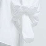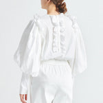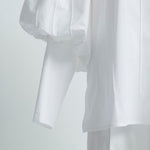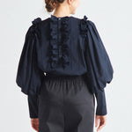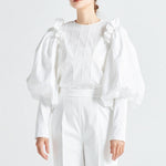 This delicate and refined blouse features dimensional lines created with special embroidery techniques using a unique sewing machine. The compact crew neckline and candy-like voluminous sleeves elegantly accentuate the shoulders, giving a slender appearance. The straight, slightly extended sleeves create a graceful impression by emphasizing the slim cuffs.