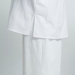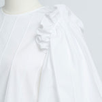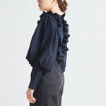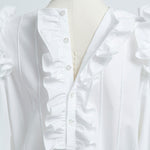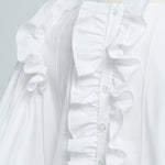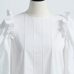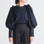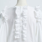 Crafted from a stretchy, lightweight fabric with a soft yet crisp texture, this blouse ensures both comfort and sophistication. The back button closure is adorned with original yori shell buttons, while the double-layered frill design around it adds a soft, airy, and classically elegant touch.