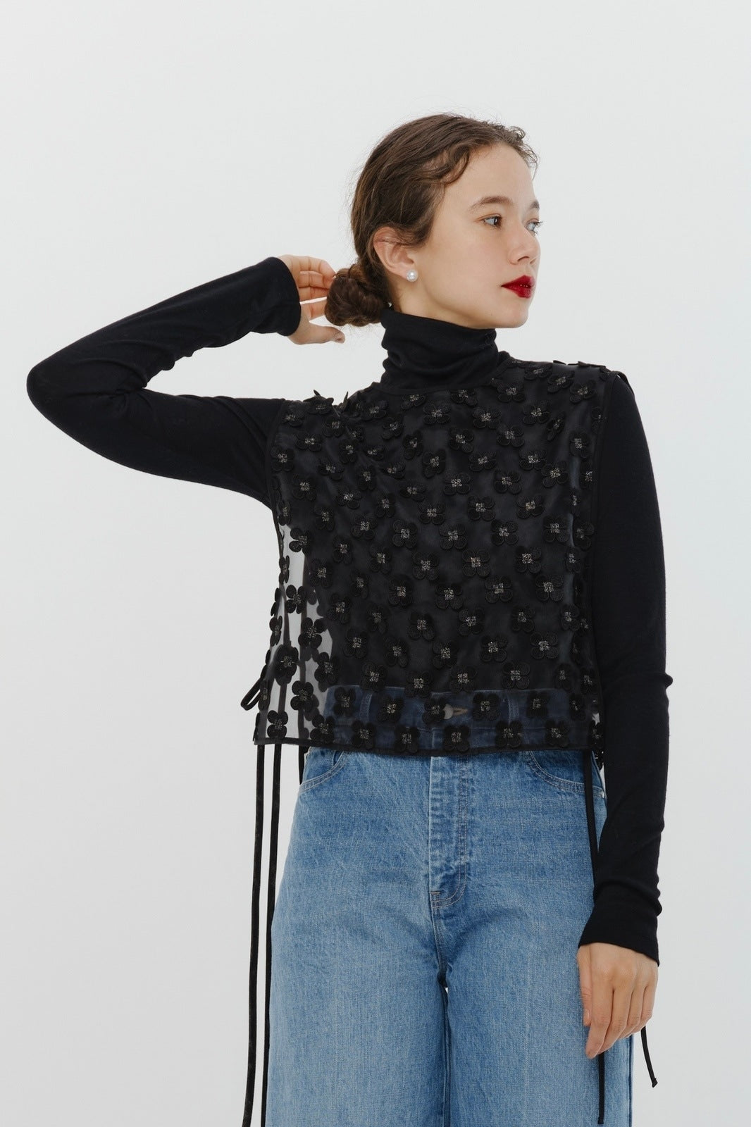 The gilet has a straight, relaxed silhouette that creates a casually elegant, feminine look. It pairs well not only with high-neck knits and shirts but also with simple cut-and-sew tops or T-shirts, making it wearable across multiple seasons. It's a piece that adds a light and airy touch to your styling. It is also recommended as a set with the matching skirt made from the same fabric.