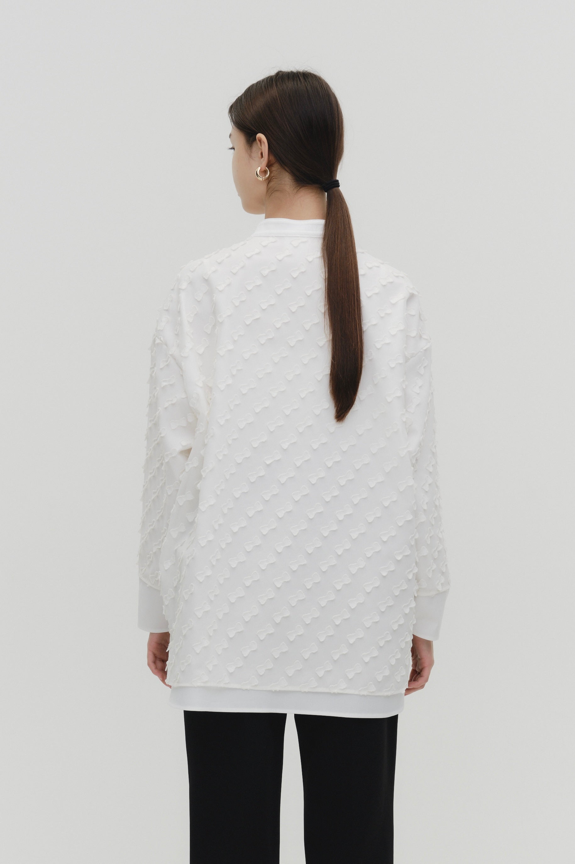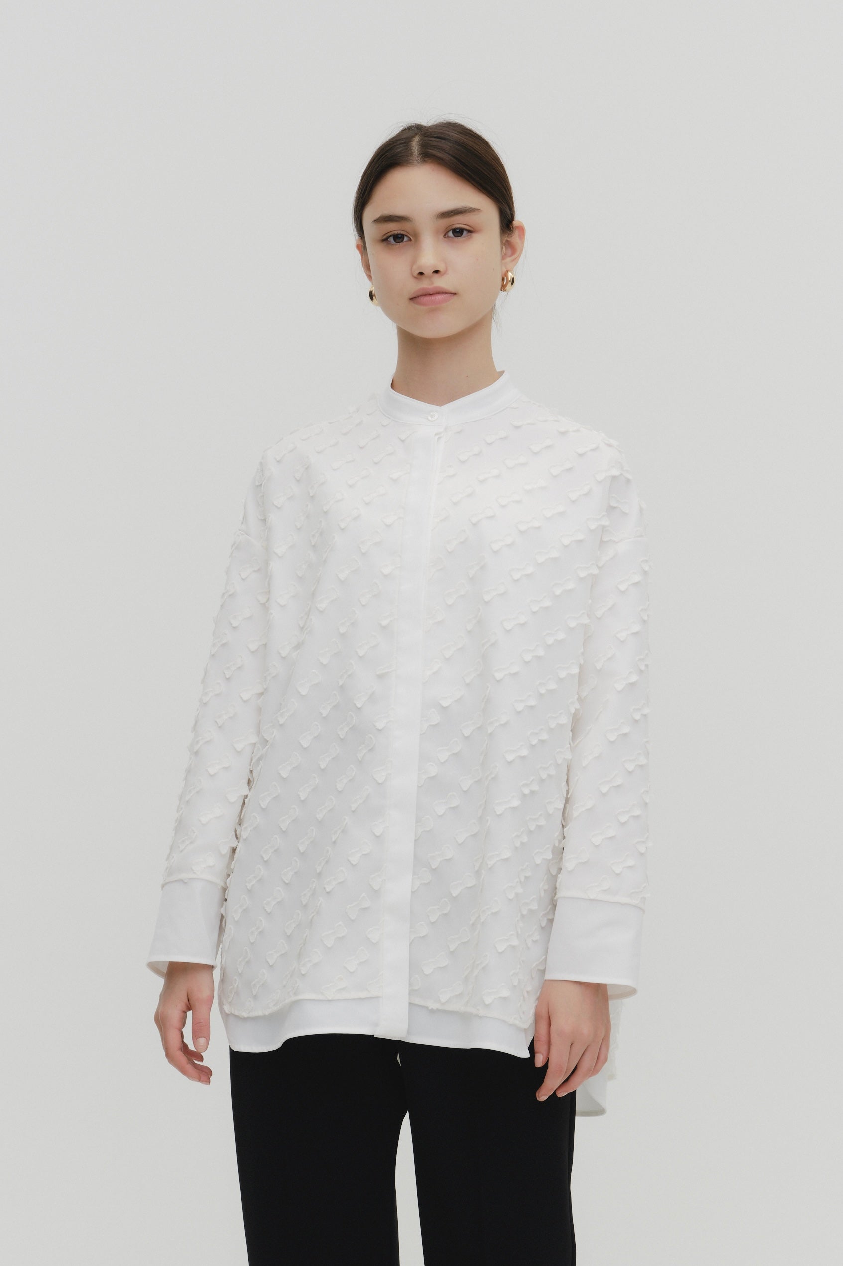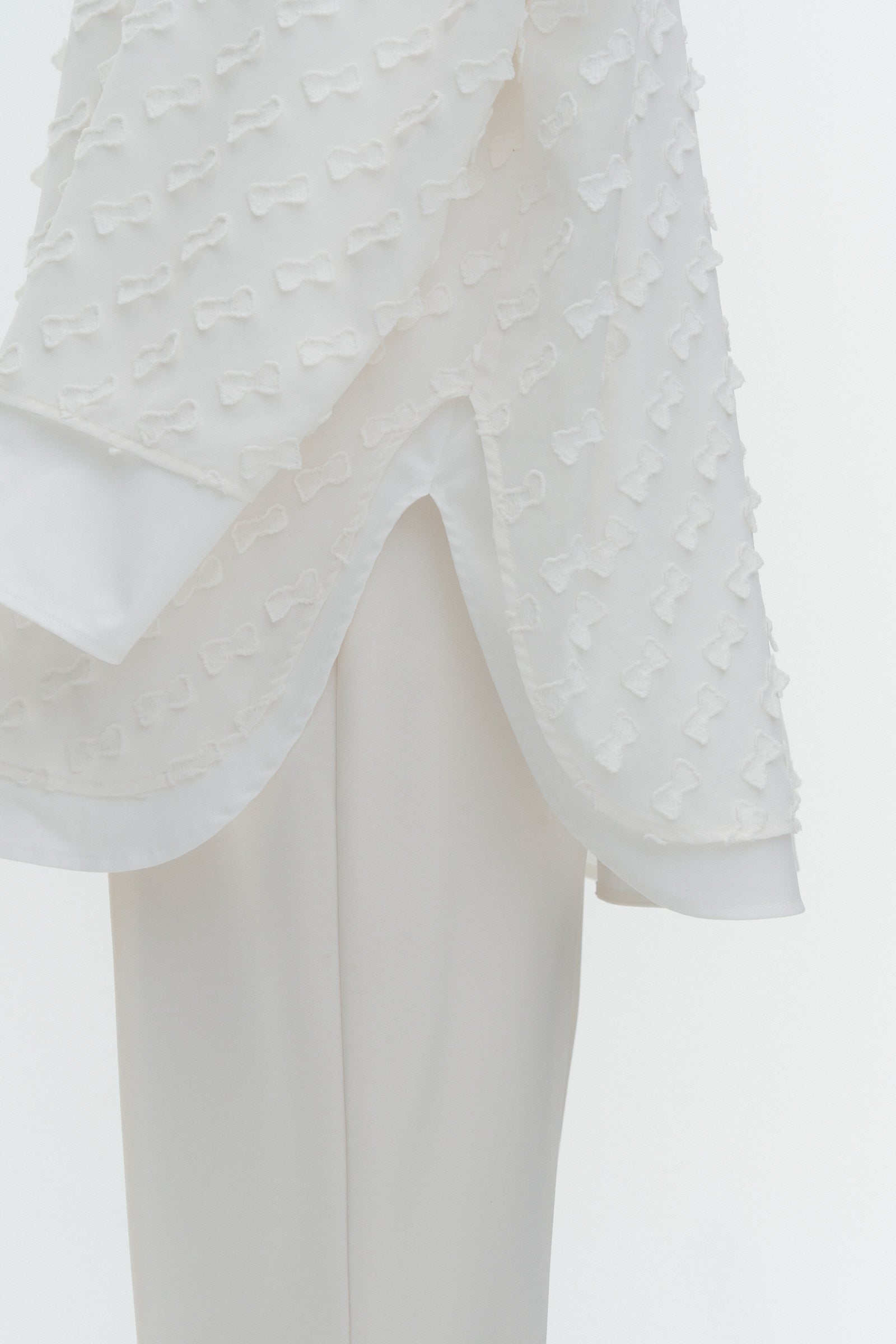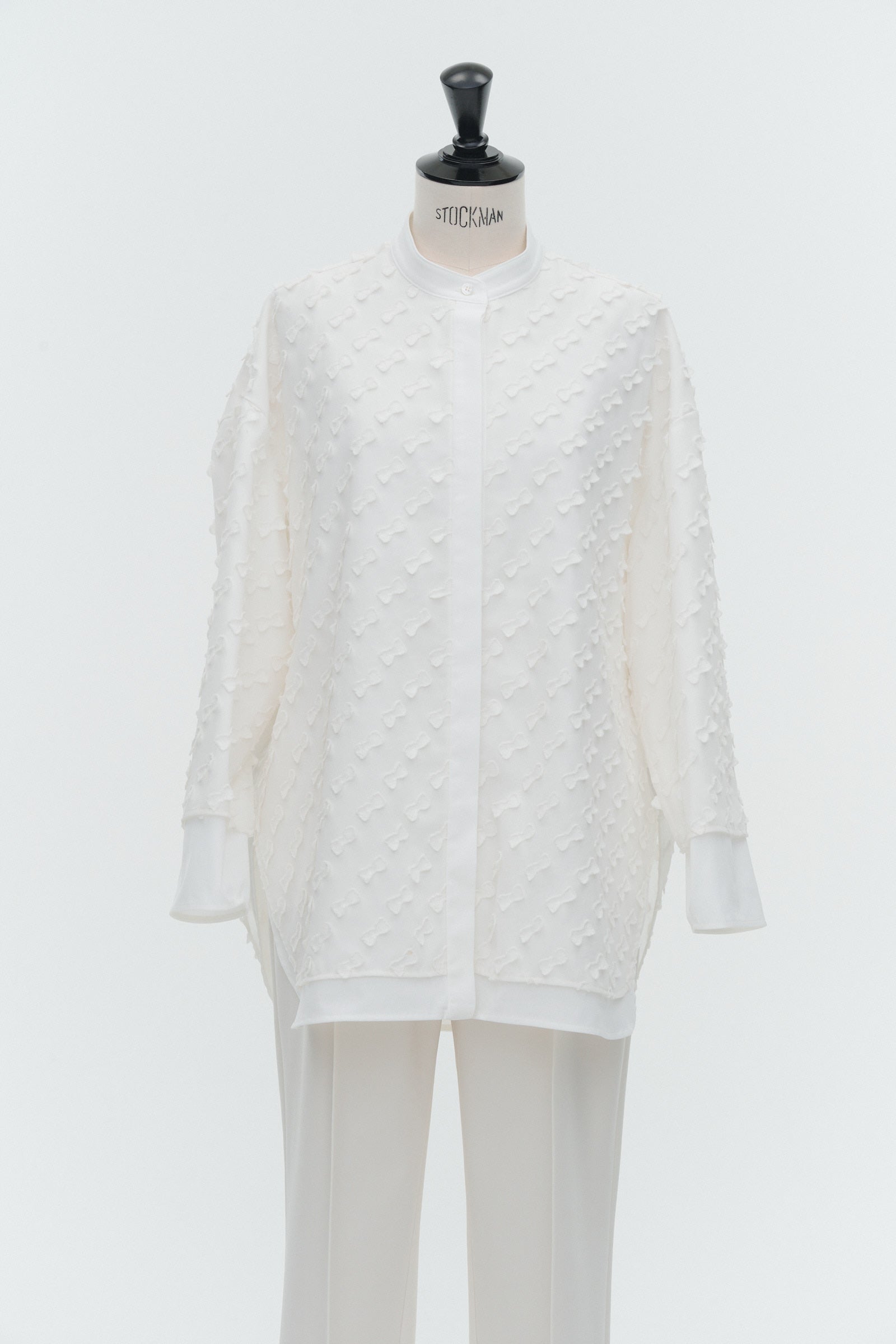 Description (EN): This elegant layered blouse features a translucent jacquard with a ribbon motif and a soft, lightweight outer fabric. The inner cotton-touch layer offers stretch and comfort. Its band collar and long hemline create a refined silhouette, while side slits and a high-low hem add a graceful flow, perfect for sophisticated styling.