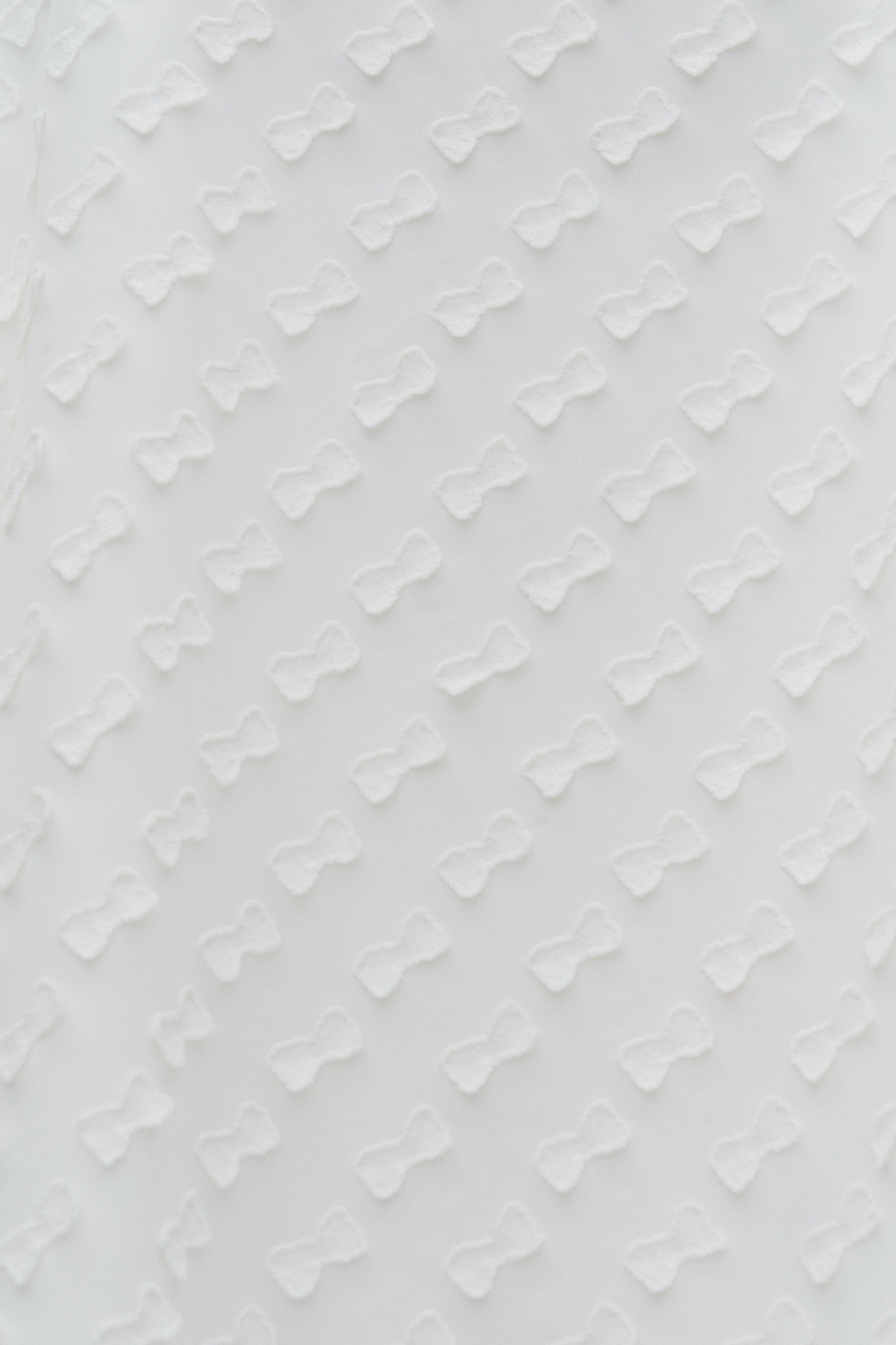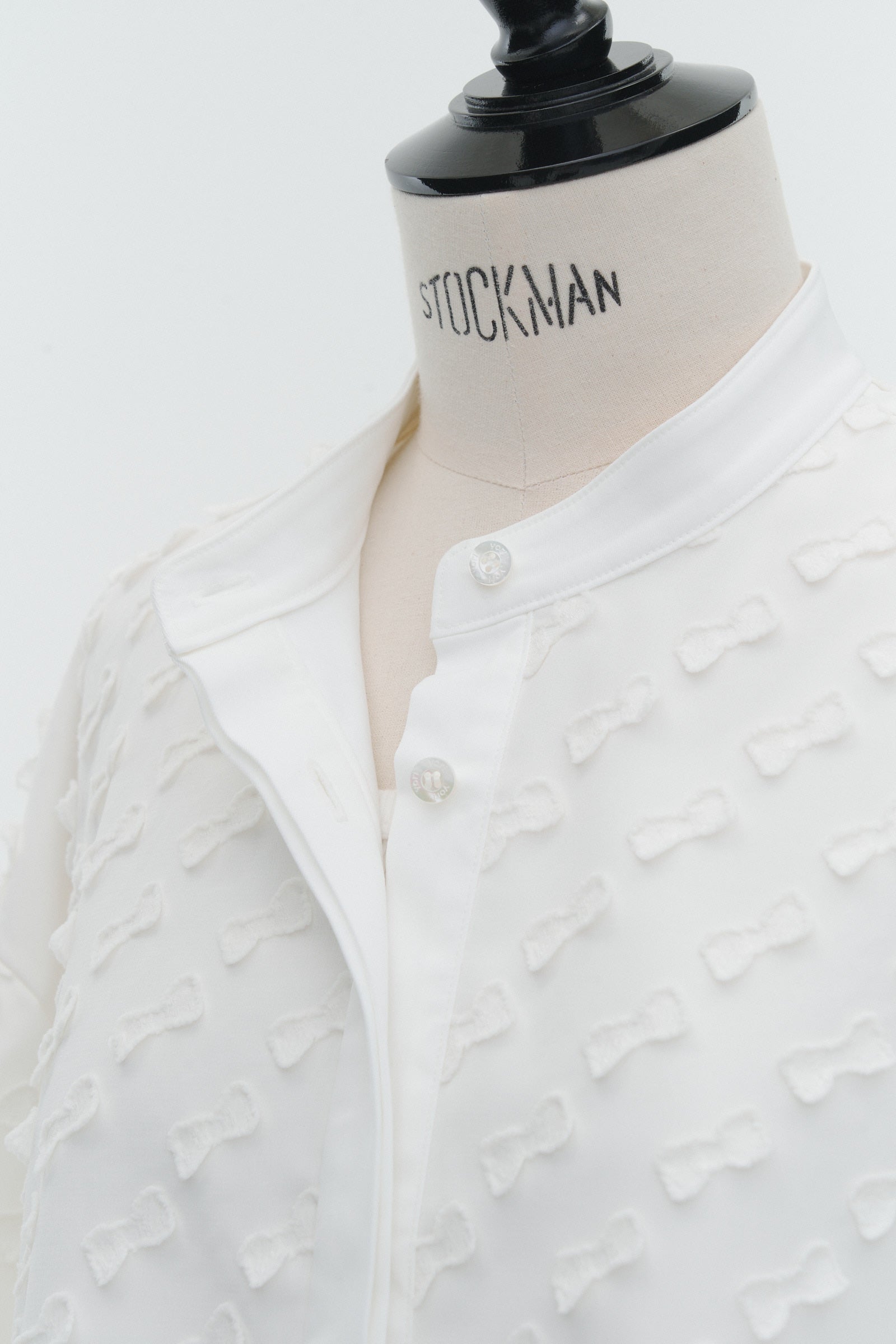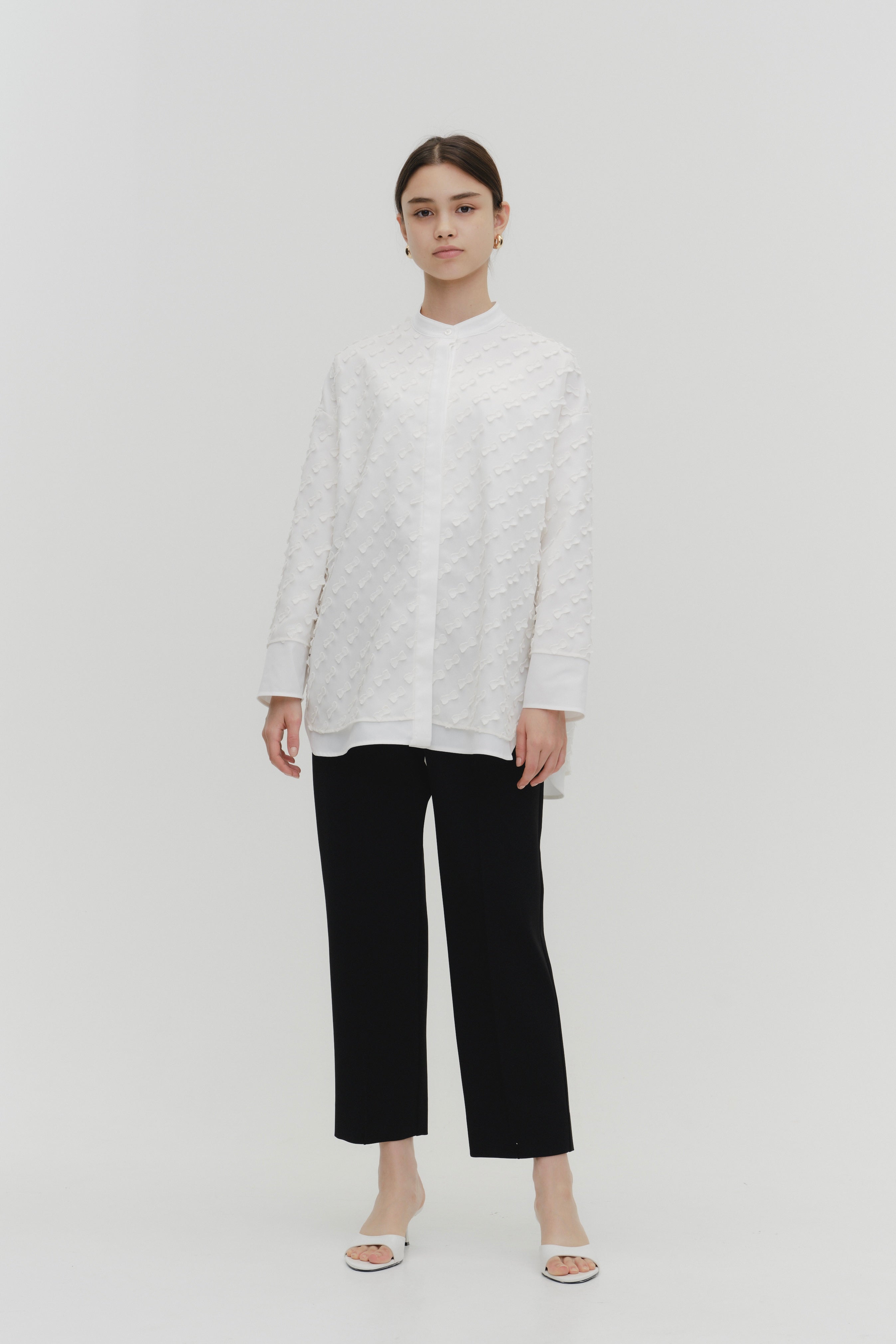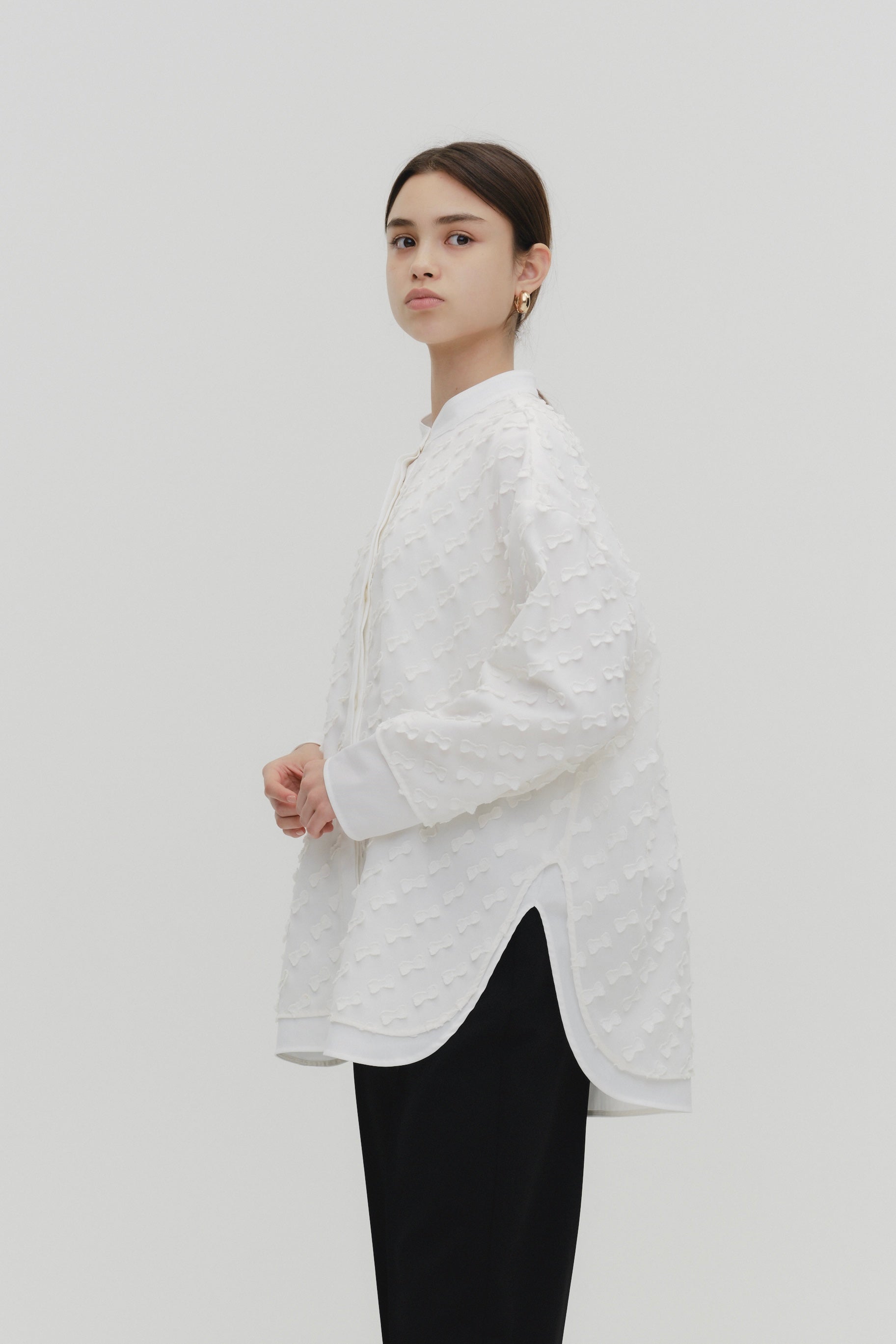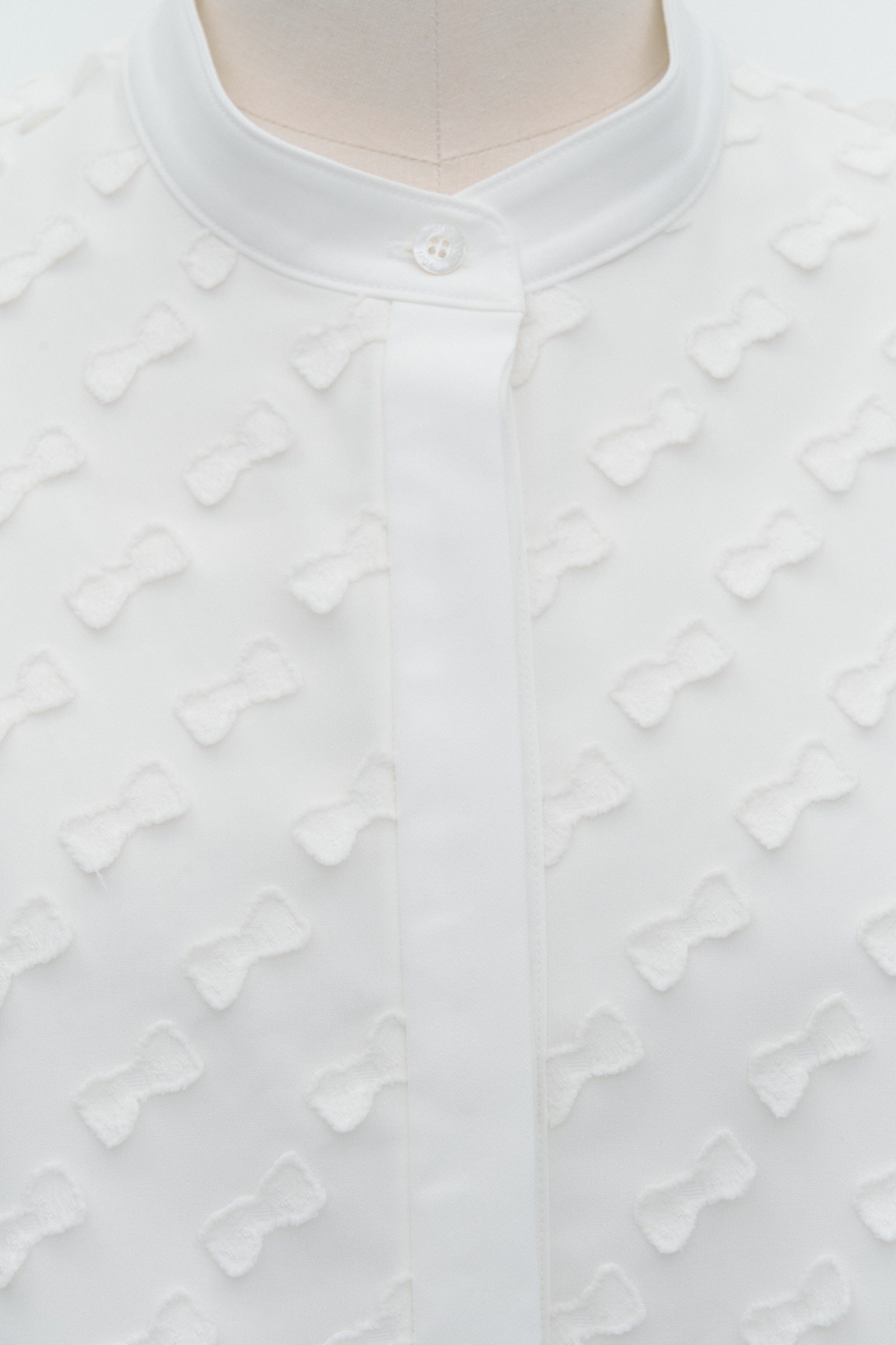 Description (EN): This elegant layered blouse features a translucent jacquard with a ribbon motif and a soft, lightweight outer fabric. The inner cotton-touch layer offers stretch and comfort. Its band collar and long hemline create a refined silhouette, while side slits and a high-low hem add a graceful flow, perfect for sophisticated styling.