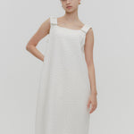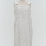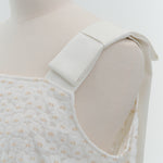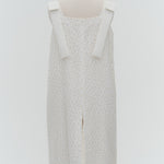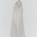 Description (EN): This mini dress is made from lightweight, sheer "shirocon" jacquard fabric with a soft, natural drape. It features elegant shoulder ribbons and a slightly flared silhouette for a refined look. A side zipper ensures easy wear, and a back slit allows it to be styled as a tunic over pants. It pairs perfectly with the chamomile series for a coordinated outfit.