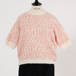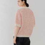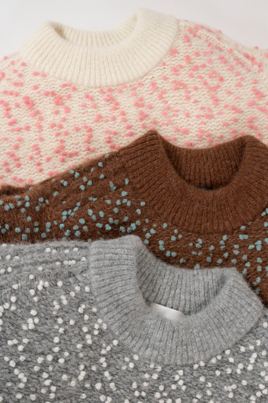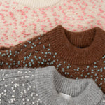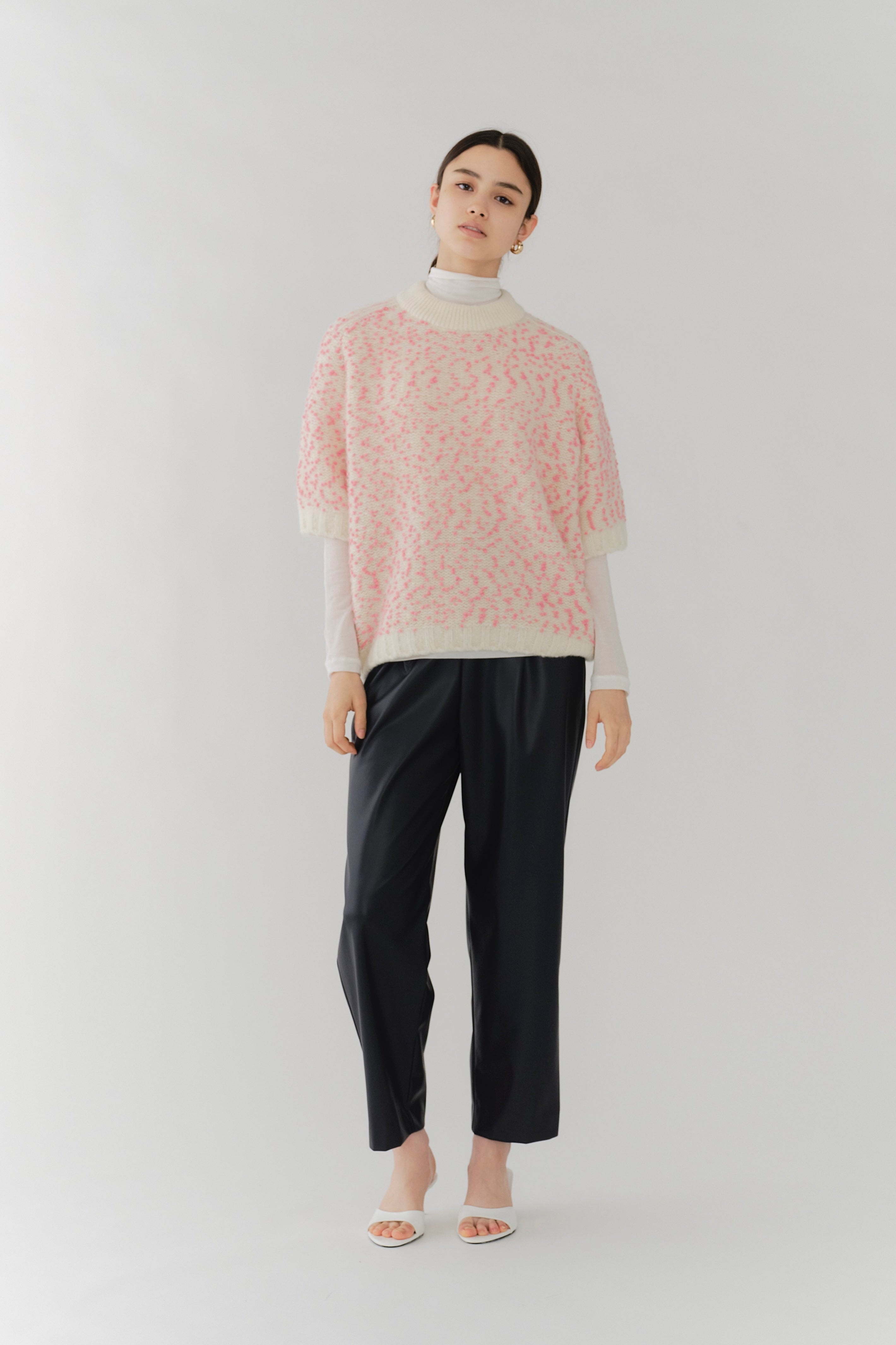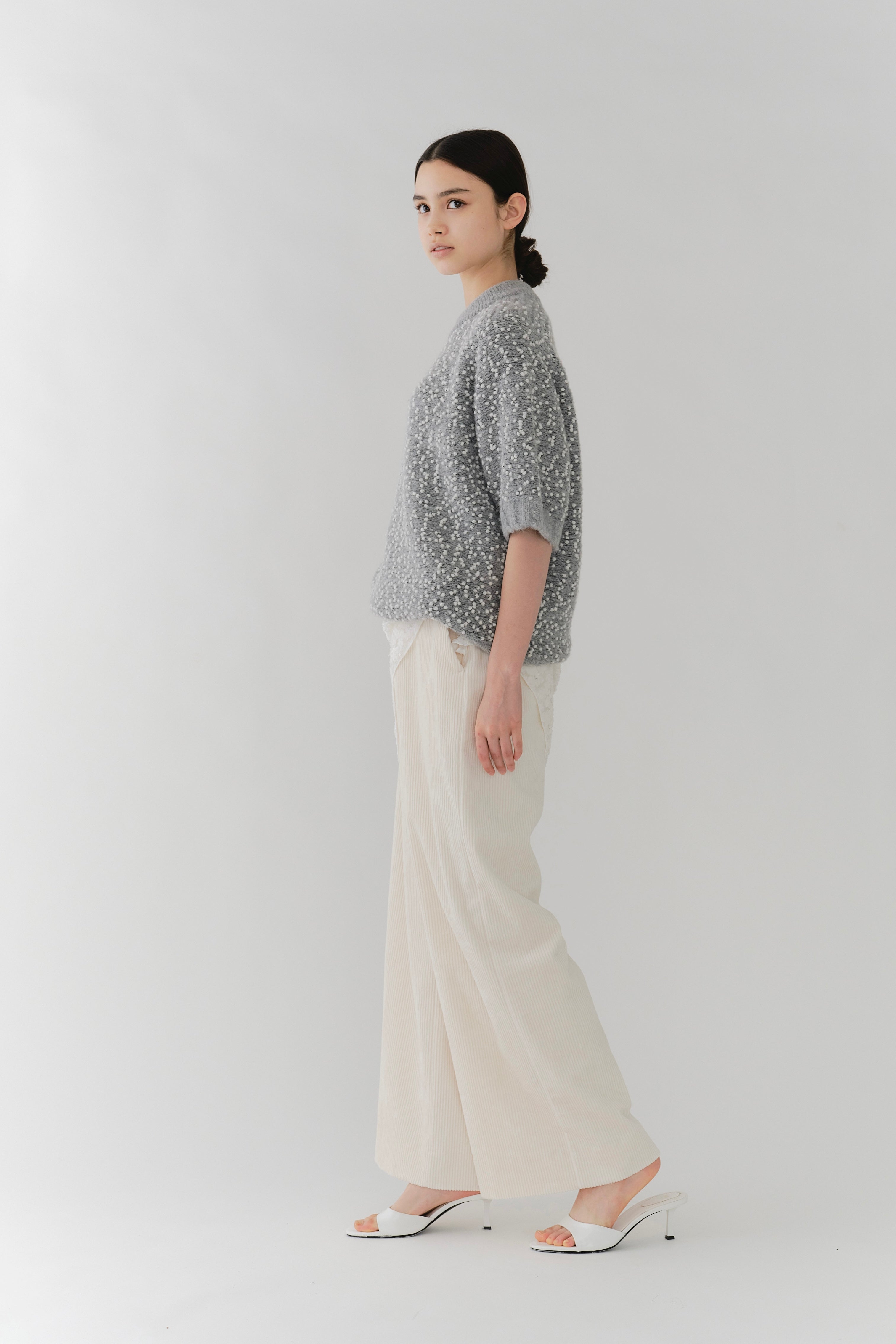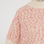 It is a mixed knit adorned with colorful wool thread dots, evoking the playful image of "Popping Shower" ice cream. By combining wool yarns with varying nap lengths, we achieved a soft, texturally rich and expressive knit fabric.