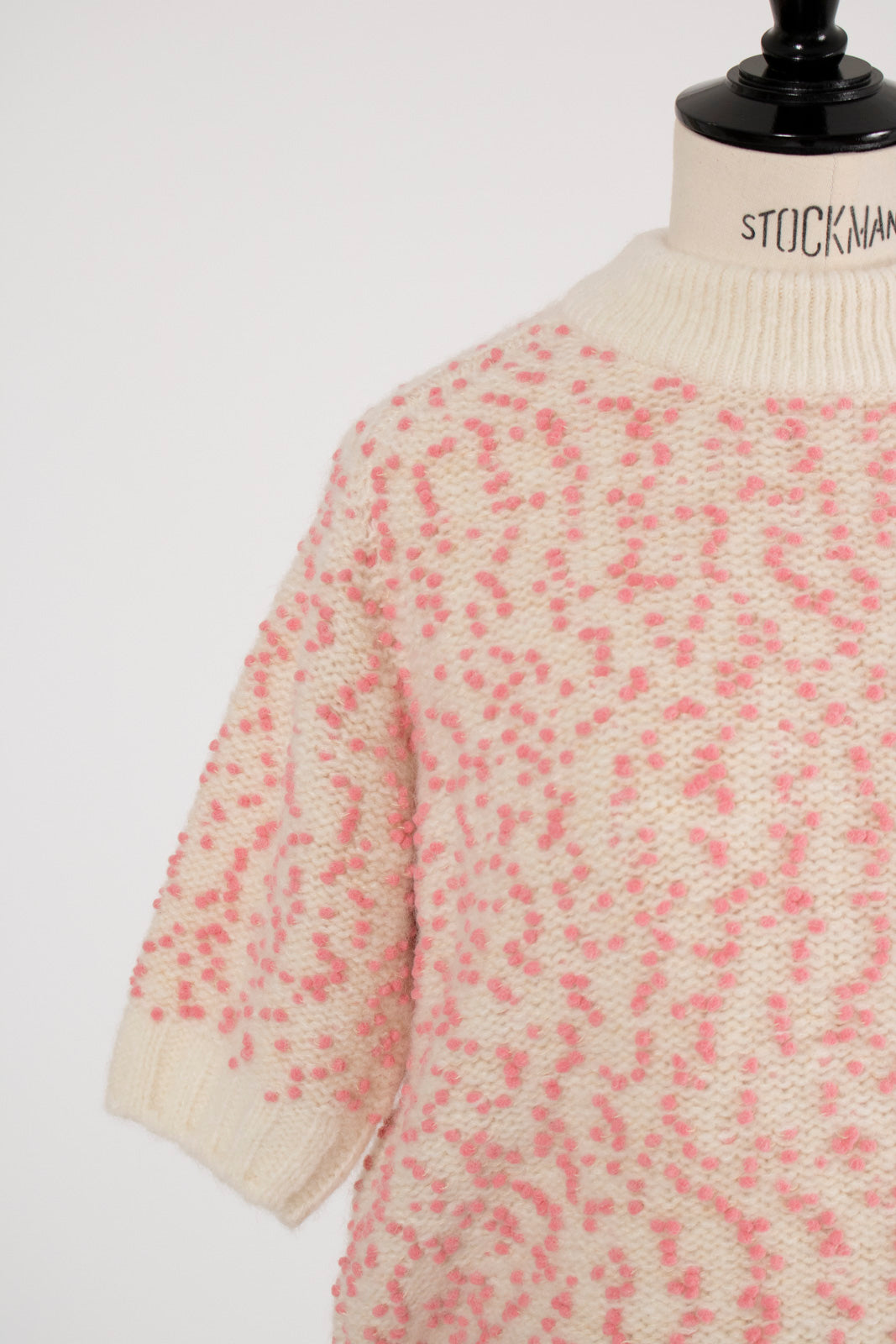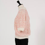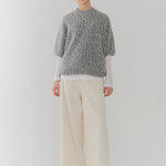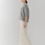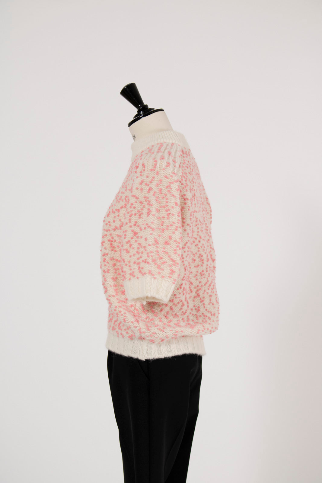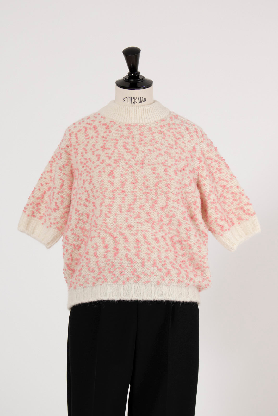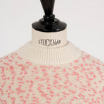 It is a mixed knit adorned with colorful wool thread dots, evoking the playful image of "Popping Shower" ice cream. By combining wool yarns with varying nap lengths, we achieved a soft, texturally rich and expressive knit fabric.