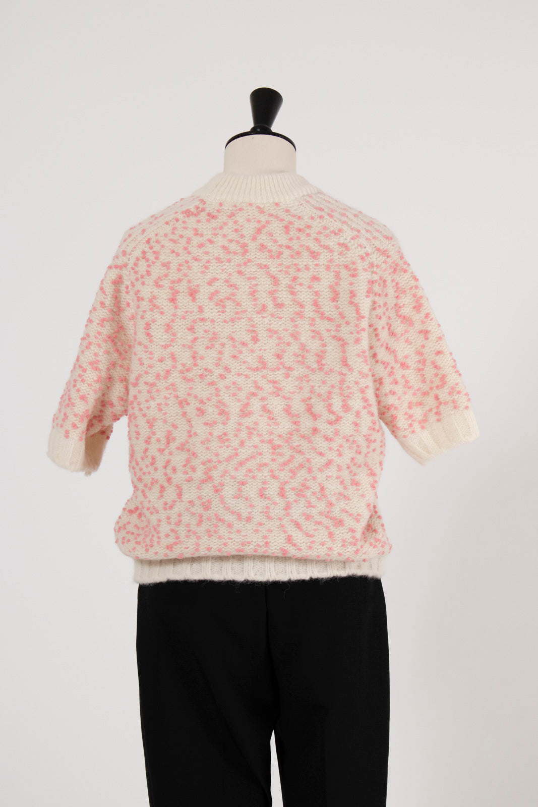 It features a classic crew neck and a moderately relaxed short sleeve length. With its elegant color palette and delicate details, this piece adds a touch of warmth and playfulness to your winter styling.