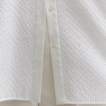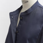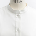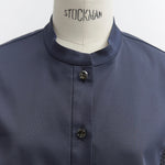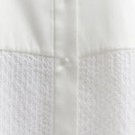 Beschreibung (DE): Diese elegante Bluse vereint texturierten Stoff mit glänzendem Satin, hervorgehoben durch schimmernde runde Knöpfe und fixierte doppelte Bandmanschetten. Der taillierte Ausschnitt kontrastiert wunderbar mit einer voluminösen Silhouette und kreiert ein gepflegtes Erscheinungsbild. Um die Form der Bandmanschetten zu bewahren, behandeln Sie sie vorsichtig. Ideal in Kombination mit schmalen oder fließenden Hosen für ein schickes, harmonisches Ensemble.
