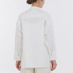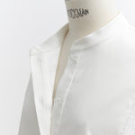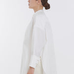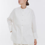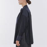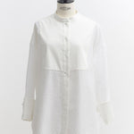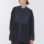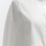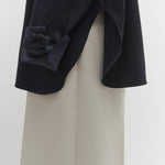 Description (EN): This elegant blouse blends textured fabric with lustrous satin, highlighted by shimmering rounded buttons and fixed double ribbon cuffs. The fitted neckline contrasts beautifully with a voluminous silhouette, creating a polished appearance. To preserve the ribbon cuffs’ form, handle them with care. Ideal when paired with slim or flowing trousers for a chic, harmonious ensemble.