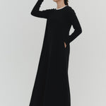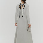 Description (EN): This dress showcases a charming back-open ribbon that brings a fresh, lively touch. Its clean, straight lines offer a sleek, contemporary silhouette, making it a standout long dress. Crafted from soft, three-dimensional ribbed fabric, it provides warmth and comfort from the first wear. The front is tailored for a flattering fit, featuring a neat neckline that adds sophistication. Contrasting ribbed details enhance its unique design. Balancing casual ease with timeless elegance, the detachable back ribbon allows for versatile looks, while convenient side pockets add practical functionality.