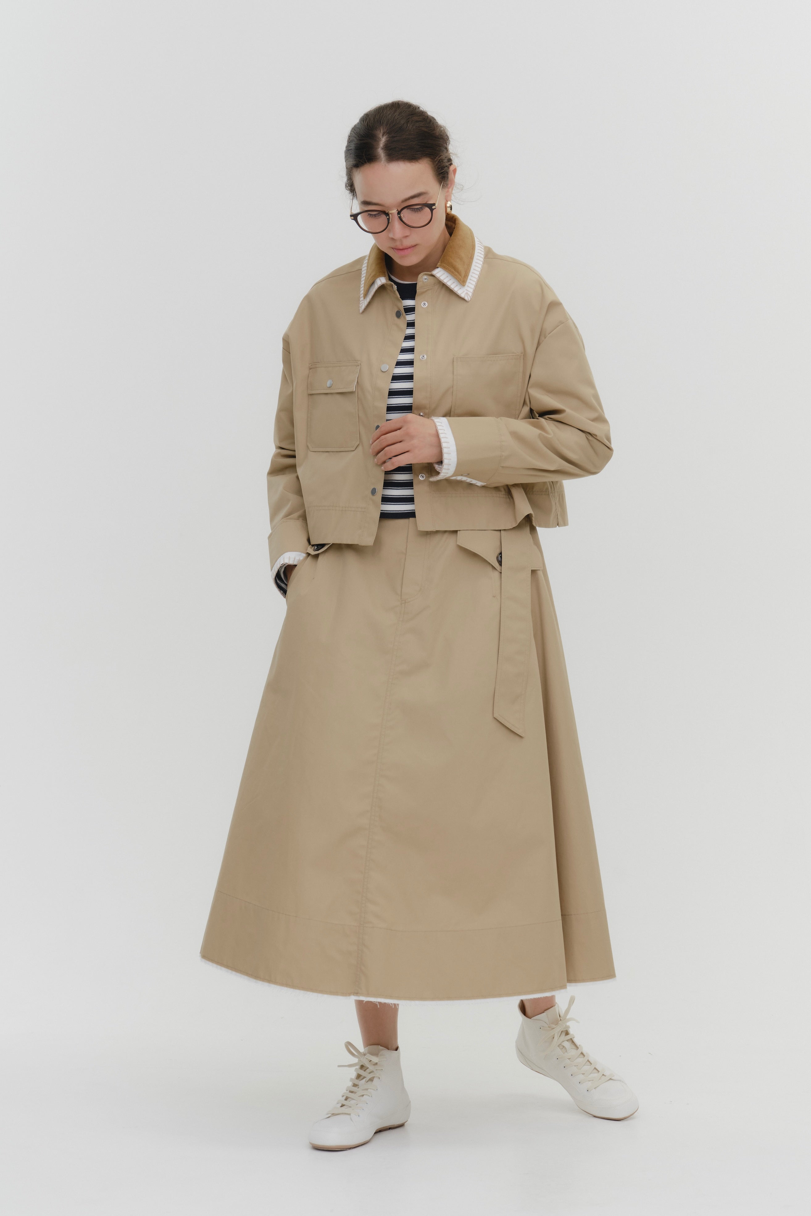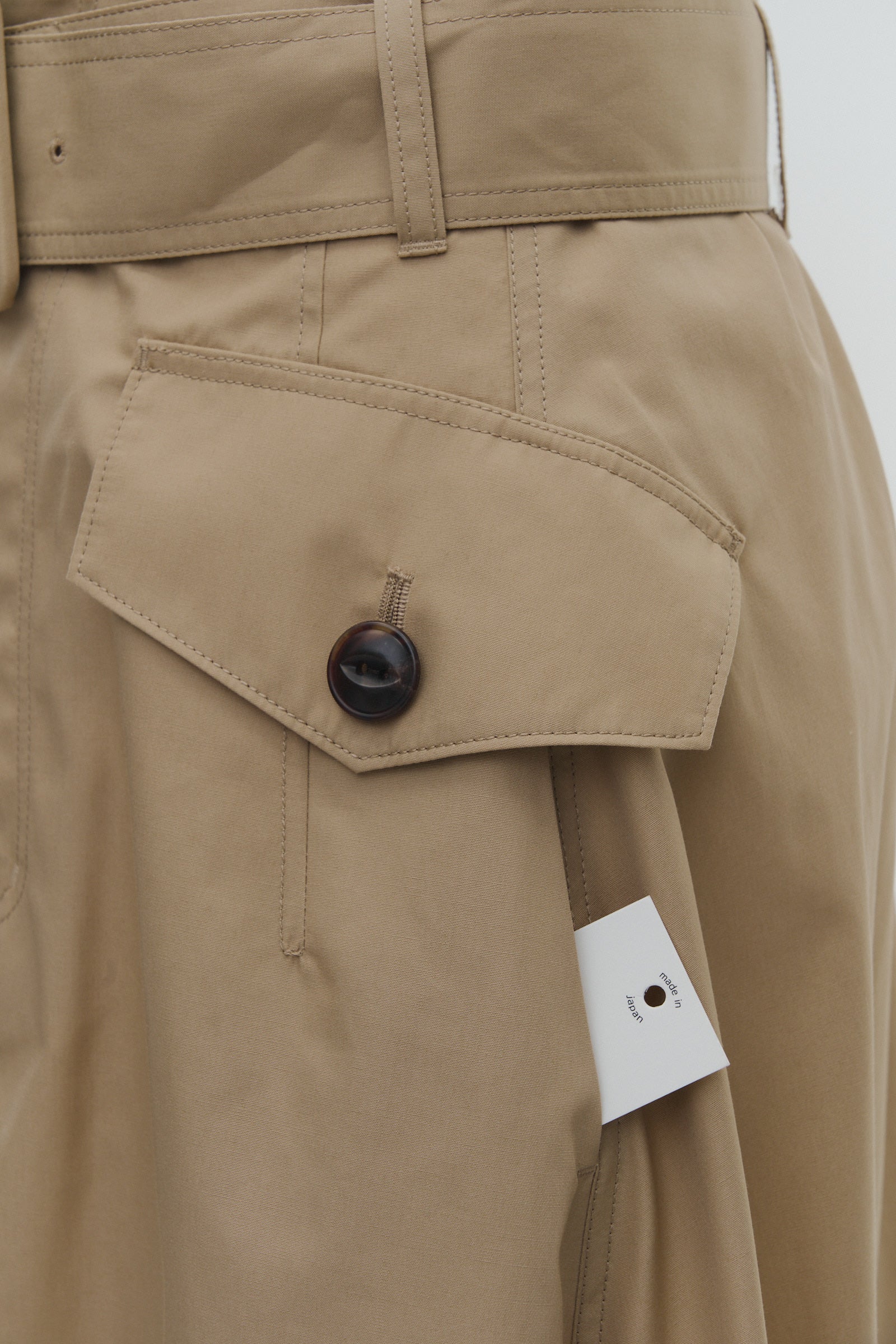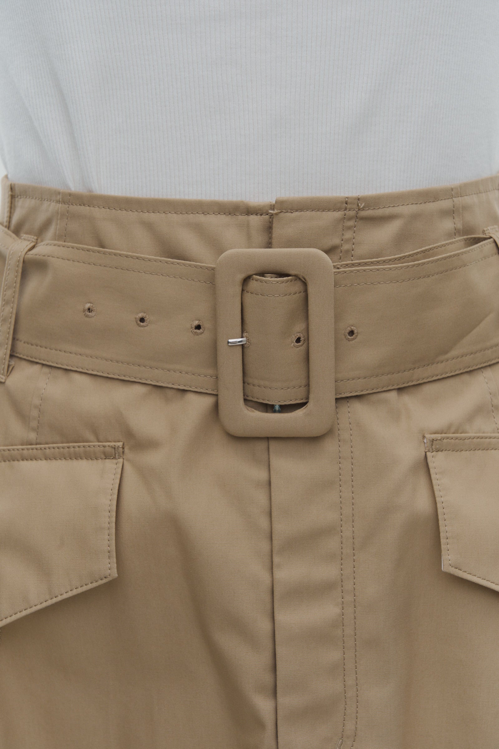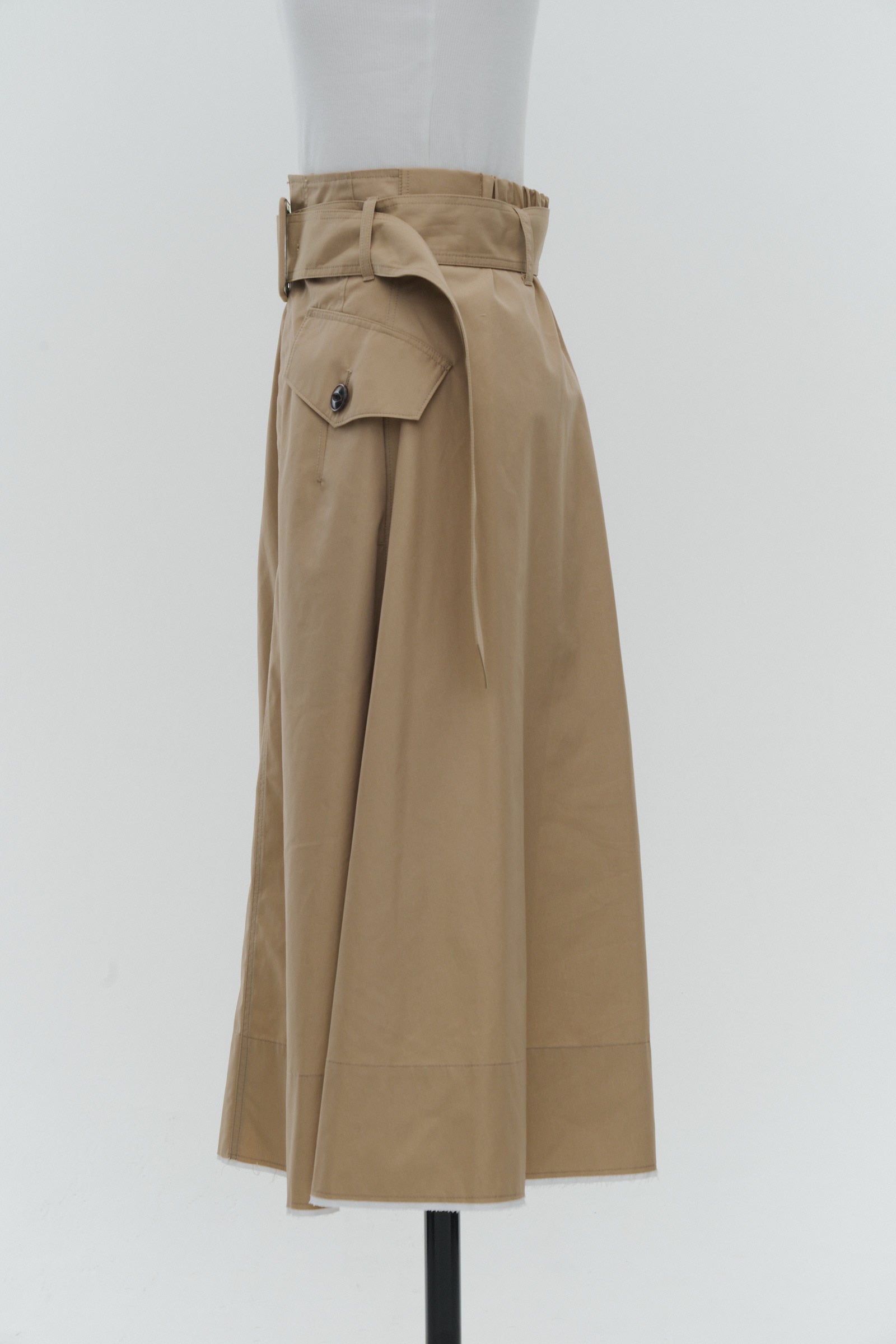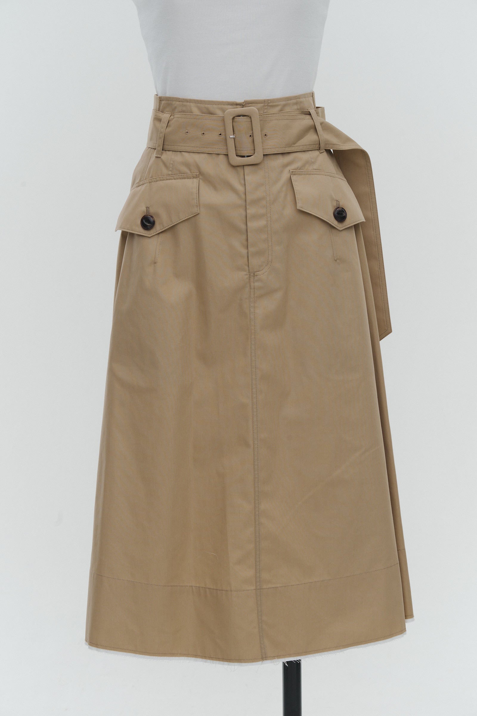 Description (EN): A standout skirt featuring a striking wide belt and three-dimensional flap pockets. Crafted from lightweight, high-density chino fabric with twisted yarn for a smooth, refined finish, it delivers a polished and sophisticated look. The cinched waist sculpts a flattering silhouette while visually lengthening your legs. Inspired by safari style, its flared design effortlessly complements both casual and feminine outfits, offering endless styling possibilities. A subtle raw-edged contrast fabric at the hem adds a distinctive flair. With a versatile length that pairs beautifully with socks, sneakers, or boots, this skirt is a must-have for any fashion-forward closet.