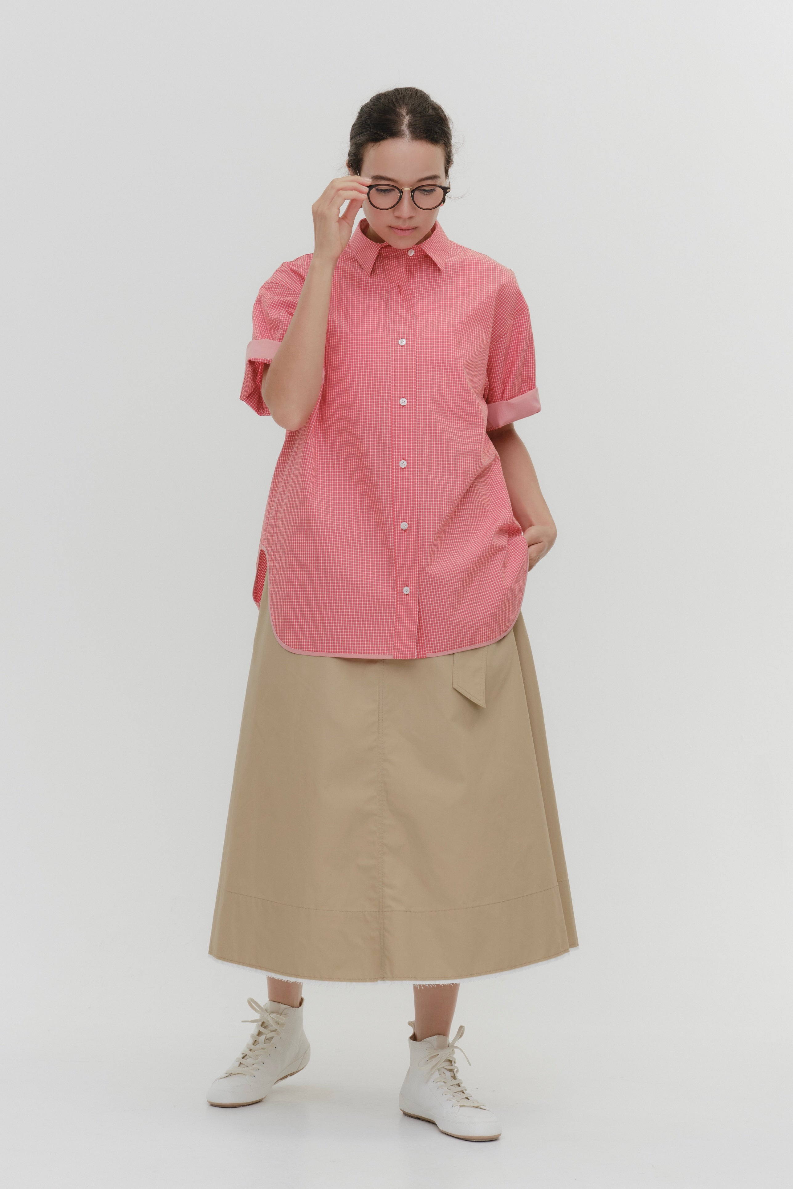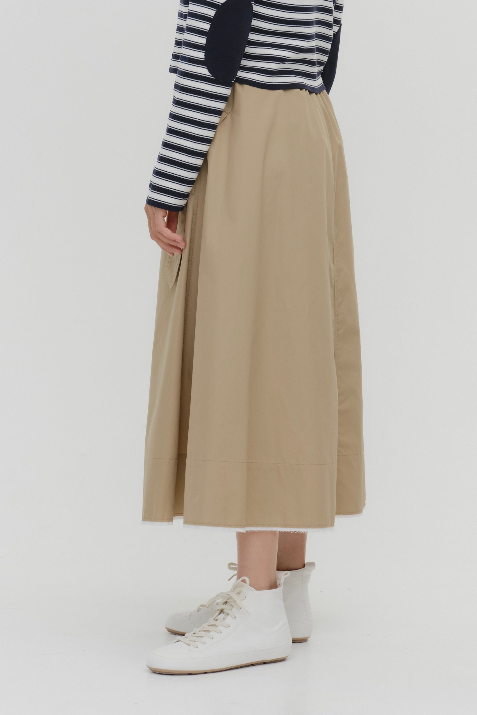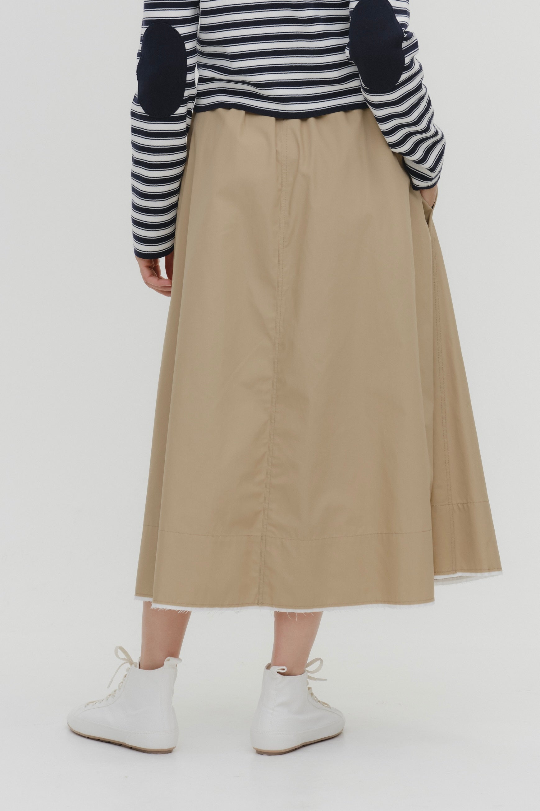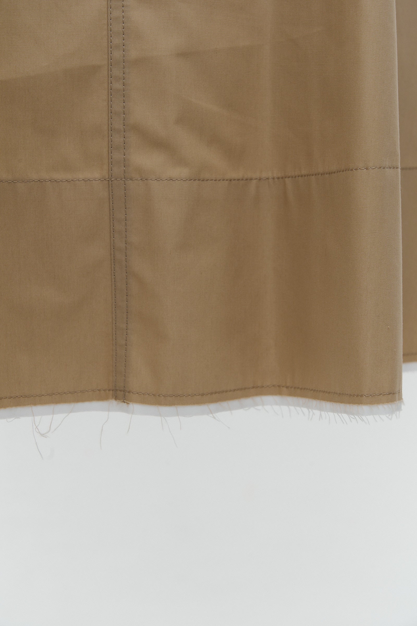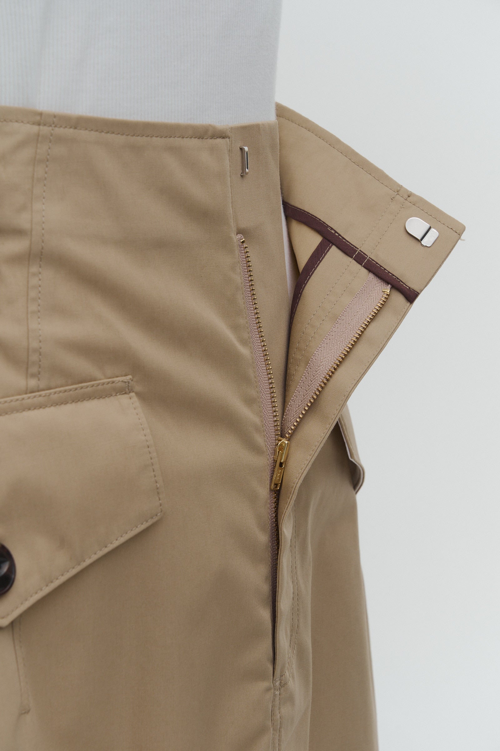 Description (EN): A standout skirt featuring a striking wide belt and three-dimensional flap pockets. Crafted from lightweight, high-density chino fabric with twisted yarn for a smooth, refined finish, it delivers a polished and sophisticated look. The cinched waist sculpts a flattering silhouette while visually lengthening your legs. Inspired by safari style, its flared design effortlessly complements both casual and feminine outfits, offering endless styling possibilities. A subtle raw-edged contrast fabric at the hem adds a distinctive flair. With a versatile length that pairs beautifully with socks, sneakers, or boots, this skirt is a must-have for any fashion-forward closet.