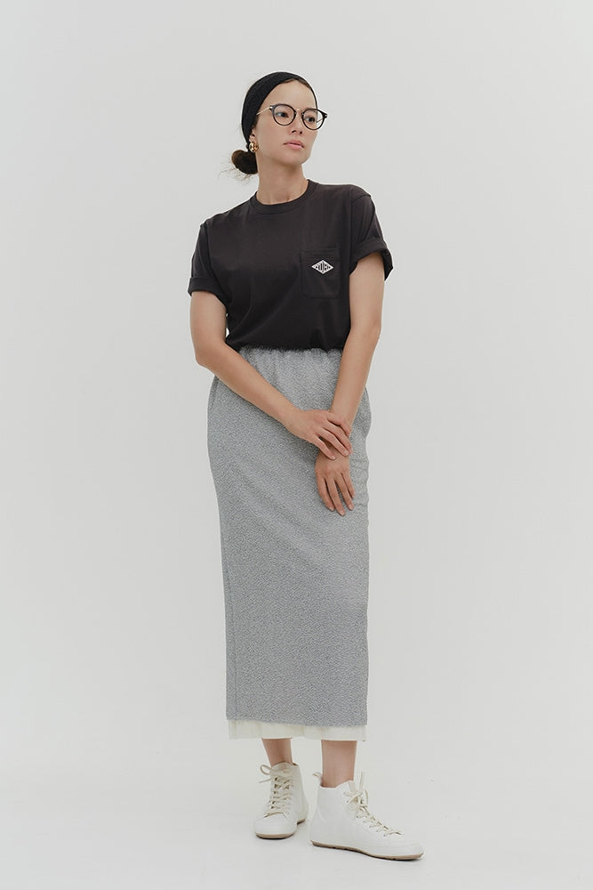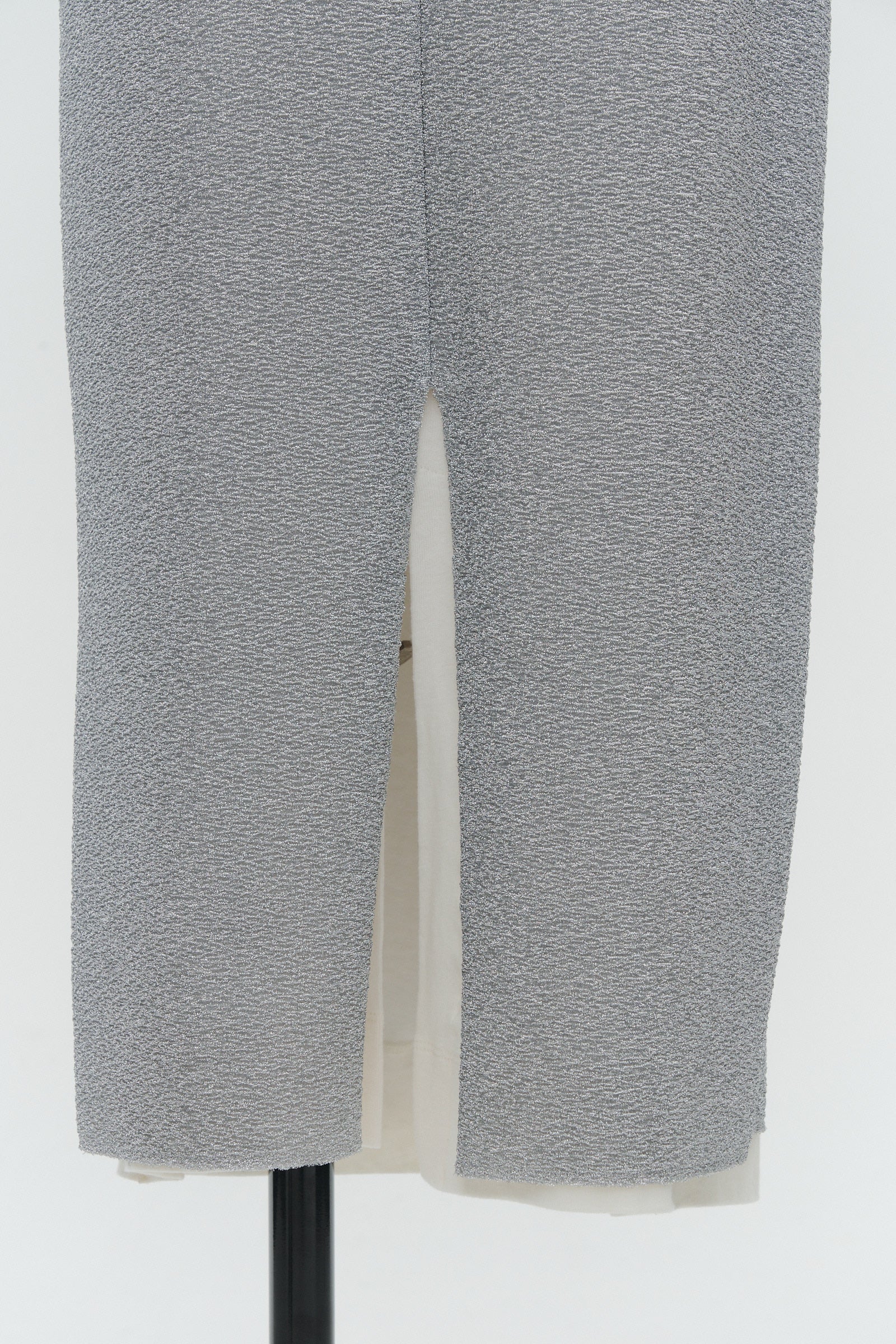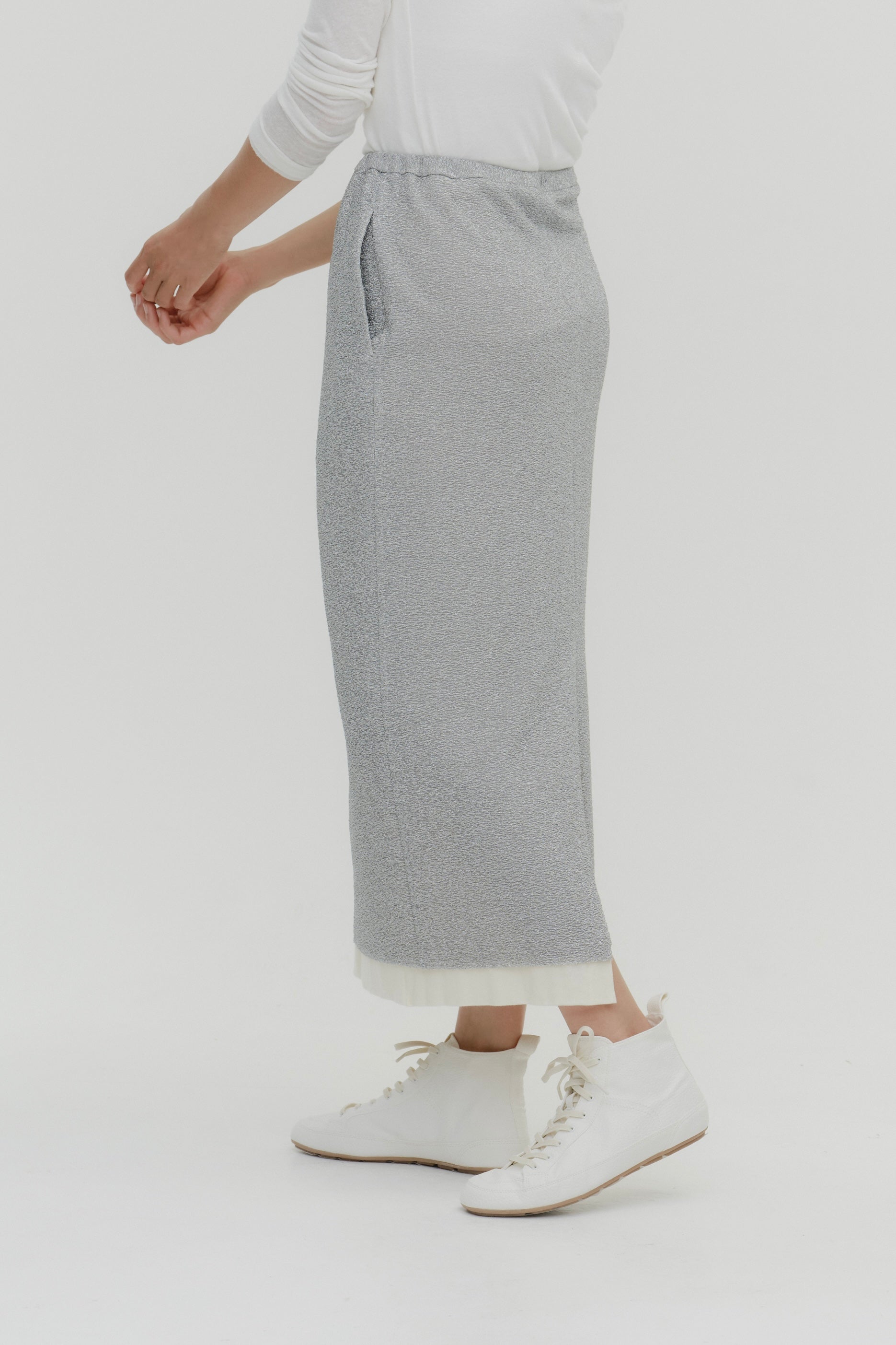 The outer surface features a glitter finish, while the inner side, which touches the skin, is made from soft nylon yarn for added comfort. The fabric, crafted on a jacquard knitting machine, has a textured appearance and offers excellent stretch as a jersey material. The silhouette gently hugs the body, and the knee-covering length creates a classic and feminine balance. A layered look is achieved with a softer jersey fabric peeking out from the hem, providing a comfortable wearing experience. The stretchability unique to jersey fabric, combined with the elastic waistband, ensures exceptional comfort.