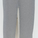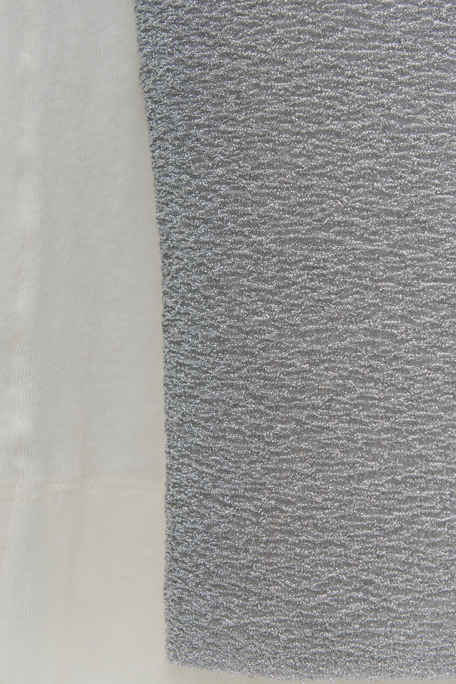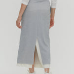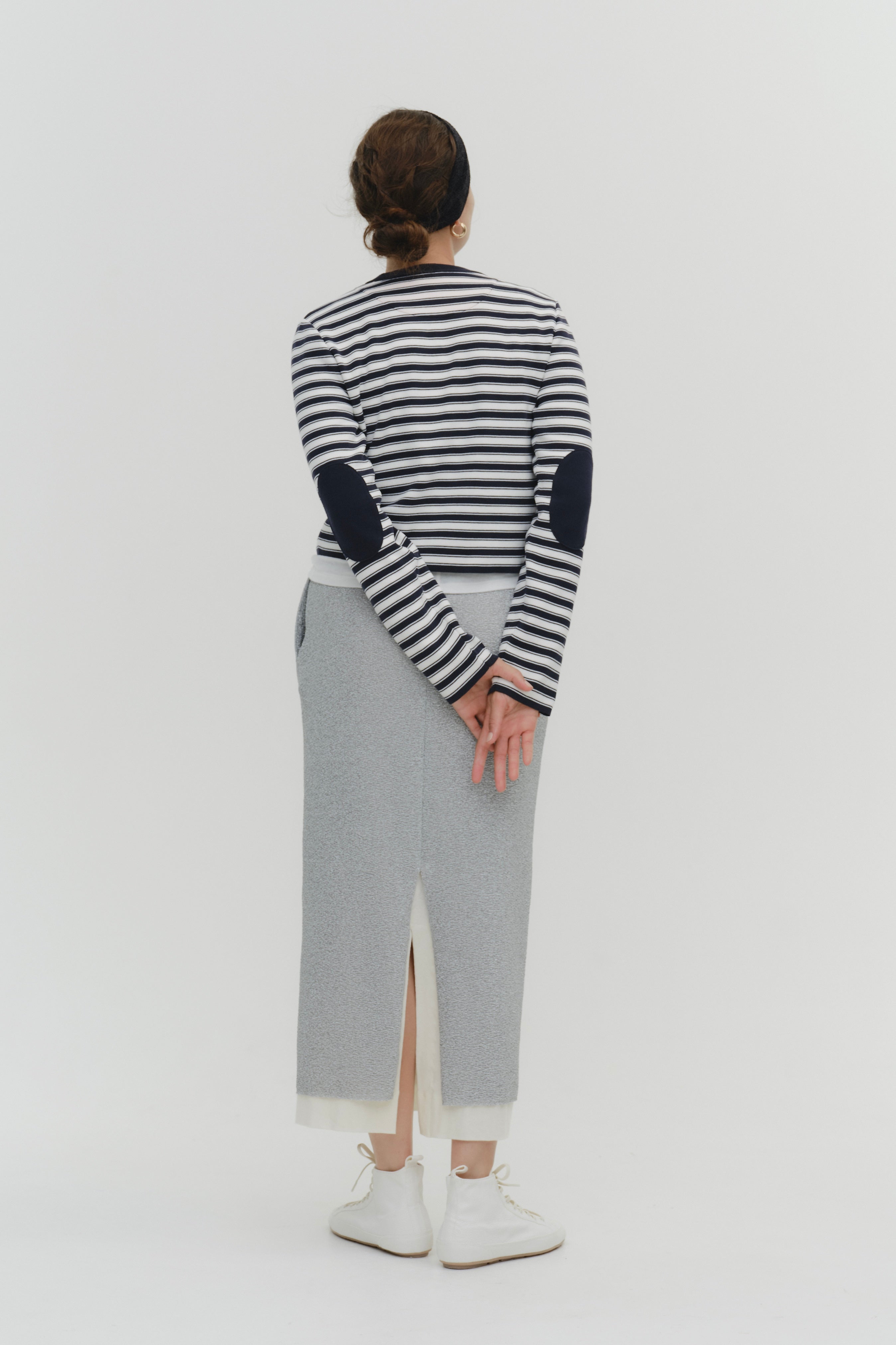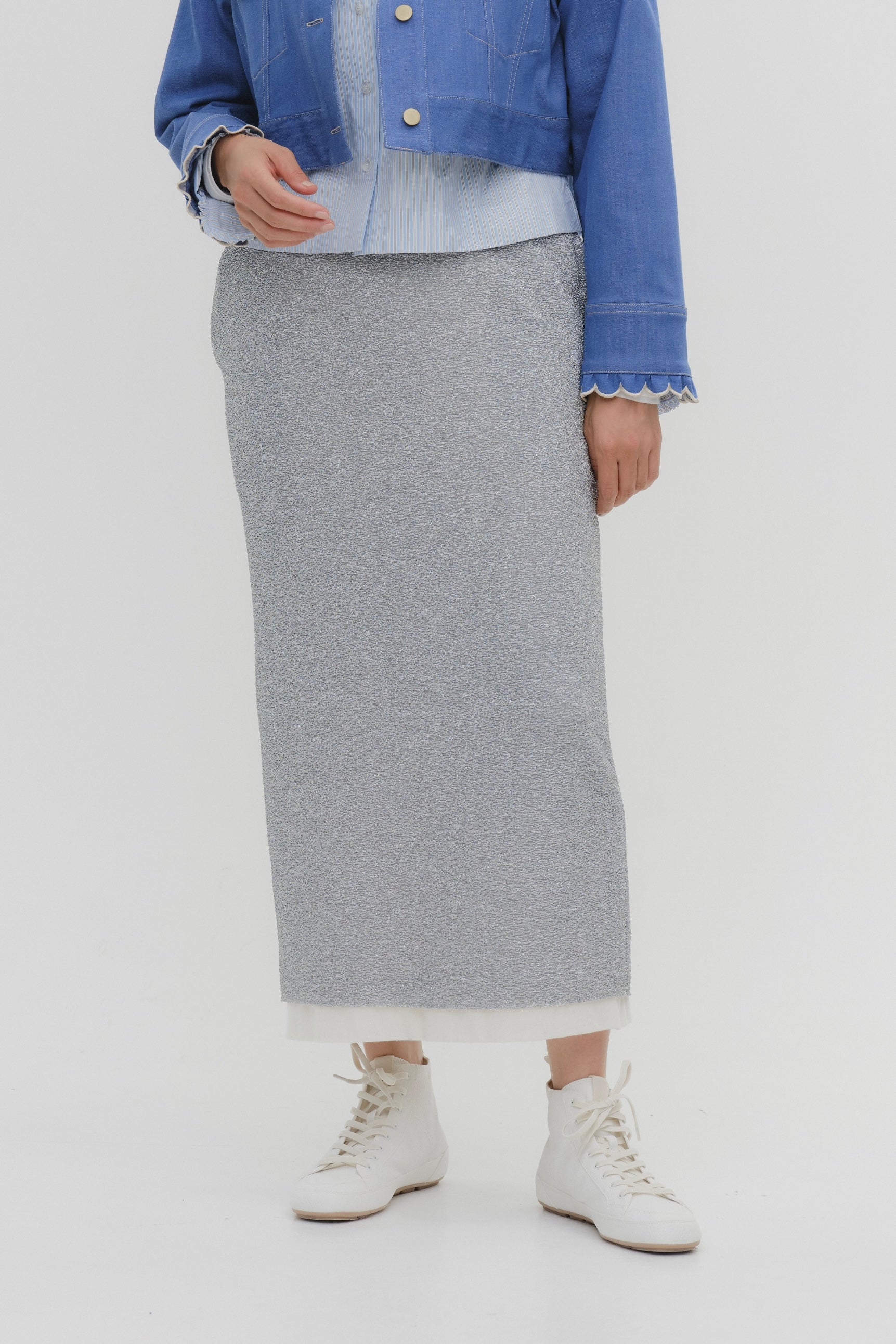 The outer surface features a glitter finish, while the inner side, which touches the skin, is made from soft nylon yarn for added comfort. The fabric, crafted on a jacquard knitting machine, has a textured appearance and offers excellent stretch as a jersey material. The silhouette gently hugs the body, and the knee-covering length creates a classic and feminine balance. A layered look is achieved with a softer jersey fabric peeking out from the hem, providing a comfortable wearing experience. The stretchability unique to jersey fabric, combined with the elastic waistband, ensures exceptional comfort.