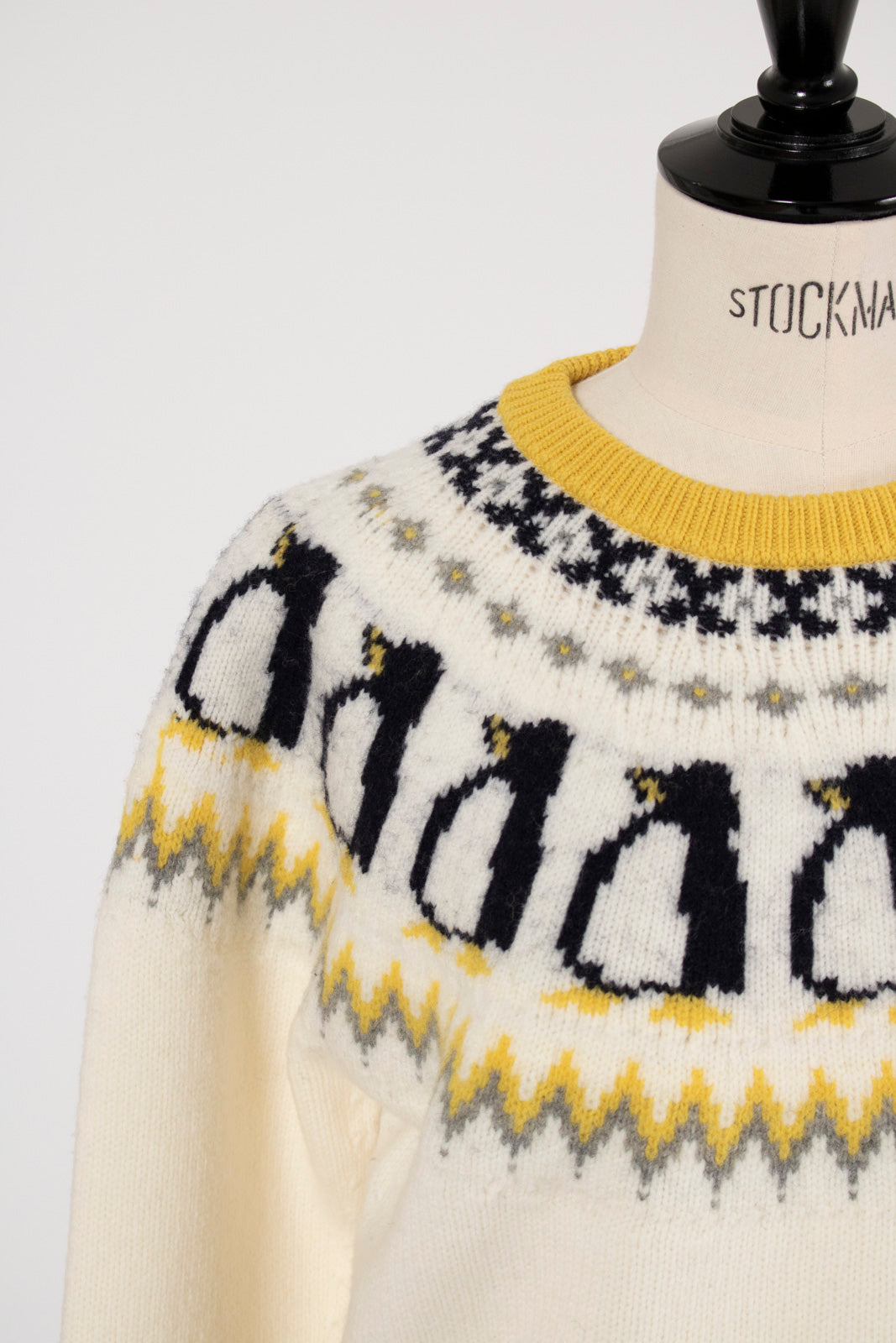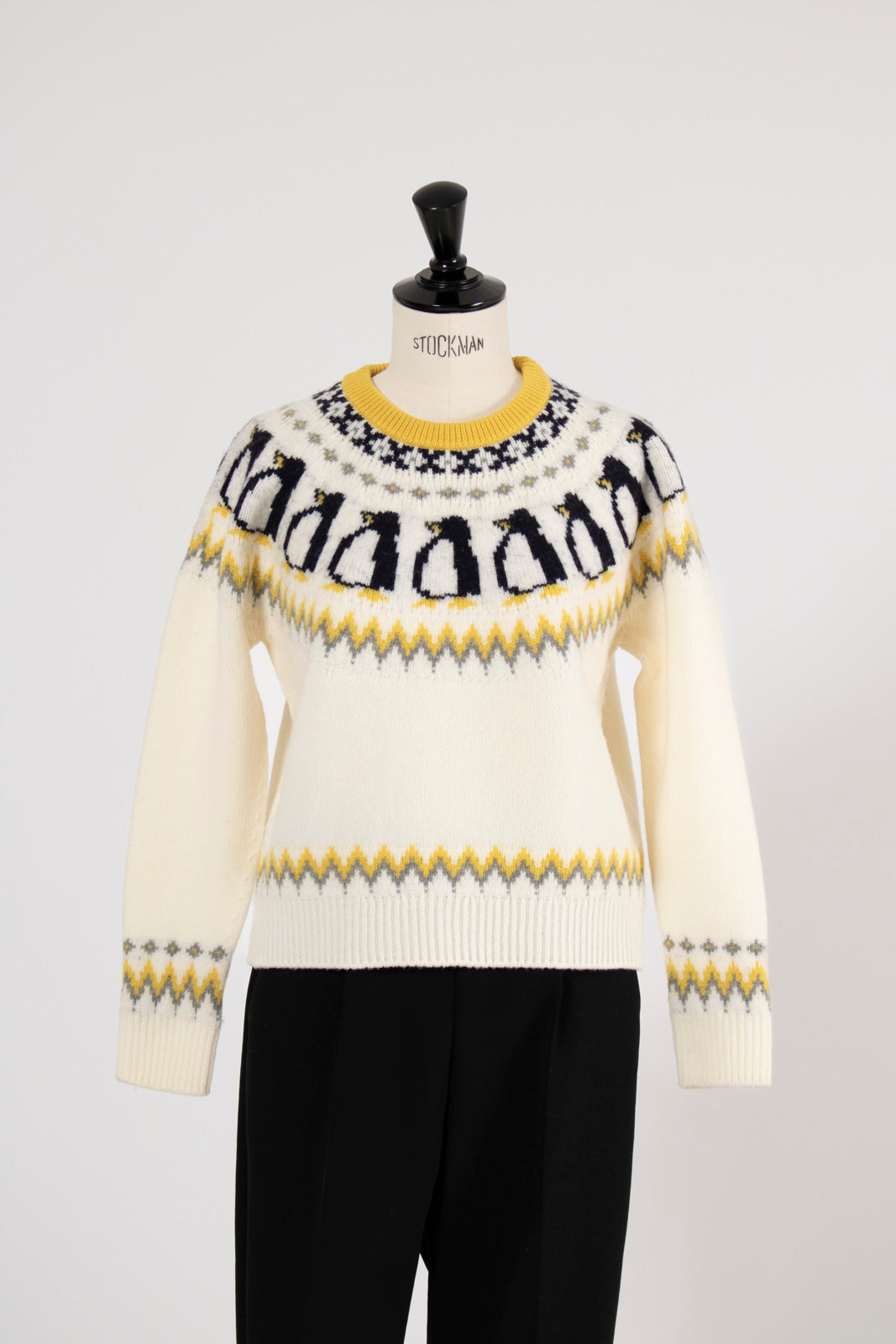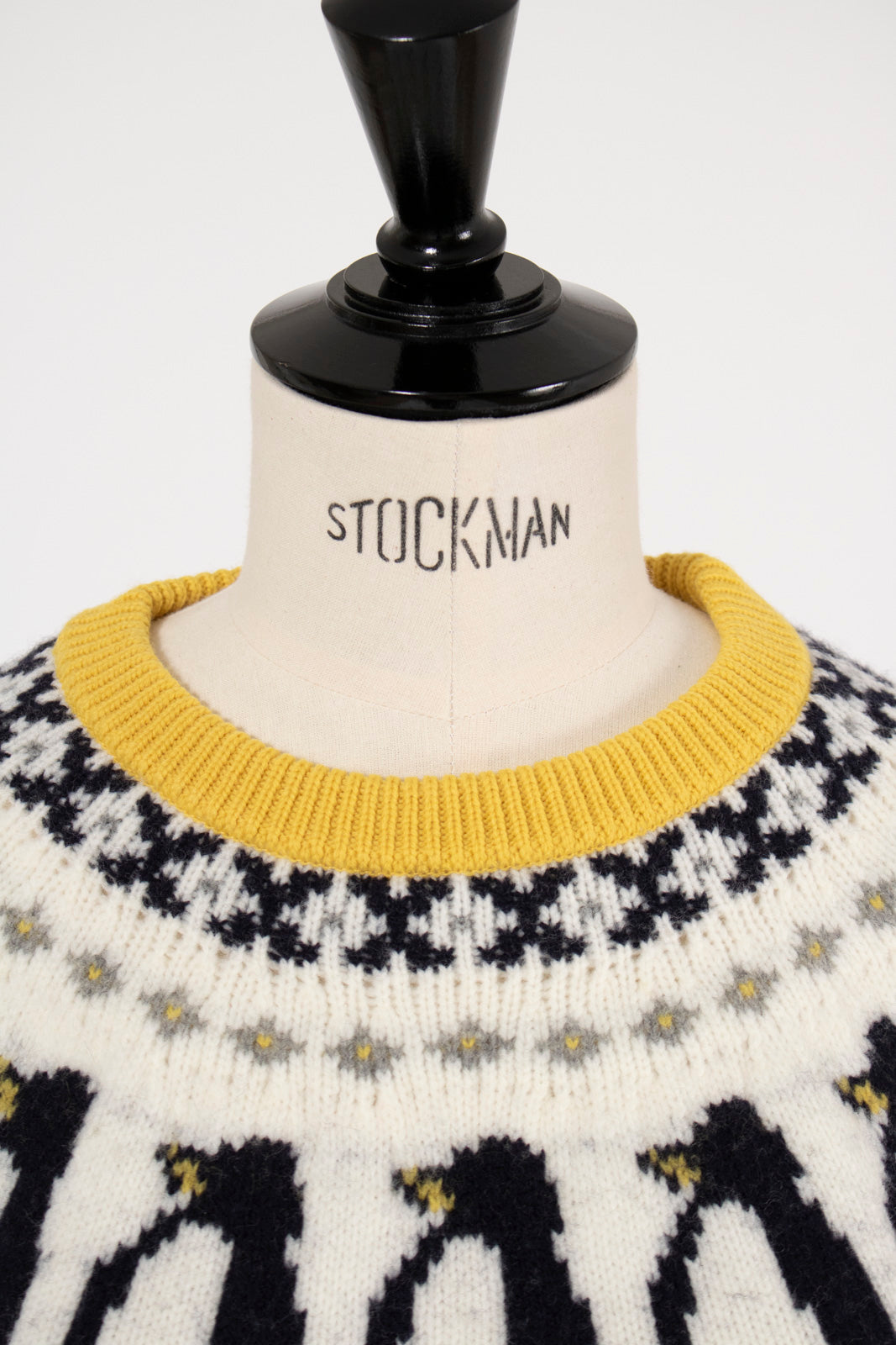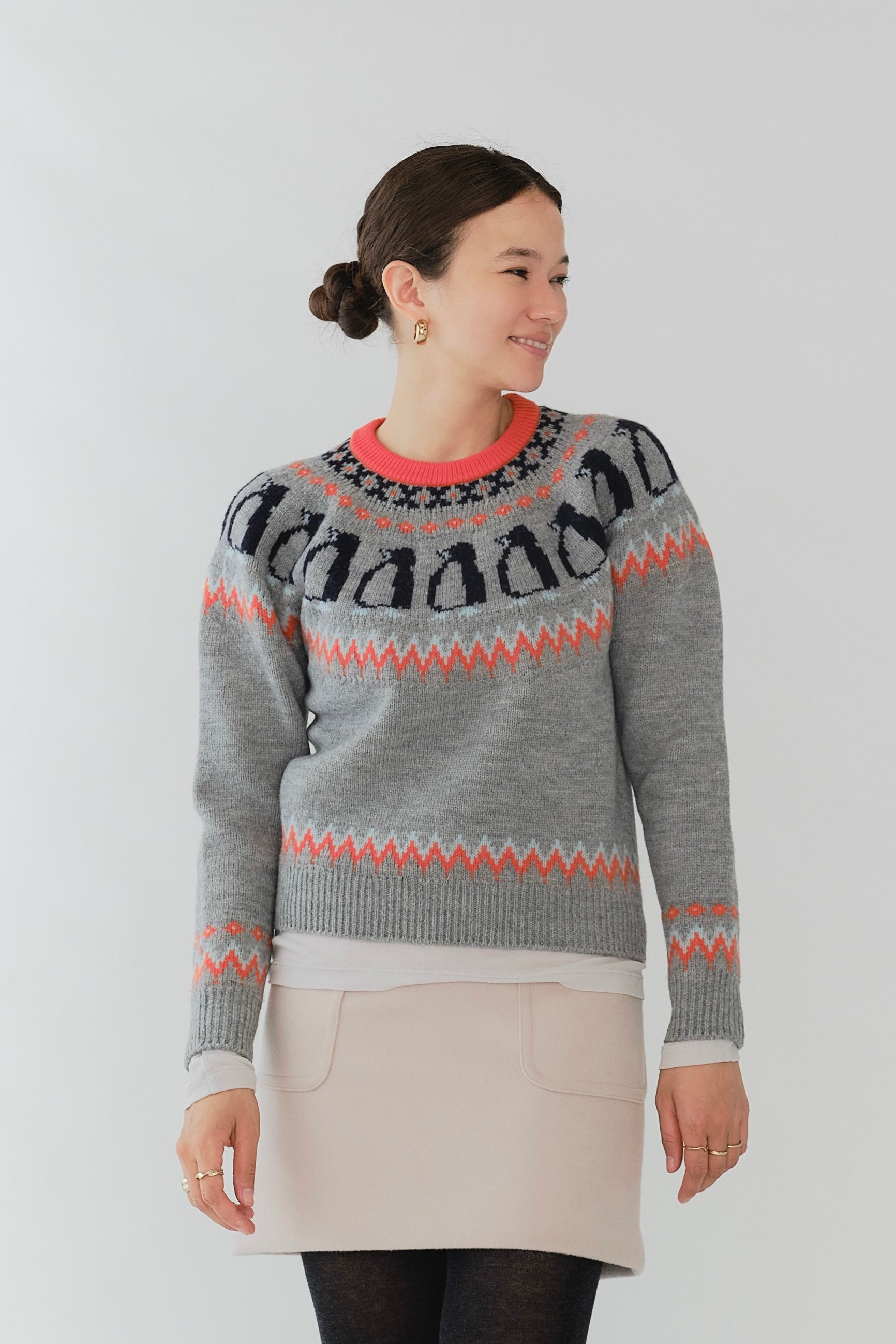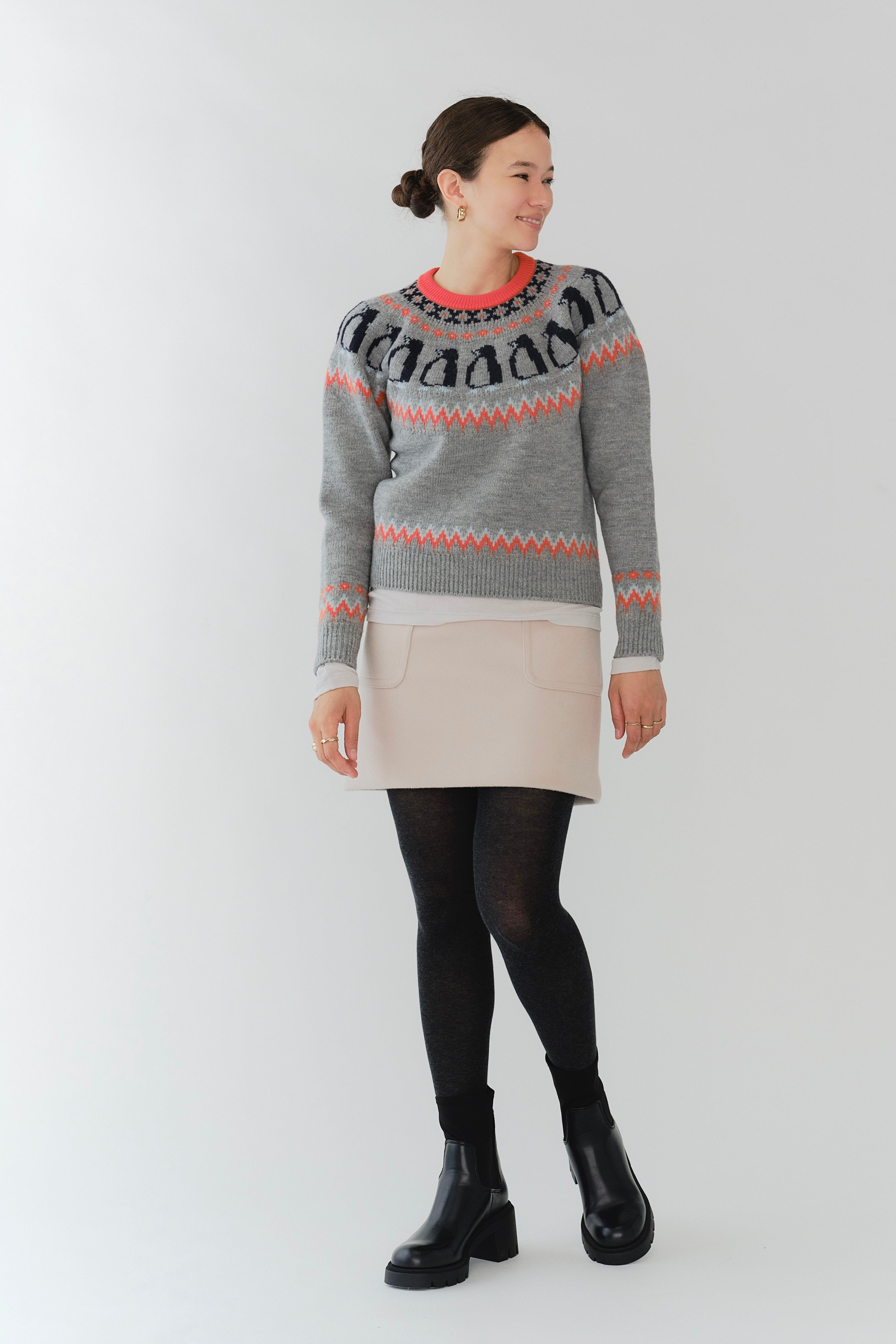 This piece, featuring a playful penguin pattern that wraps all around the front and back, is sure to bring a smile to your face. The exquisite balance of contrasting colors highlights an adult sense of cuteness. Knit using the seamless Whole Garment technique, it offers a fluffy and smooth wearing experience. It comfortably fits the body and achieves a beautiful silhouette from every angle. The material is 100% French wool, resulting in a knit that is soft and light, yet reliably warm. It has a soft, plump, and full hand feel. The design, which serves as a statement piece on its own, adds a touch of playfulness to your autumn/winter coordination. We recommend pairing it with simple bottoms to let the penguin pattern stand out.