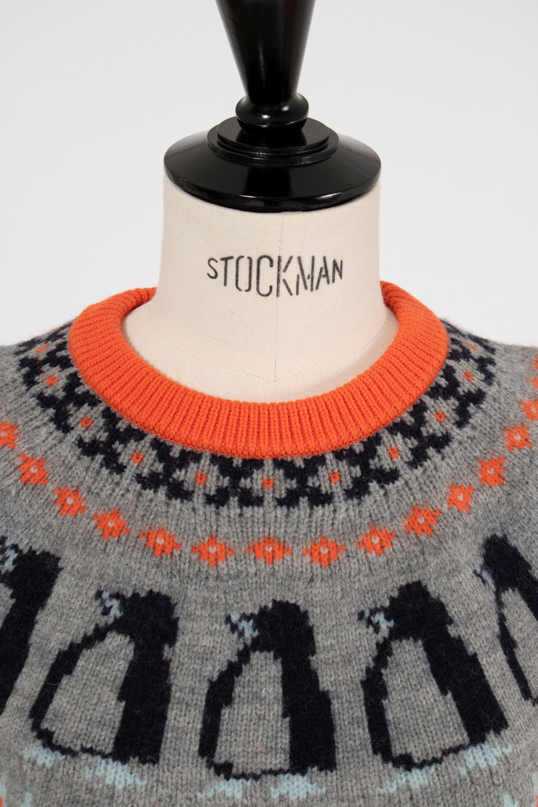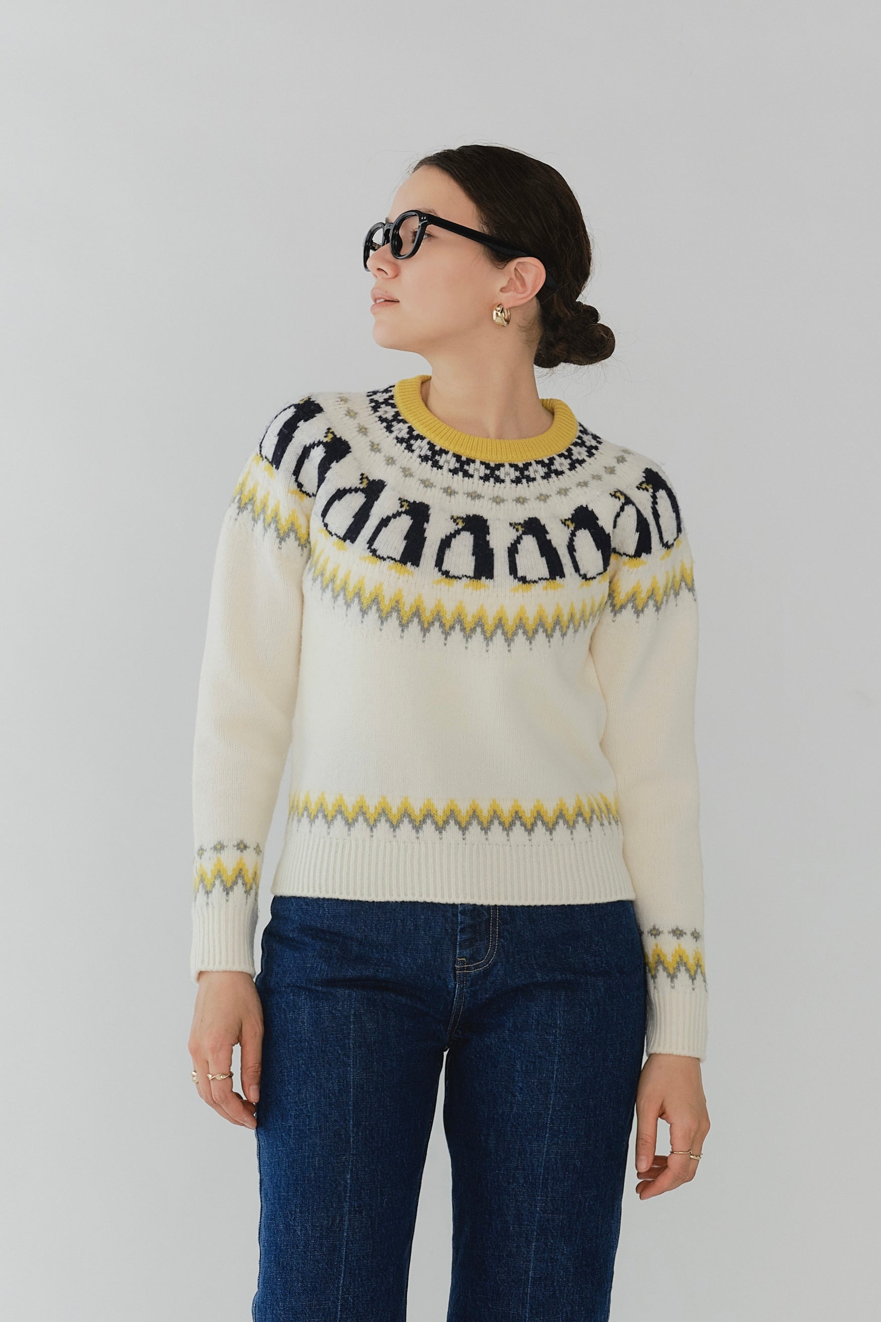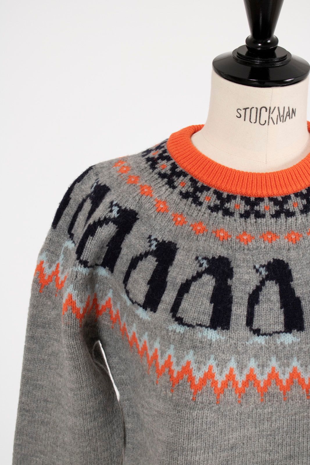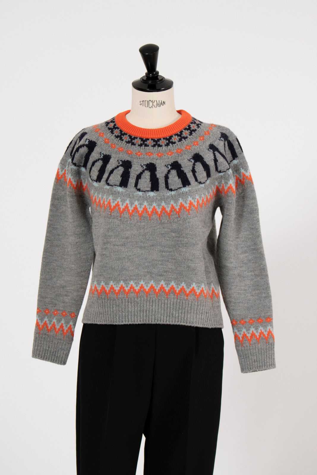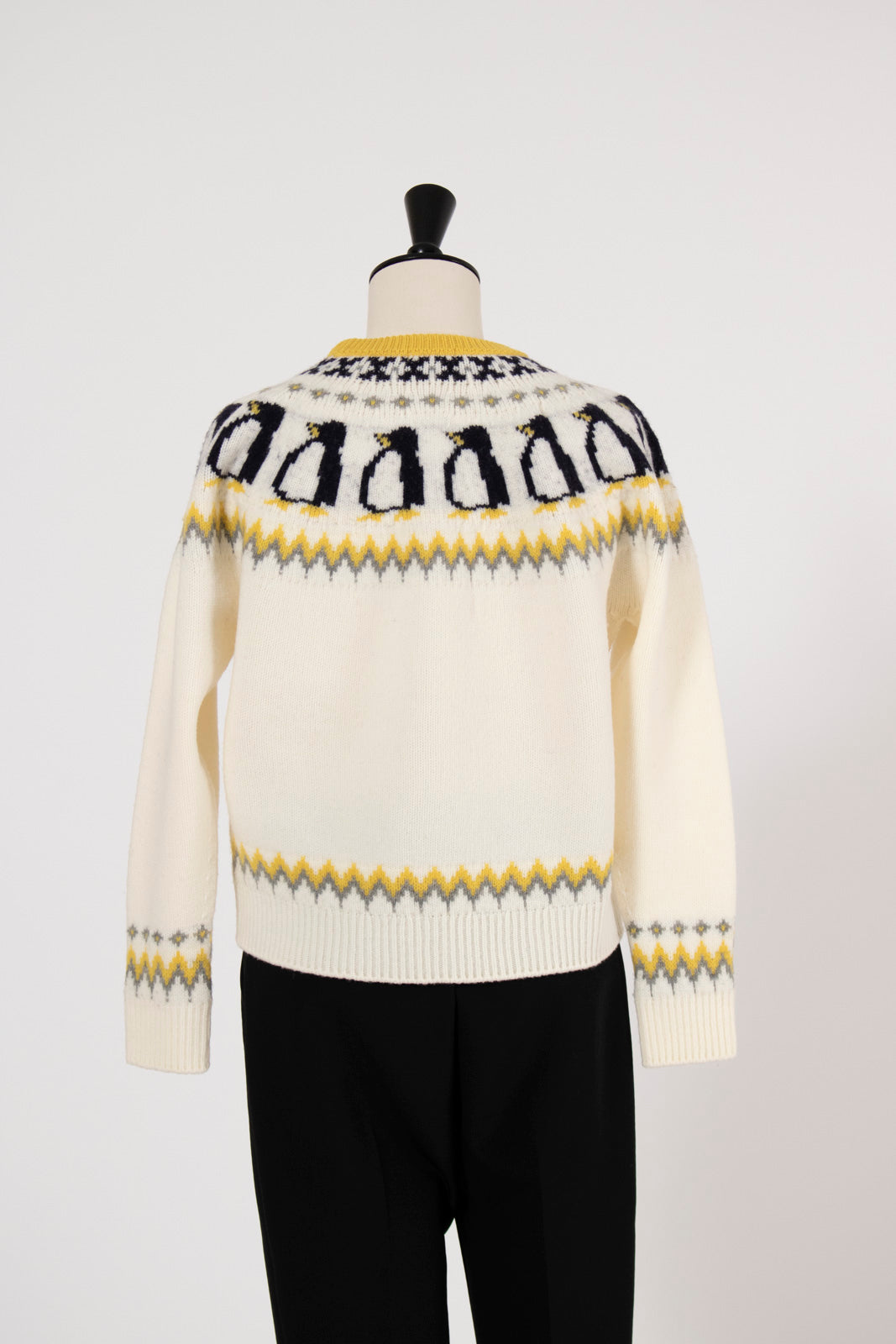 This piece, featuring a playful penguin pattern that wraps all around the front and back, is sure to bring a smile to your face. The exquisite balance of contrasting colors highlights an adult sense of cuteness. Knit using the seamless Whole Garment technique, it offers a fluffy and smooth wearing experience. It comfortably fits the body and achieves a beautiful silhouette from every angle. The material is 100% French wool, resulting in a knit that is soft and light, yet reliably warm. It has a soft, plump, and full hand feel. The design, which serves as a statement piece on its own, adds a touch of playfulness to your autumn/winter coordination. We recommend pairing it with simple bottoms to let the penguin pattern stand out.