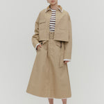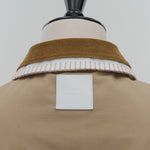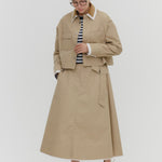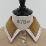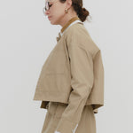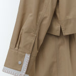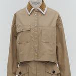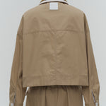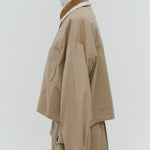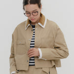 Description (EN): This shirt jacket showcases blanket stitching along the collar and cuffs, complemented by a double corduroy collar and a cropped fit. Crafted from high-density, lightweight chino fabric with tightly twisted yarns, it resists fuzziness for a clean finish. The design includes a relaxed dropped shoulder, safari-style pockets, and a leather patch featuring the "yori" logo on the back for unique detail. Its shorter length pairs beautifully with wide-leg pants or long skirts, making it a versatile piece that effortlessly elevates casual outfits with a modern touch.