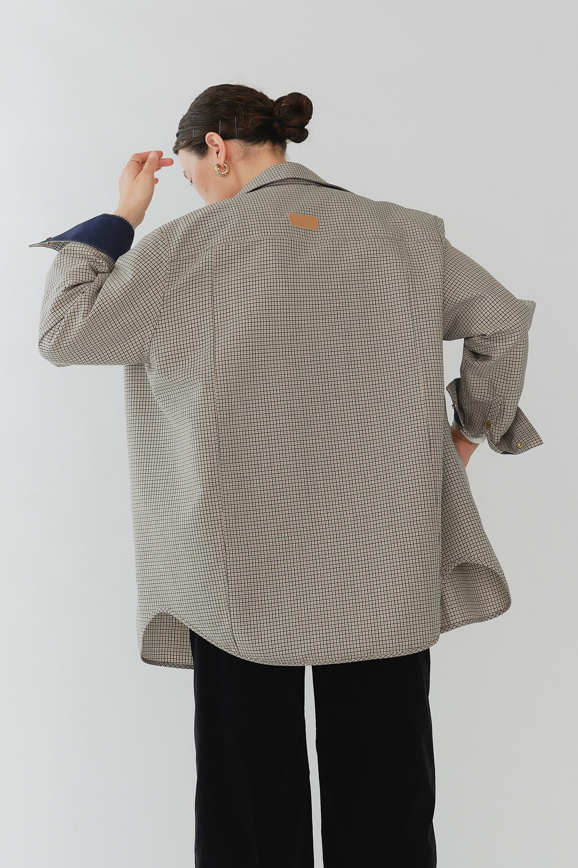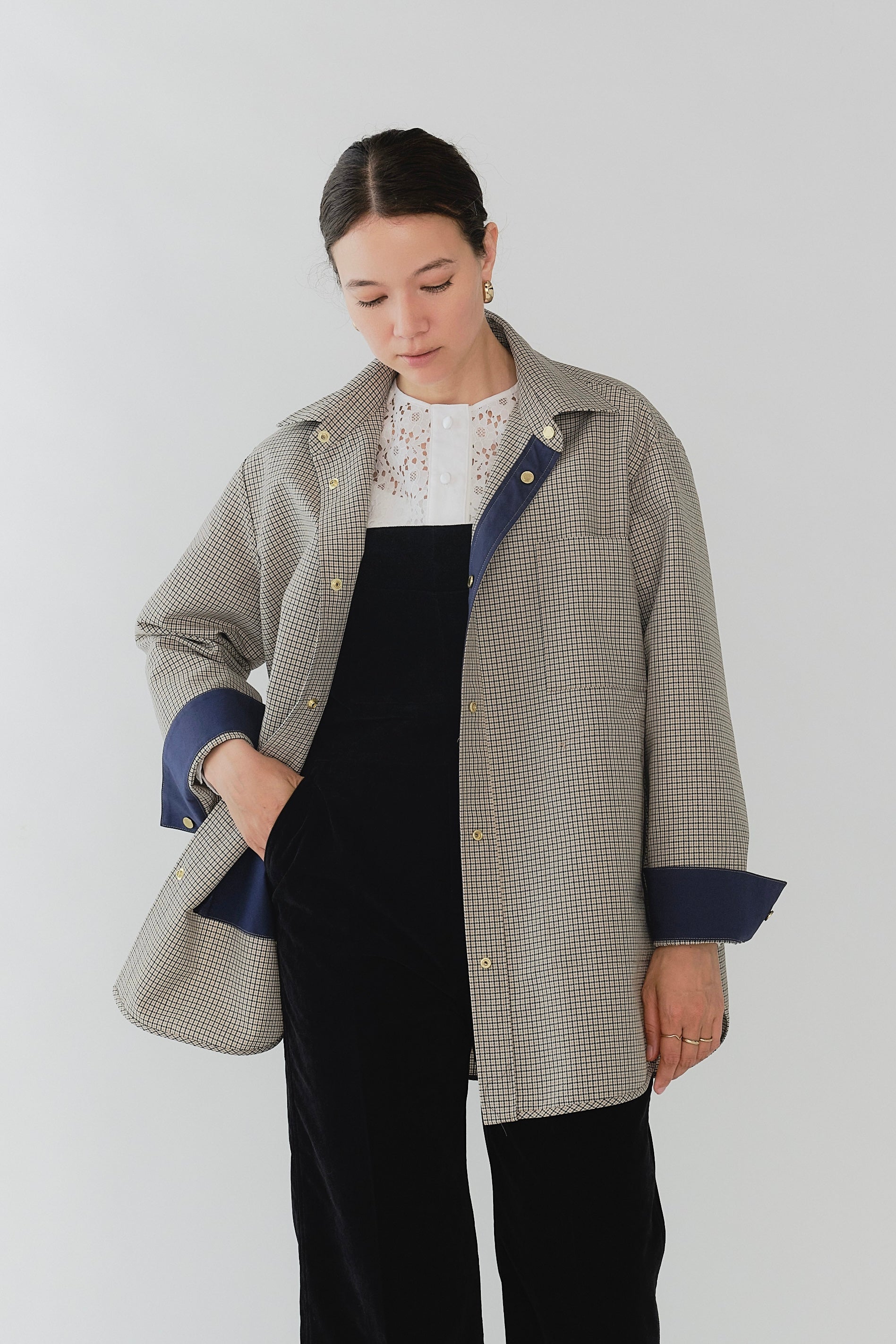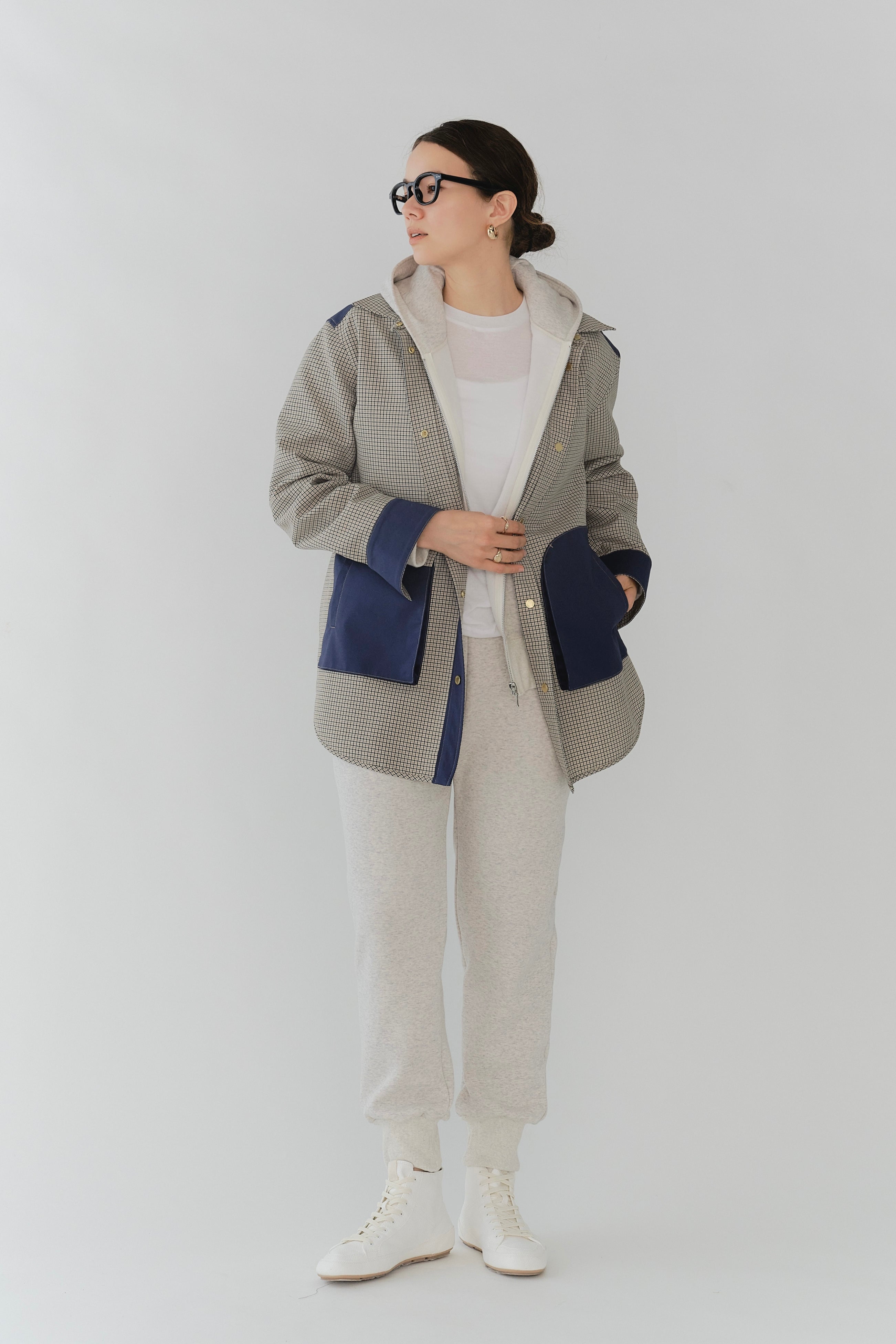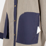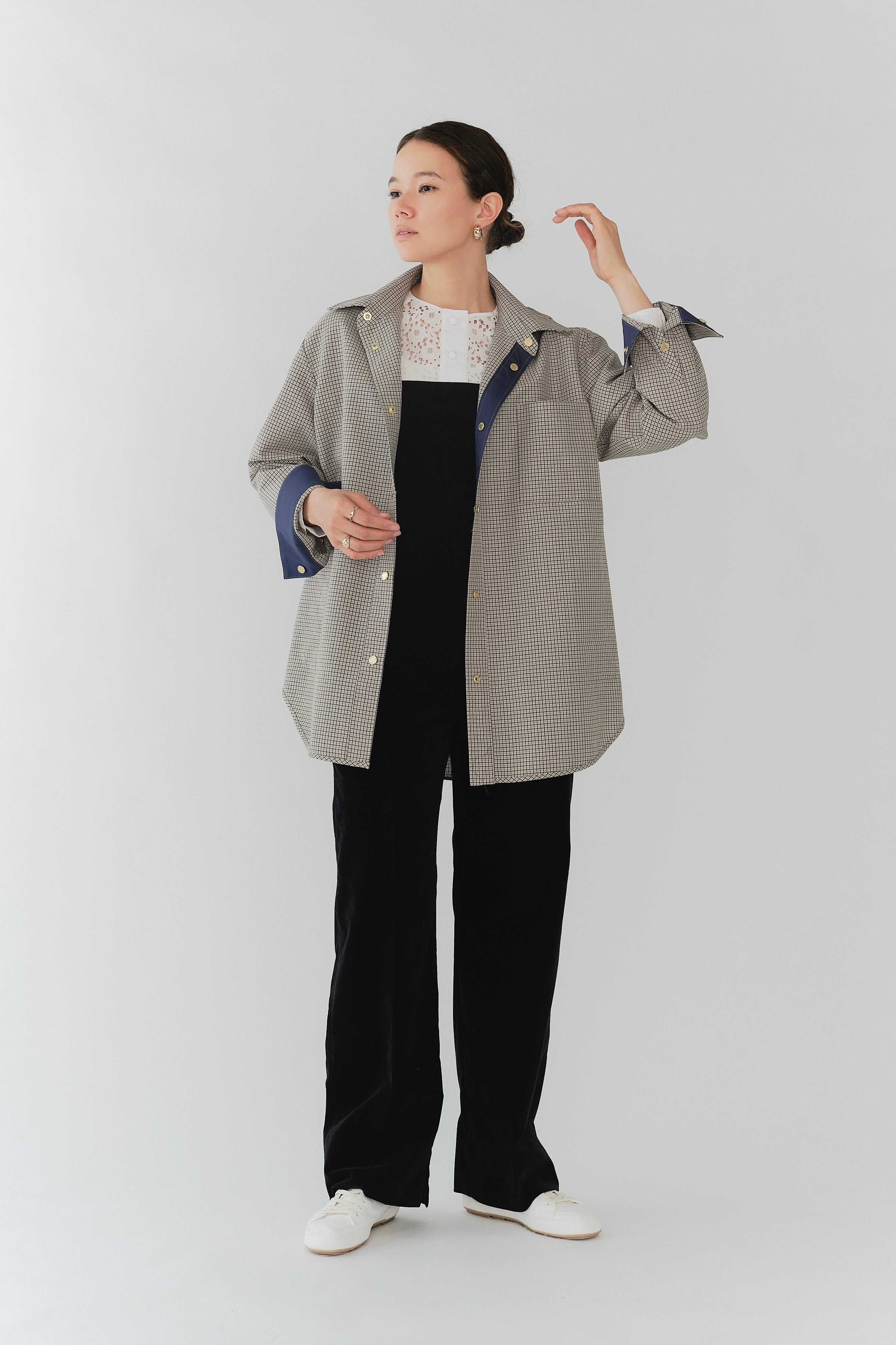 This reversible check shirt jacket from yori is appealing for its high-quality, structured material. While simple, the meticulously detailed design shines through. The reversible specification allows you to enjoy different looks, expanding your coordination options. The reversible design lets you freely switch between the check pattern and the plain side, allowing you to change the aesthetic to suit the scene or your mood. Yori original dot buttons add a subtle accent to the simple design, reflecting attention to detail. The check pattern/plain side is equipped with three-dimensional pockets, combining practicality with design. The back of the check pattern side features an original yori leather patch, adding the brand's unique personality. The overall relaxed, healthy silhouette prioritizes comfort while beautifully enhancing the figure.
