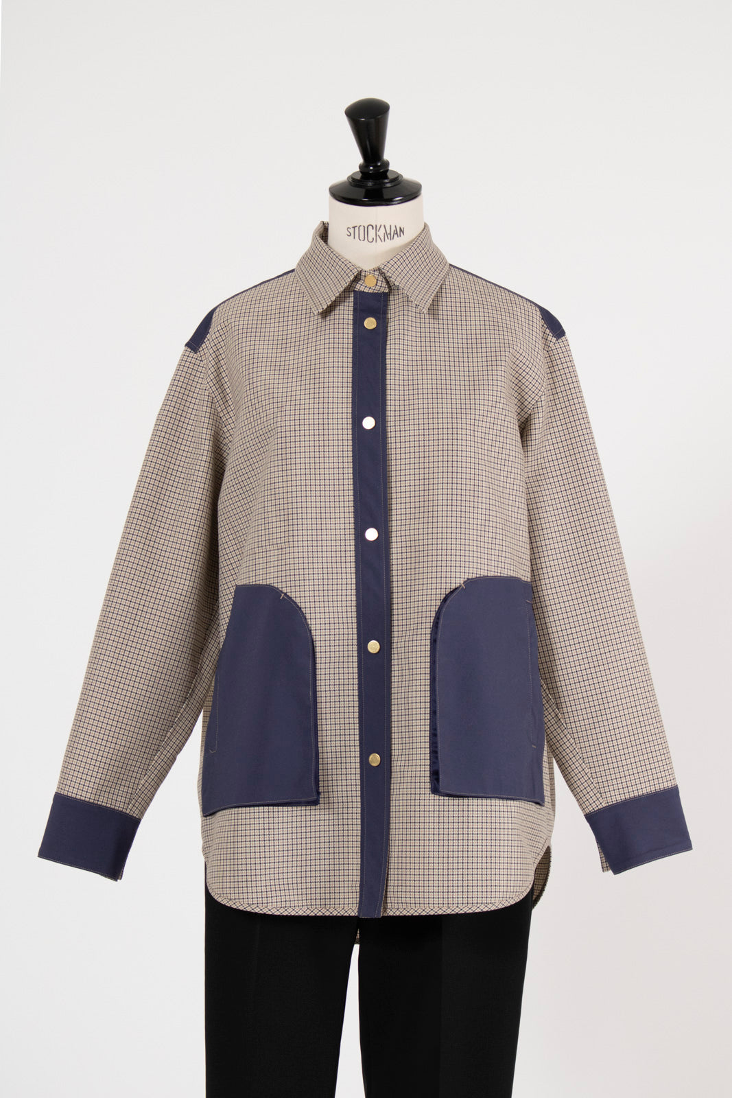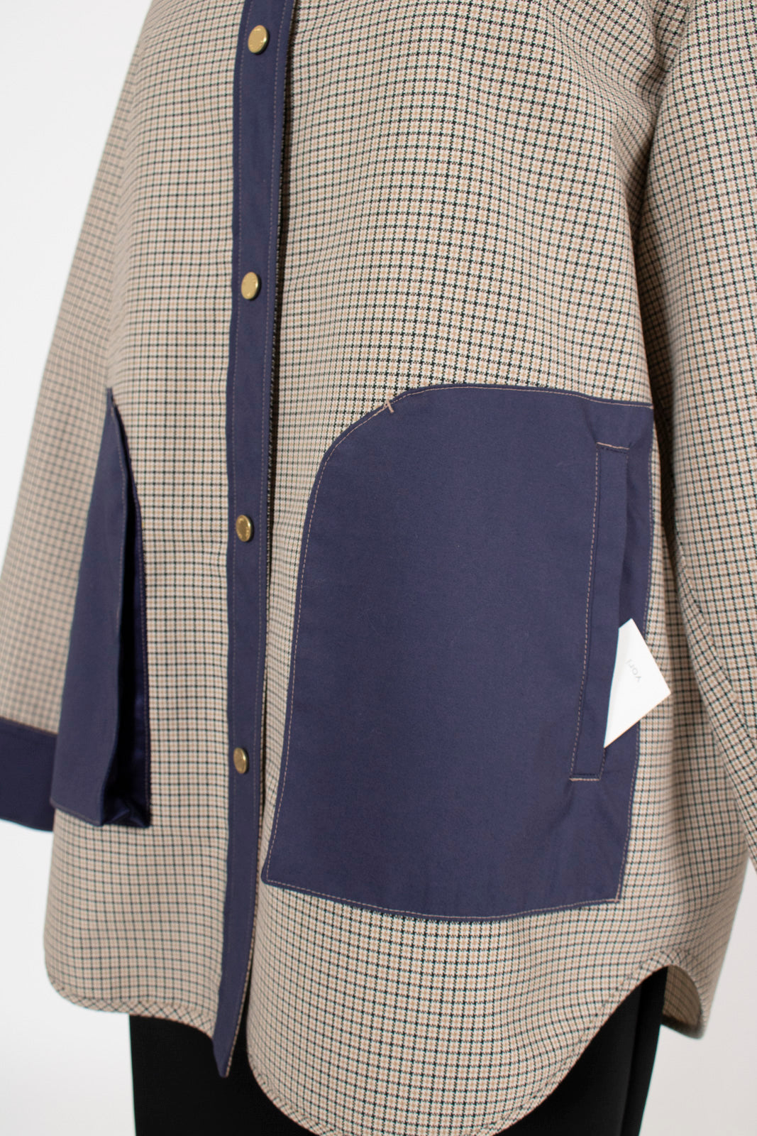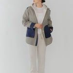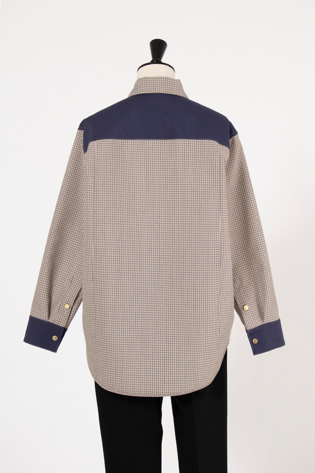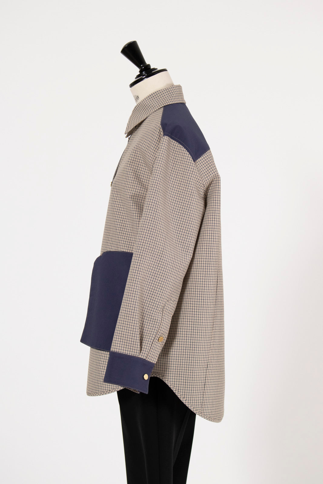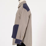 This reversible check shirt jacket from yori is appealing for its high-quality, structured material. While simple, the meticulously detailed design shines through. The reversible specification allows you to enjoy different looks, expanding your coordination options. The reversible design lets you freely switch between the check pattern and the plain side, allowing you to change the aesthetic to suit the scene or your mood. Yori original dot buttons add a subtle accent to the simple design, reflecting attention to detail. The check pattern/plain side is equipped with three-dimensional pockets, combining practicality with design. The back of the check pattern side features an original yori leather patch, adding the brand's unique personality. The overall relaxed, healthy silhouette prioritizes comfort while beautifully enhancing the figure.