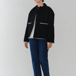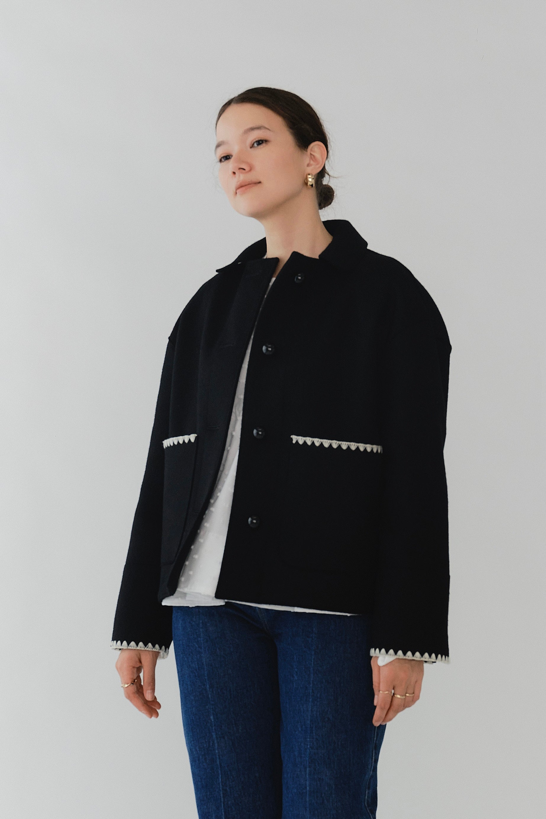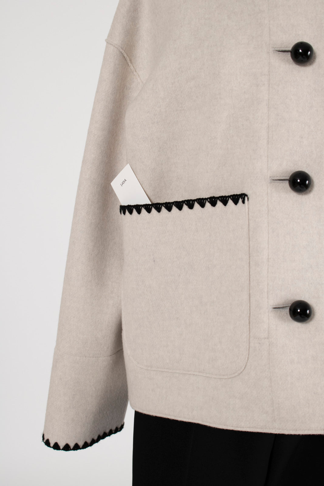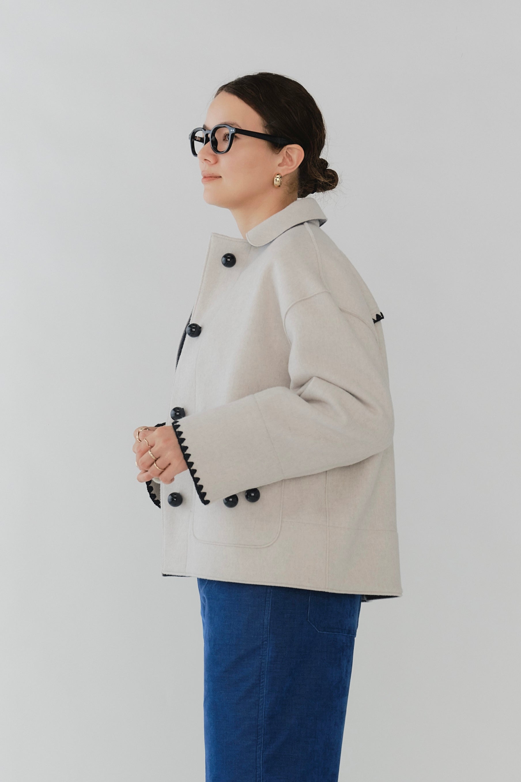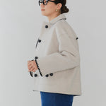 This short coat combines playfulness and elegance, featuring eye-catching large buttons that draw attention. Clam shell embroidery is applied to the cuffs, pocket openings, and back yoke, adding a subtle touch of cuteness. The rounded embroidery is an adorable cookie-like motif that brightens your mood every time you wear the coat. Made from high-quality wool, the material ensures not only beauty but also warmth and comfortable wear. Furthermore, a name tag motif subtly incorporated into the design adds a characteristic yori touch. This is a meticulously detailed piece designed to be the star of your winter wardrobe.