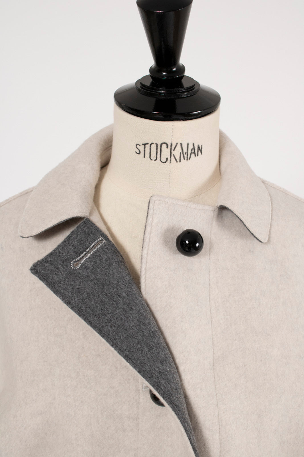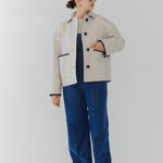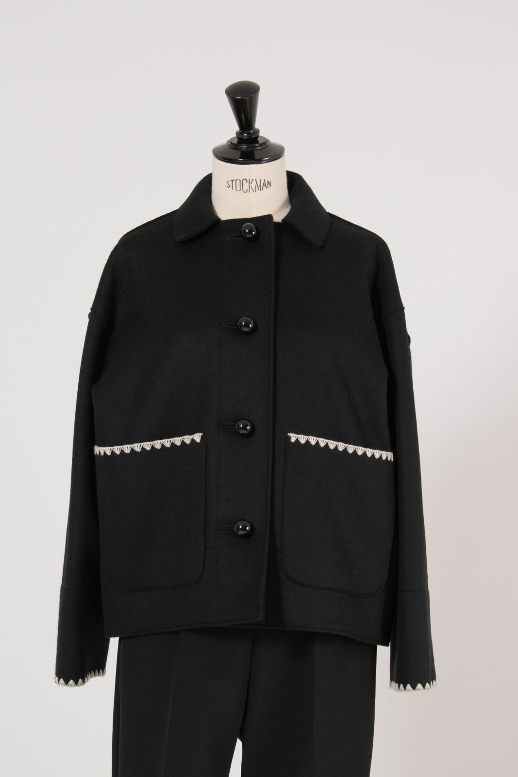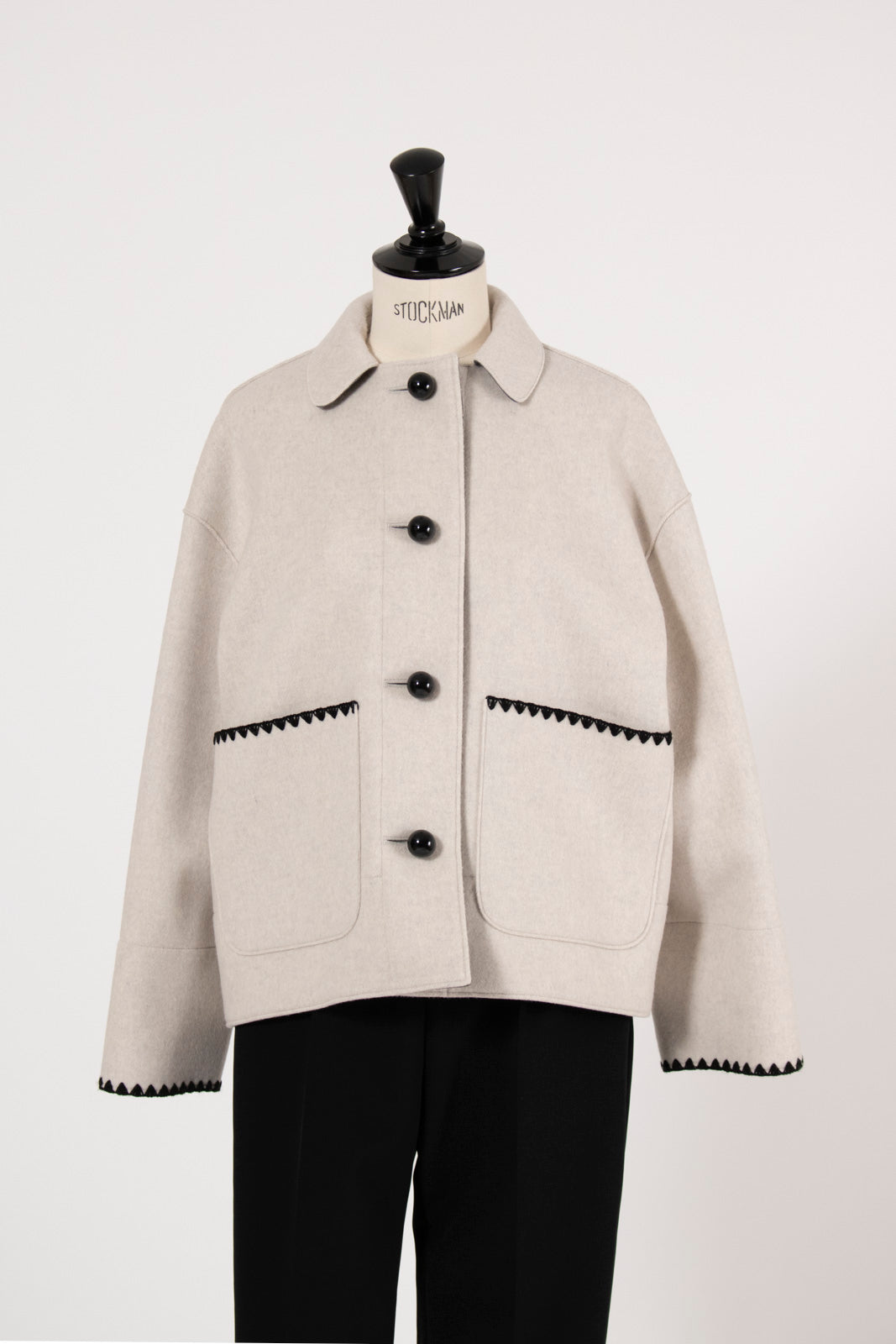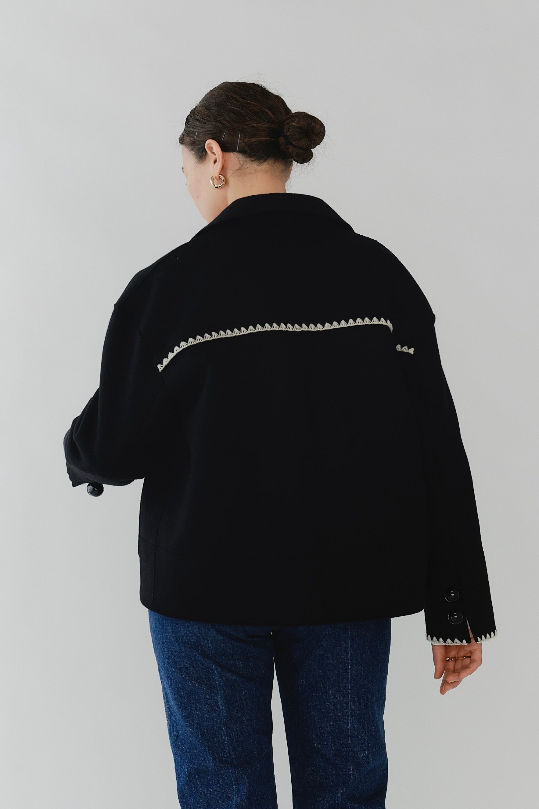 This short coat combines playfulness and elegance, featuring eye-catching large buttons that draw attention. Clam shell embroidery is applied to the cuffs, pocket openings, and back yoke, adding a subtle touch of cuteness. The rounded embroidery is an adorable cookie-like motif that brightens your mood every time you wear the coat. Made from high-quality wool, the material ensures not only beauty but also warmth and comfortable wear. Furthermore, a name tag motif subtly incorporated into the design adds a characteristic yori touch. This is a meticulously detailed piece designed to be the star of your winter wardrobe.