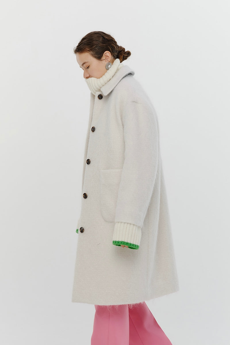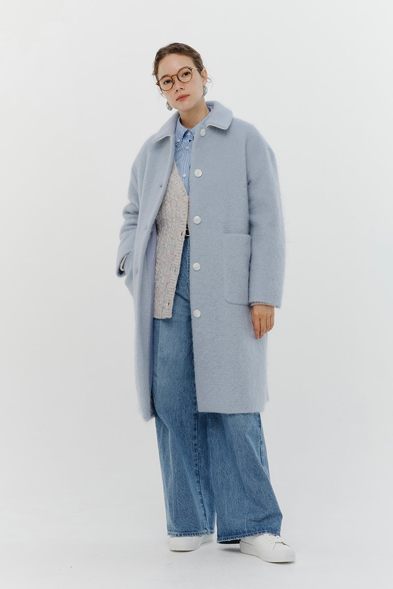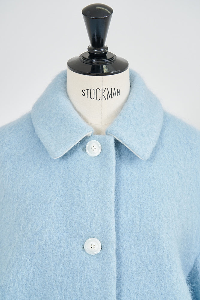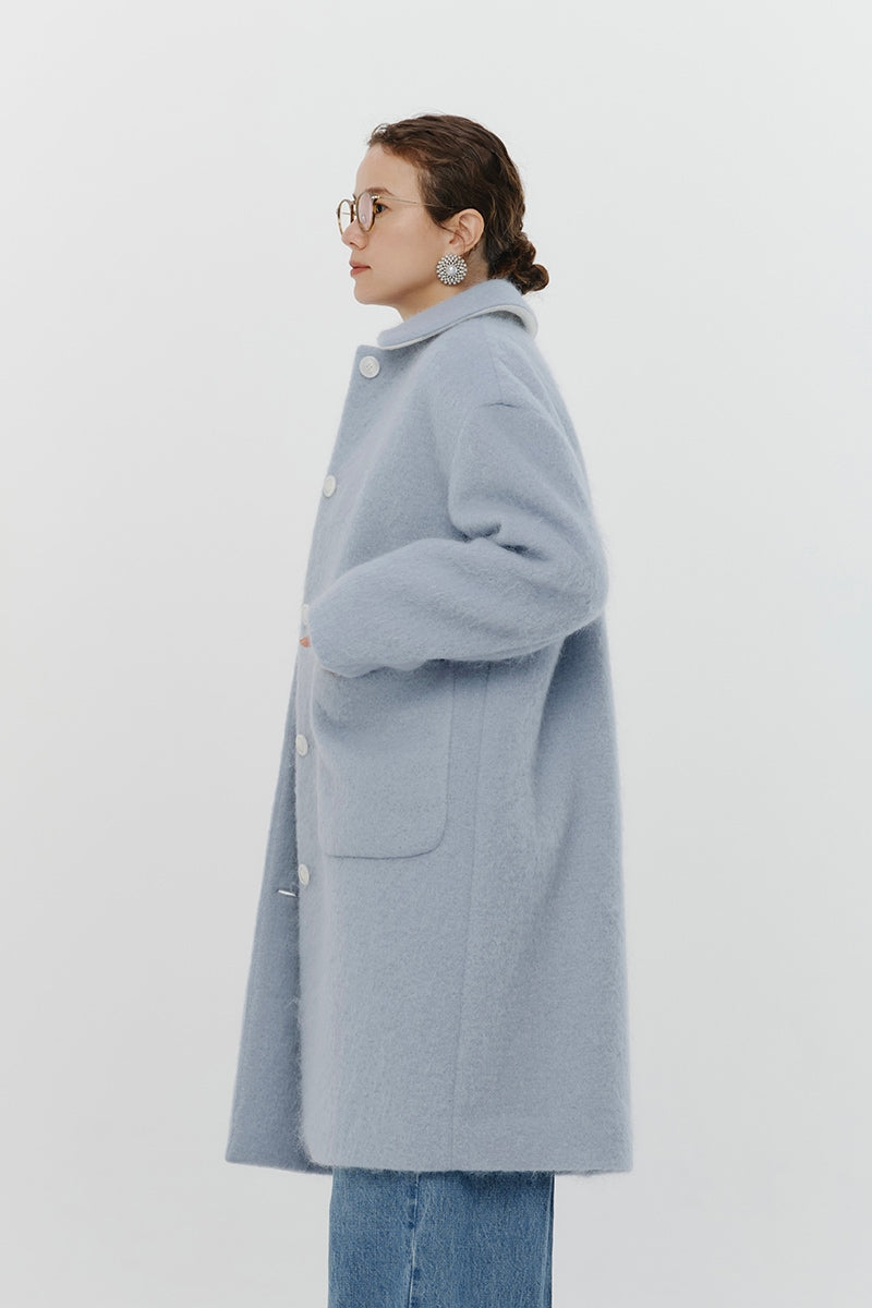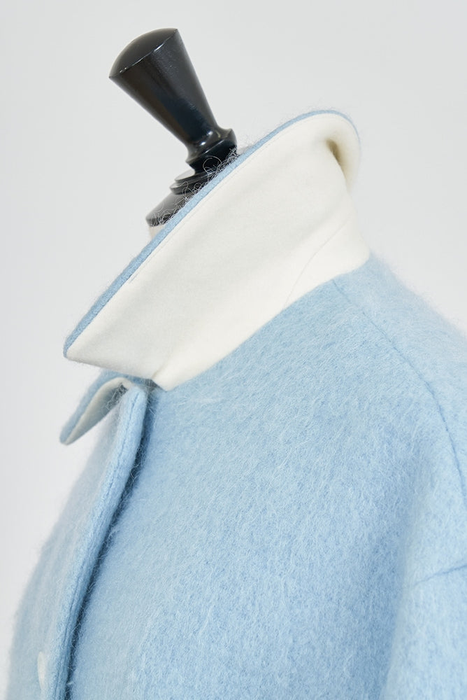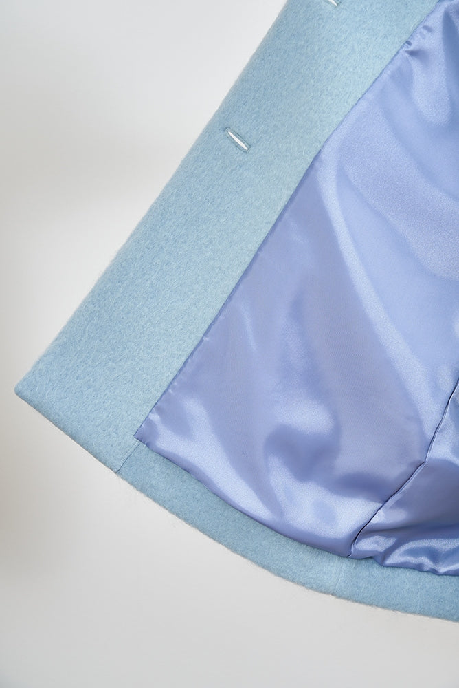 This short coat is made from eco-friendly recycled polyester with a soft, sheep-like texture. The tailored collar, curved sleeve form, and rounded silhouette give it a refined look. The relaxed silhouette and perfect length make it easy to style with various bottoms. Large buttons serve as a stylish accent, while the blue and light yellow lining adds a bold or sophisticated touch, depending on the color. It’s a versatile item for fall and winter.
