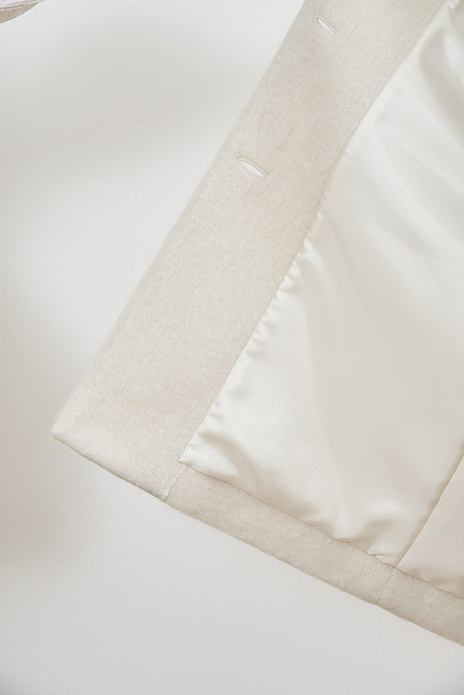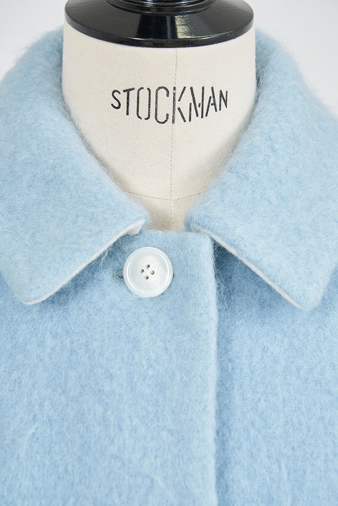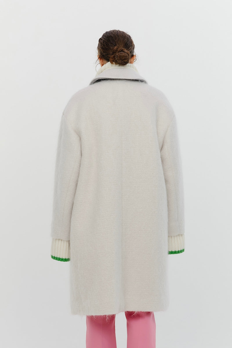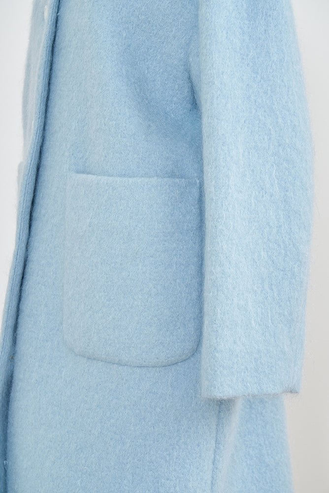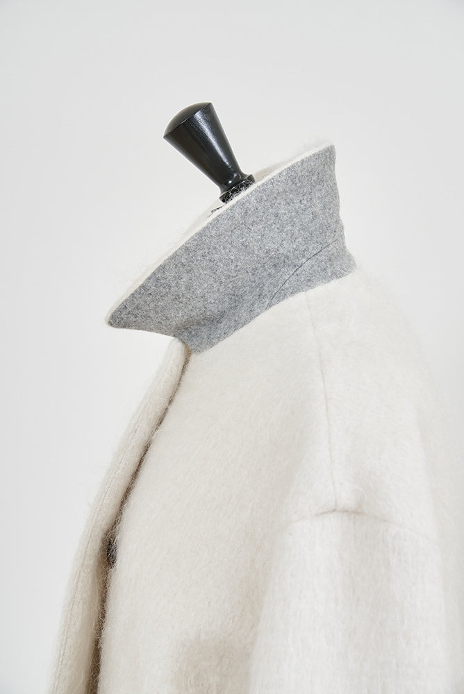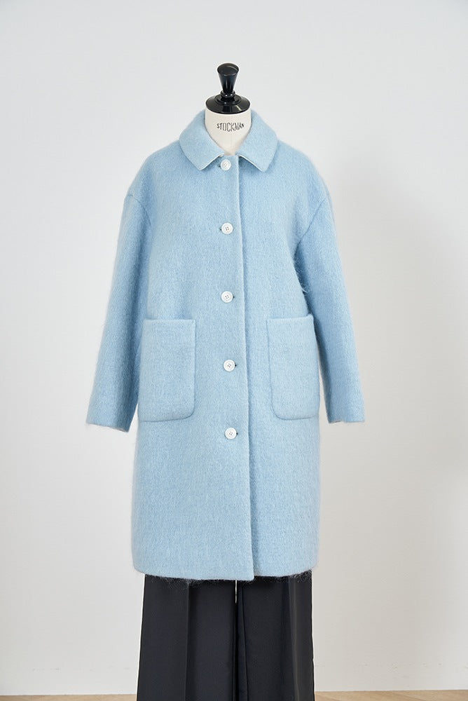 This short coat is made from eco-friendly recycled polyester with a soft, sheep-like texture. The tailored collar, curved sleeve form, and rounded silhouette give it a refined look. The relaxed silhouette and perfect length make it easy to style with various bottoms. Large buttons serve as a stylish accent, while the blue and light yellow lining adds a bold or sophisticated touch, depending on the color. It’s a versatile item for fall and winter.
