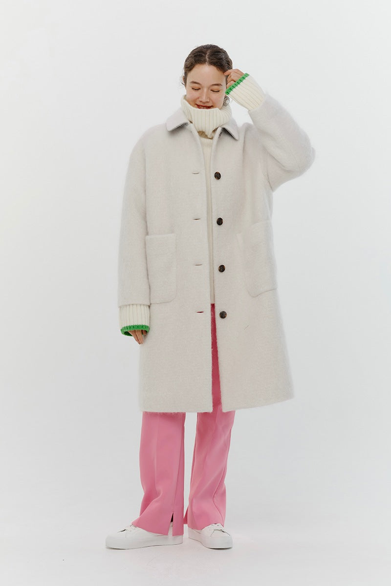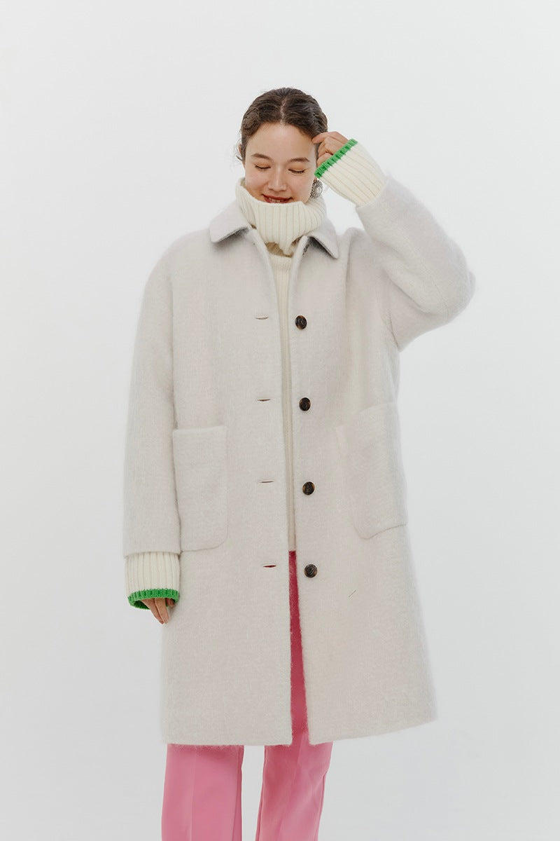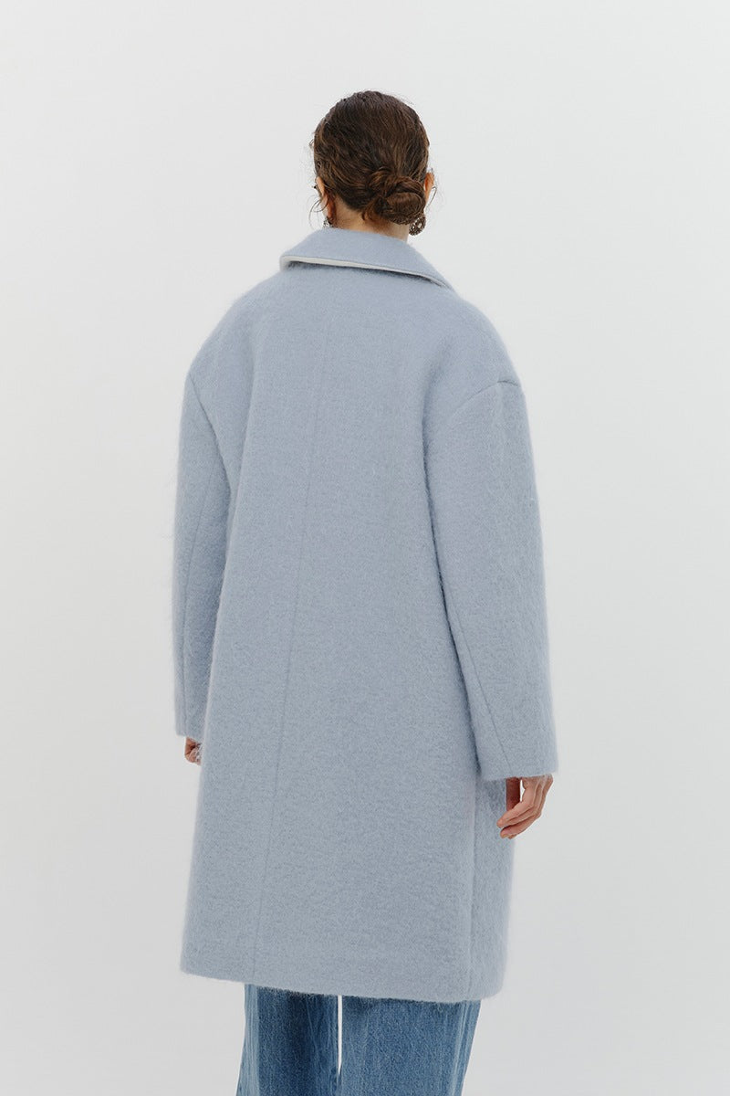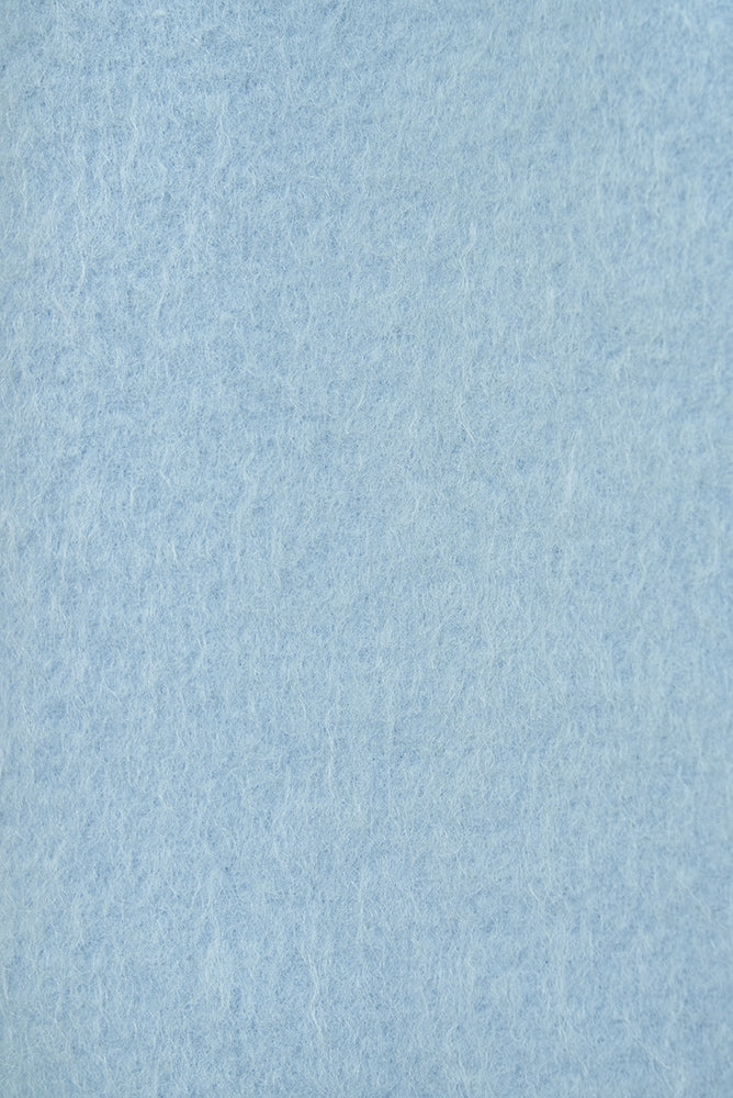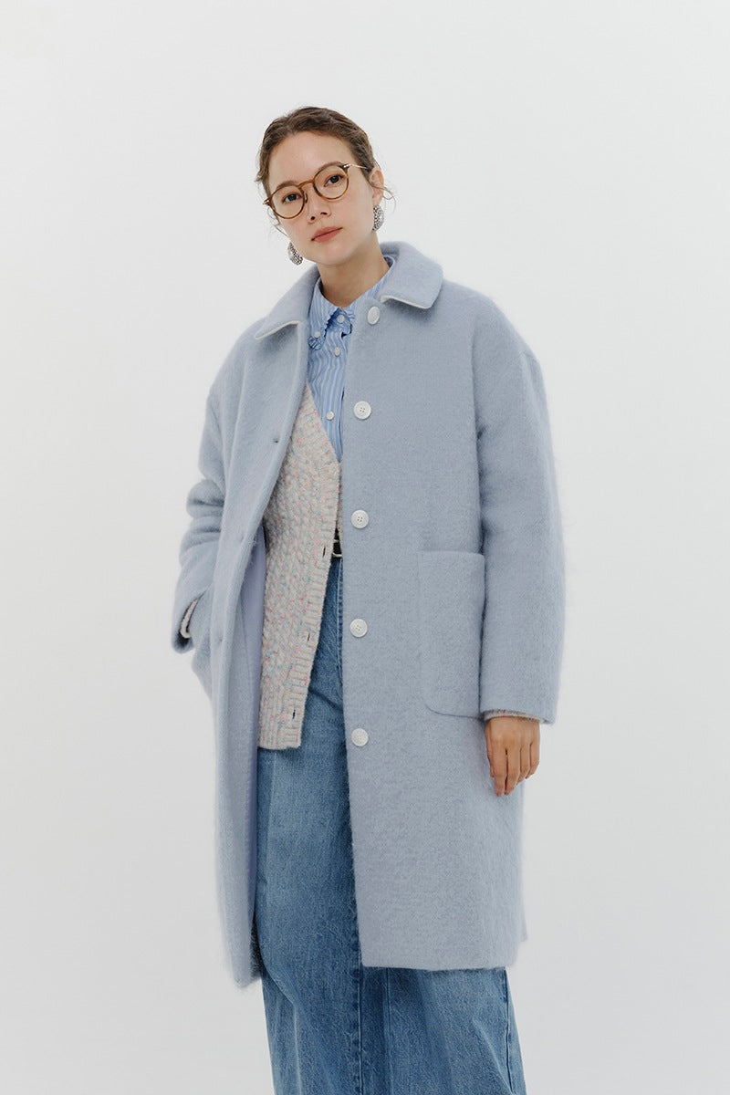 This short coat is made from eco-friendly recycled polyester with a soft, sheep-like texture. The tailored collar, curved sleeve form, and rounded silhouette give it a refined look. The relaxed silhouette and perfect length make it easy to style with various bottoms. Large buttons serve as a stylish accent, while the blue and light yellow lining adds a bold or sophisticated touch, depending on the color. It’s a versatile item for fall and winter.