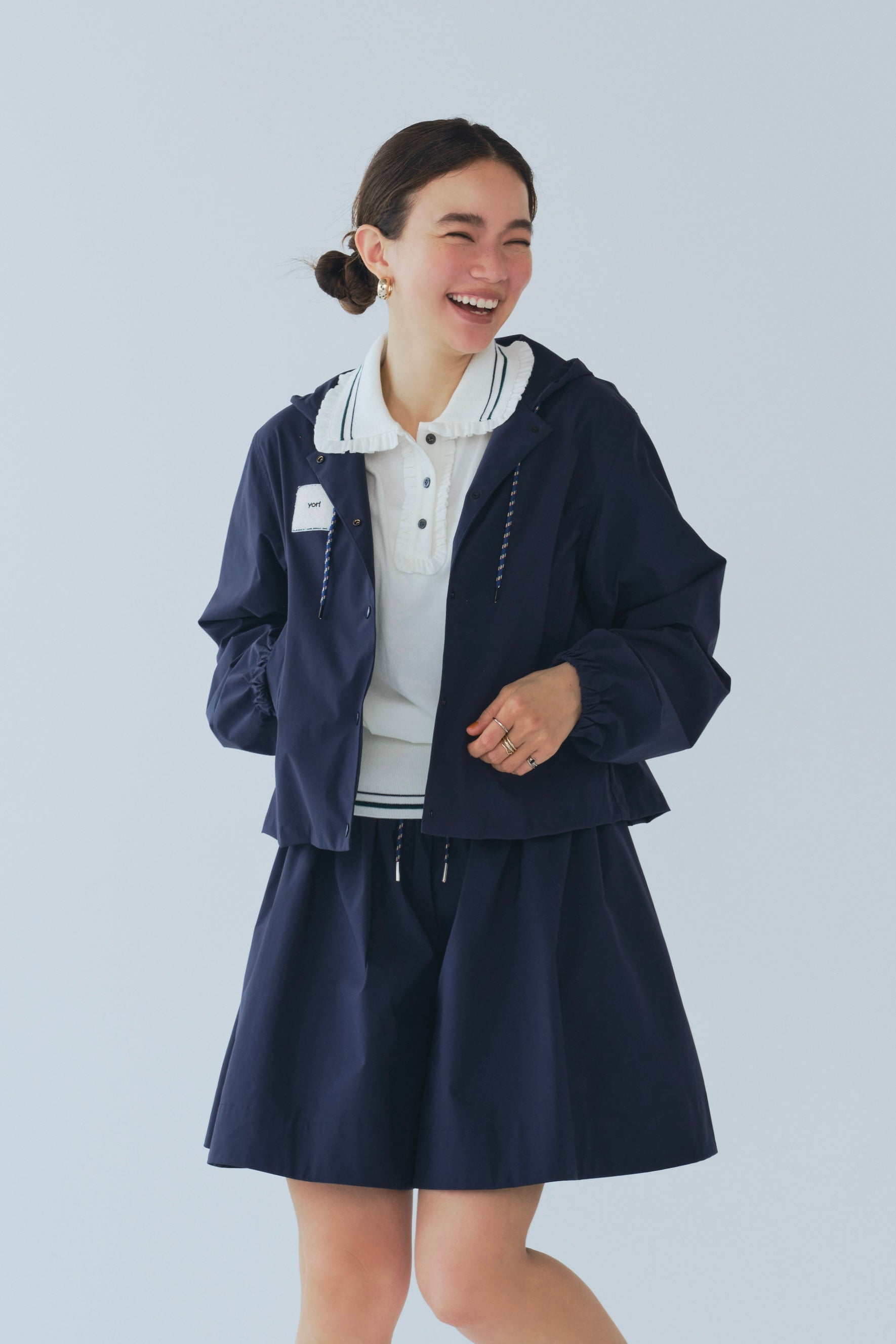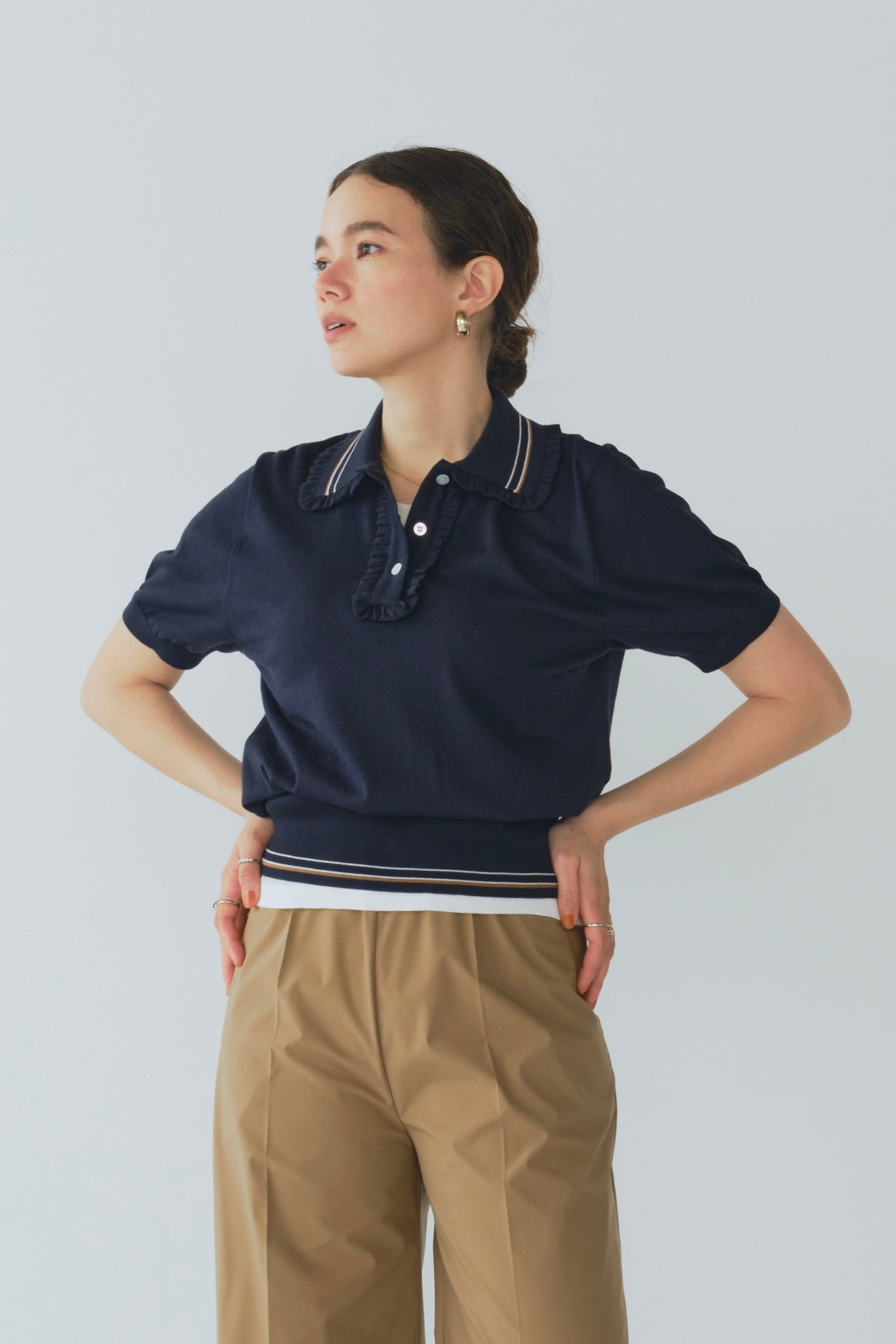 Description (EN): This mini frill polo knit combines sporty style with a feminine touch through delicate collar frills. Its ribbed sleeves and waist create a flattering fit, while the lightweight, smooth cotton fabric ensures comfort in warm weather. The two-tone accents add subtle sophistication, making it an easy choice for casual outings or everyday wear.