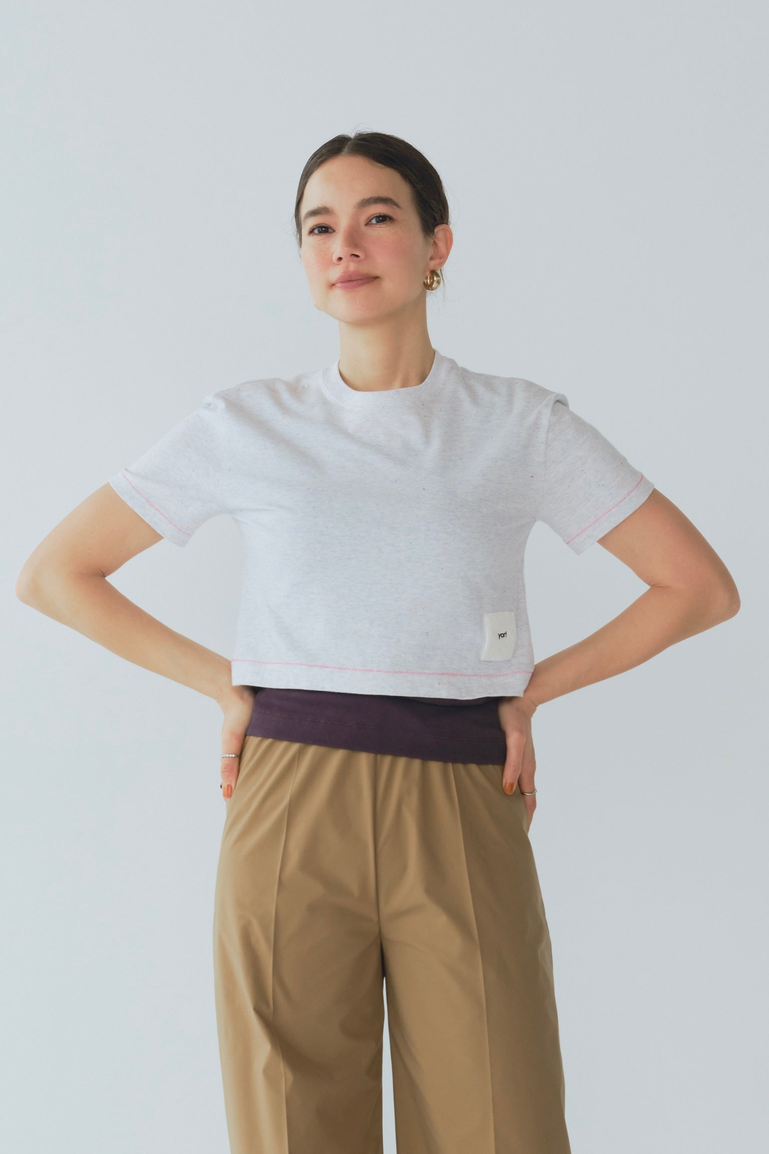 A playful cut-and-sew top adorned with colorful neps scattered throughout. The uneven base coloring adds a vintage-inspired touch, while the soft and smooth texture offers a comfortable feel against the skin. A fluffy, original patch by yori adds an extra dose of charm.