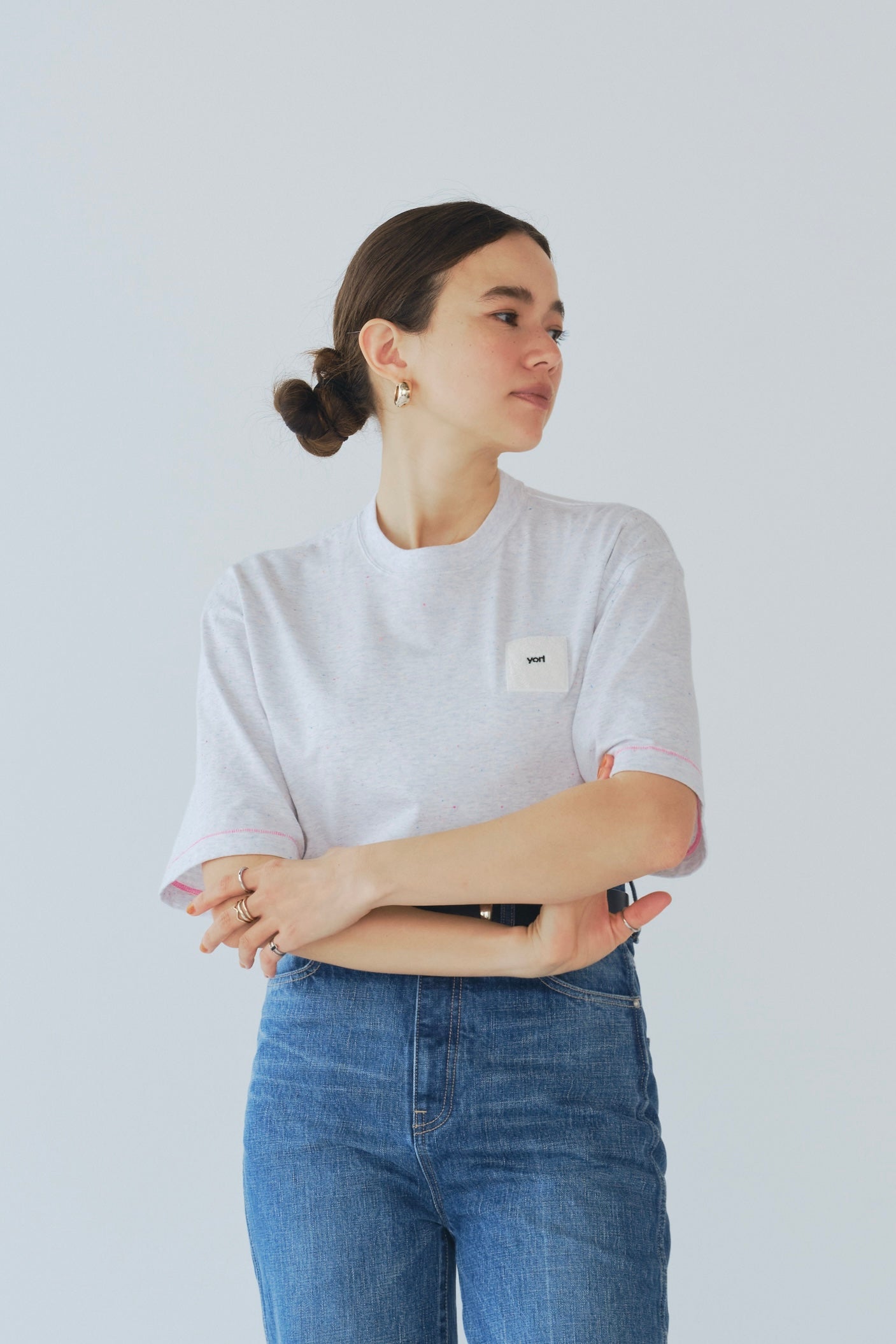 A fun and cheerful cut-and-sew piece, sprinkled with colorful nep yarns that dance across the fabric. The unevenly dyed base adds a vintage-inspired charm, while the soft and smooth texture feels wonderful against the skin.