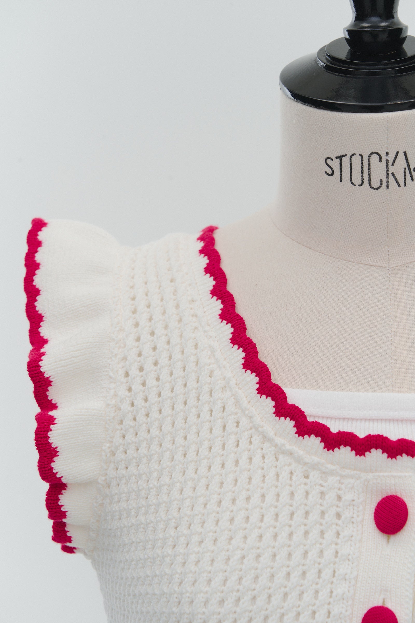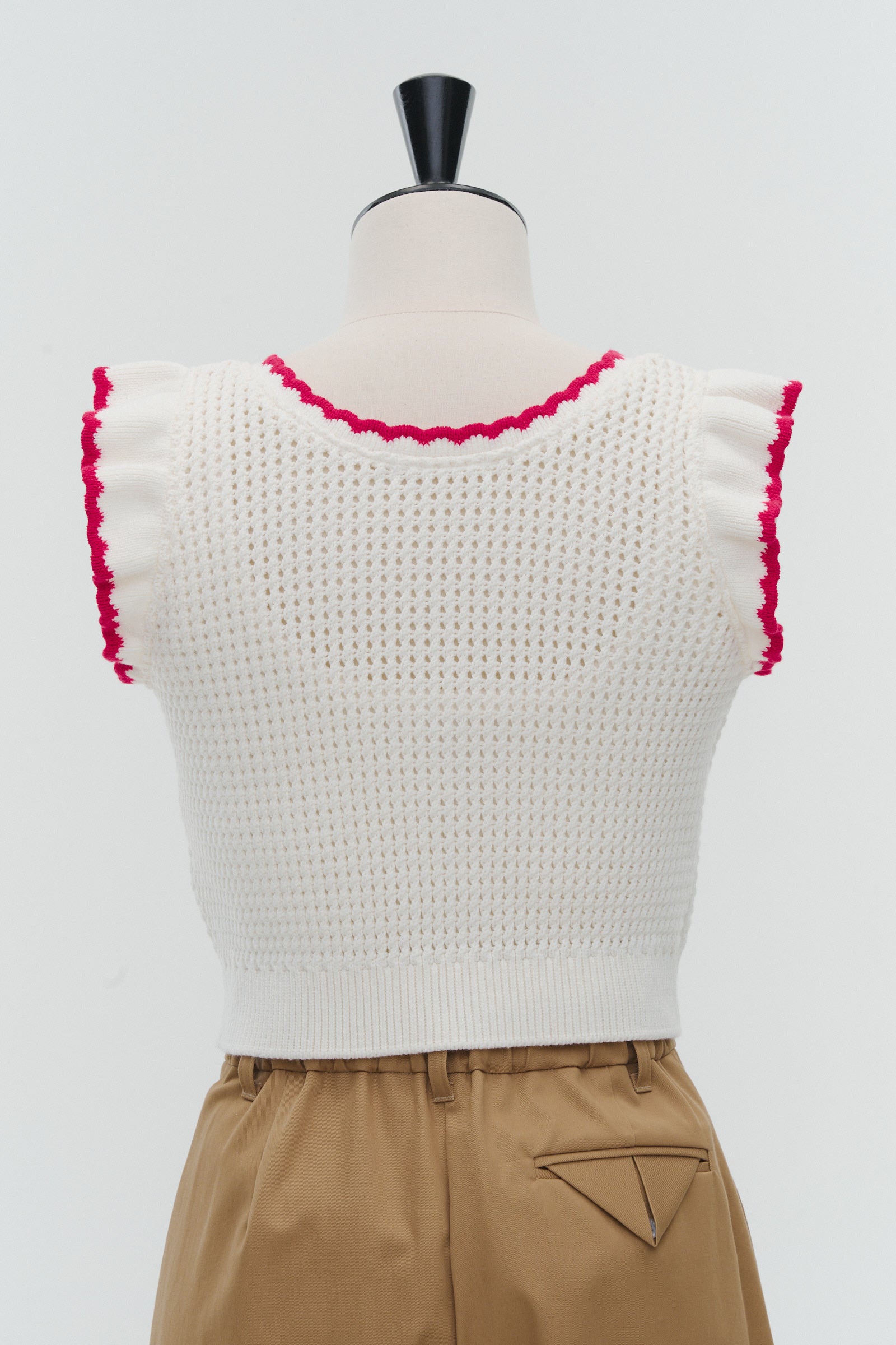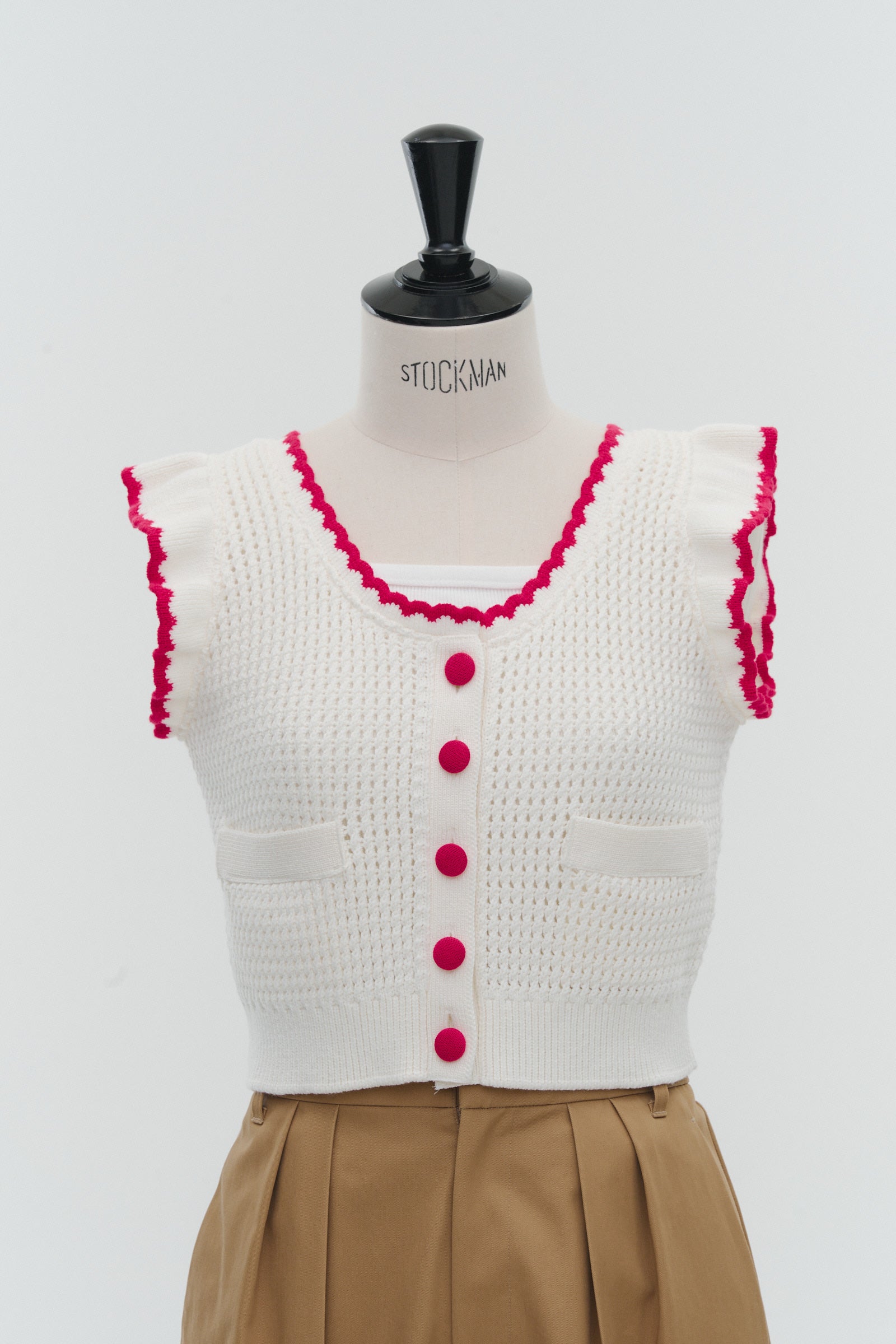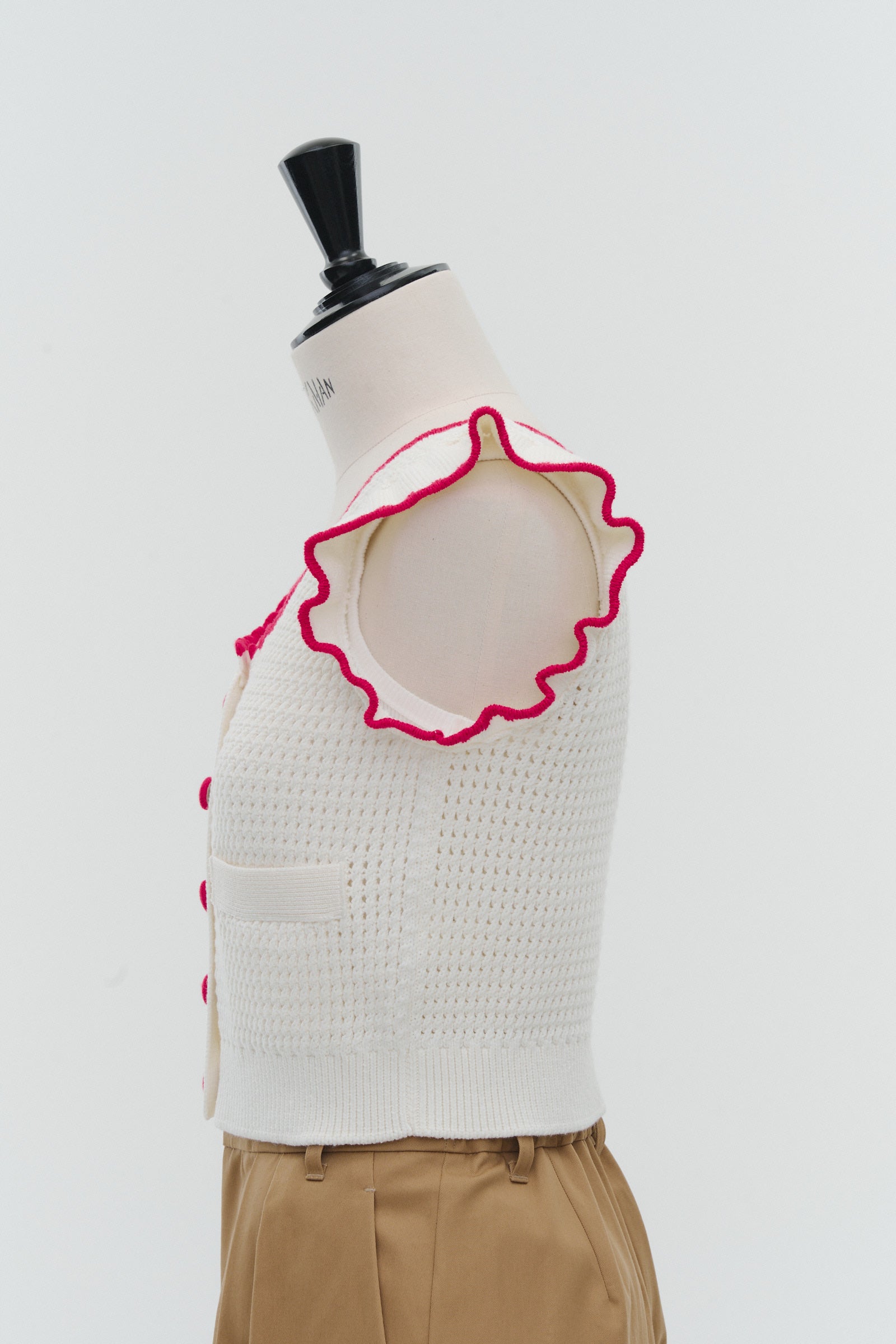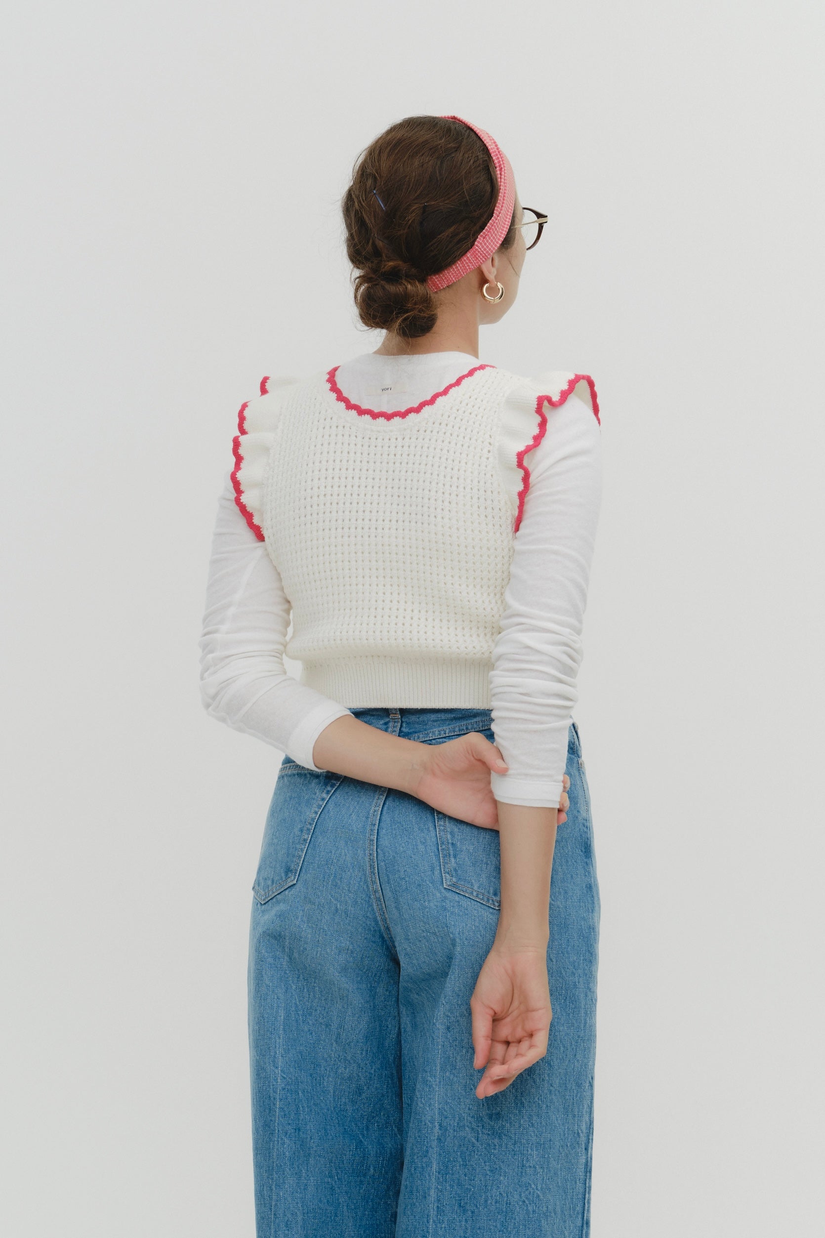 The mini gilet stands out with its compact size and unique design. Featuring scalloped accents with contrasting colors, it embodies the trendy handcrafted feel, uniquely expressed in the yori style. The piece highlights a rustic texture interwoven with intricate patterns and a voluminous, three-dimensional knit. It pairs effortlessly with simple cut-and-sew tops, as well as blouses and dresses for layered styling. A standout addition, this versatile item adds a touch of flair to any outfit. The navy version boasts a chic look with gold lamé accents, while the white version features a playful red contrast, offering two distinct color expressions.