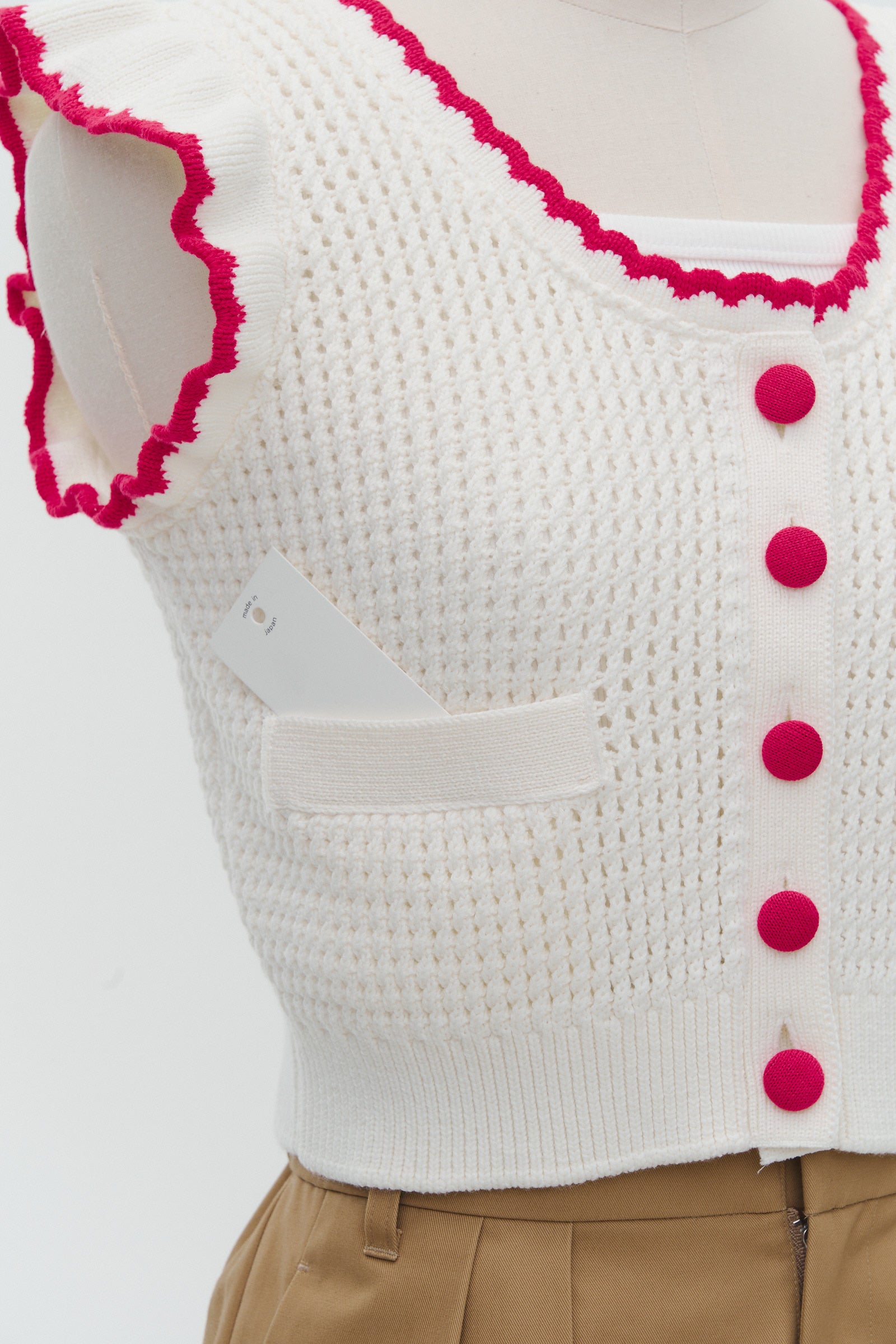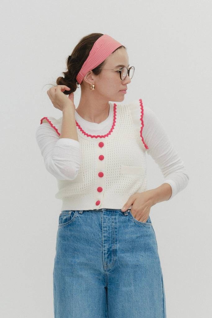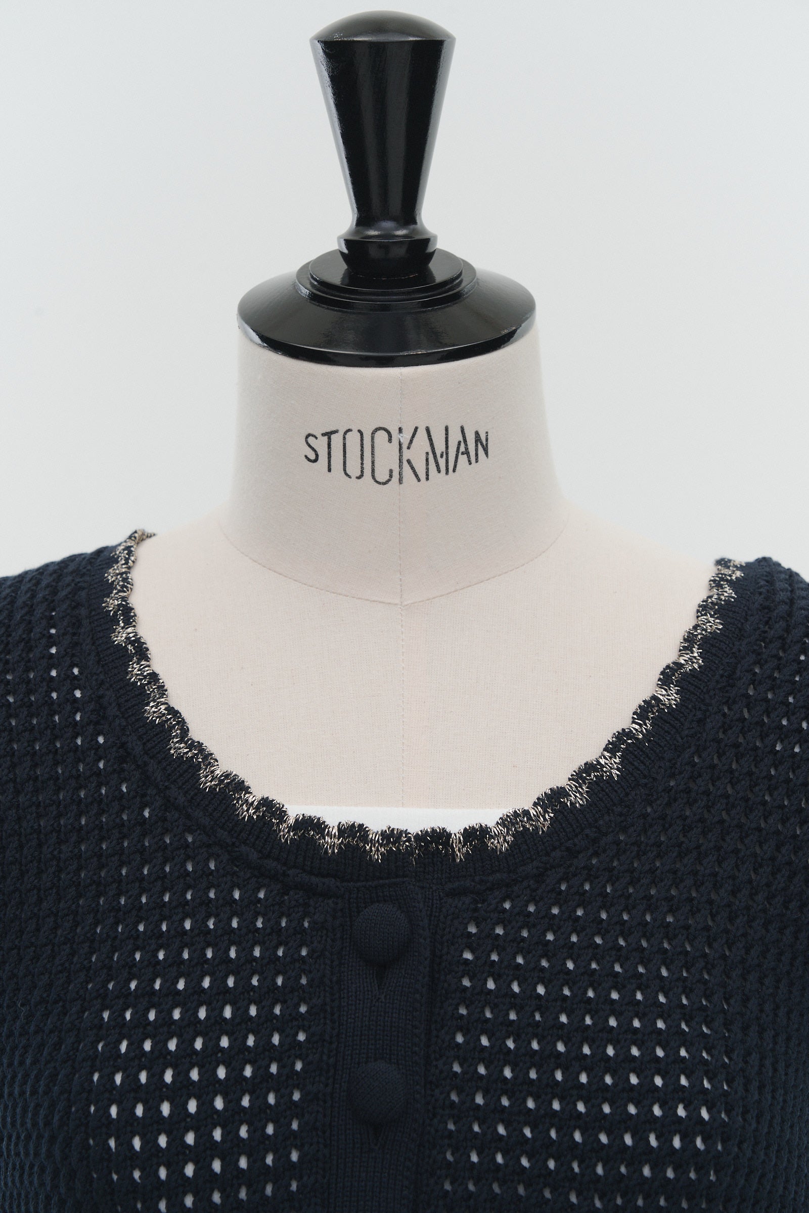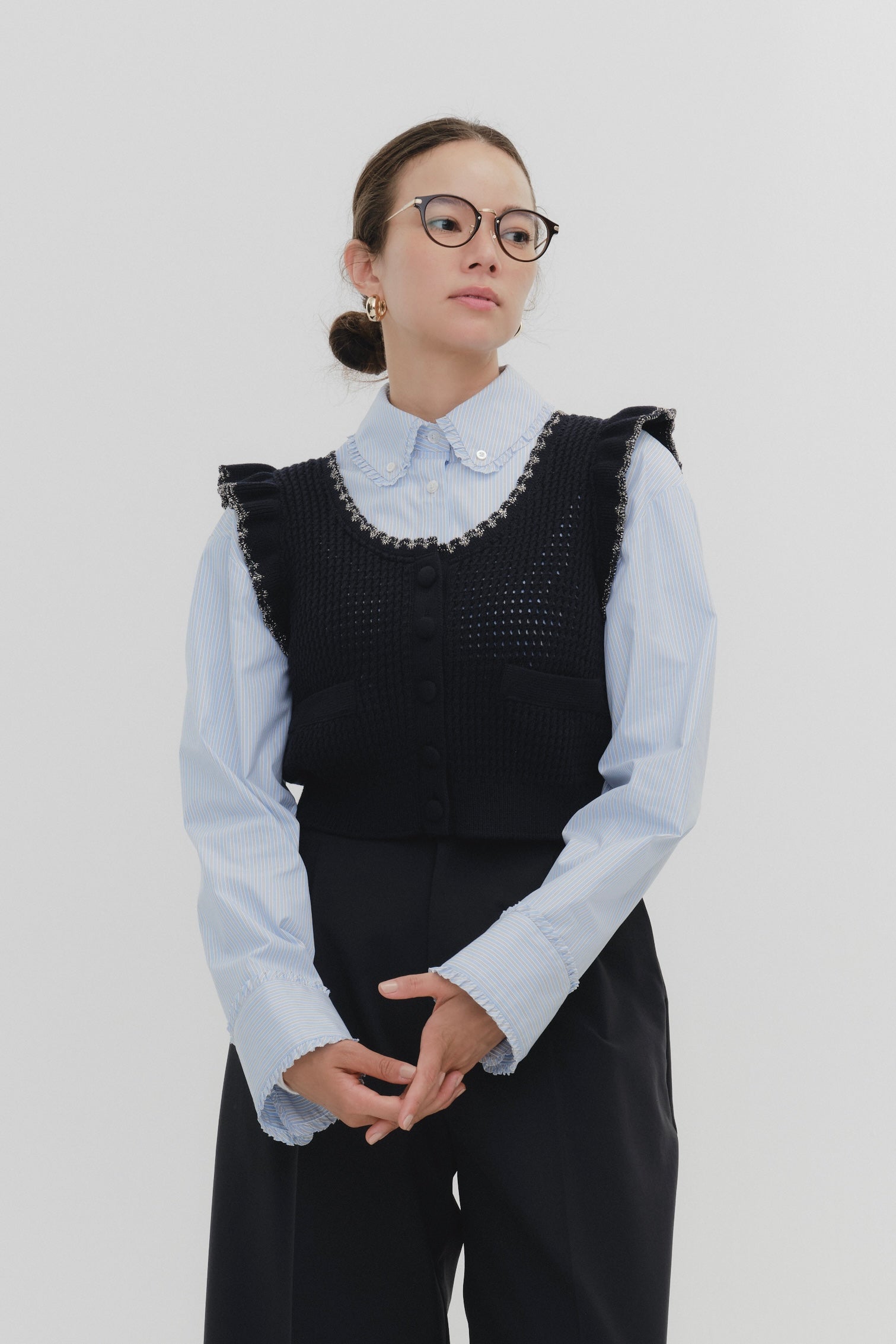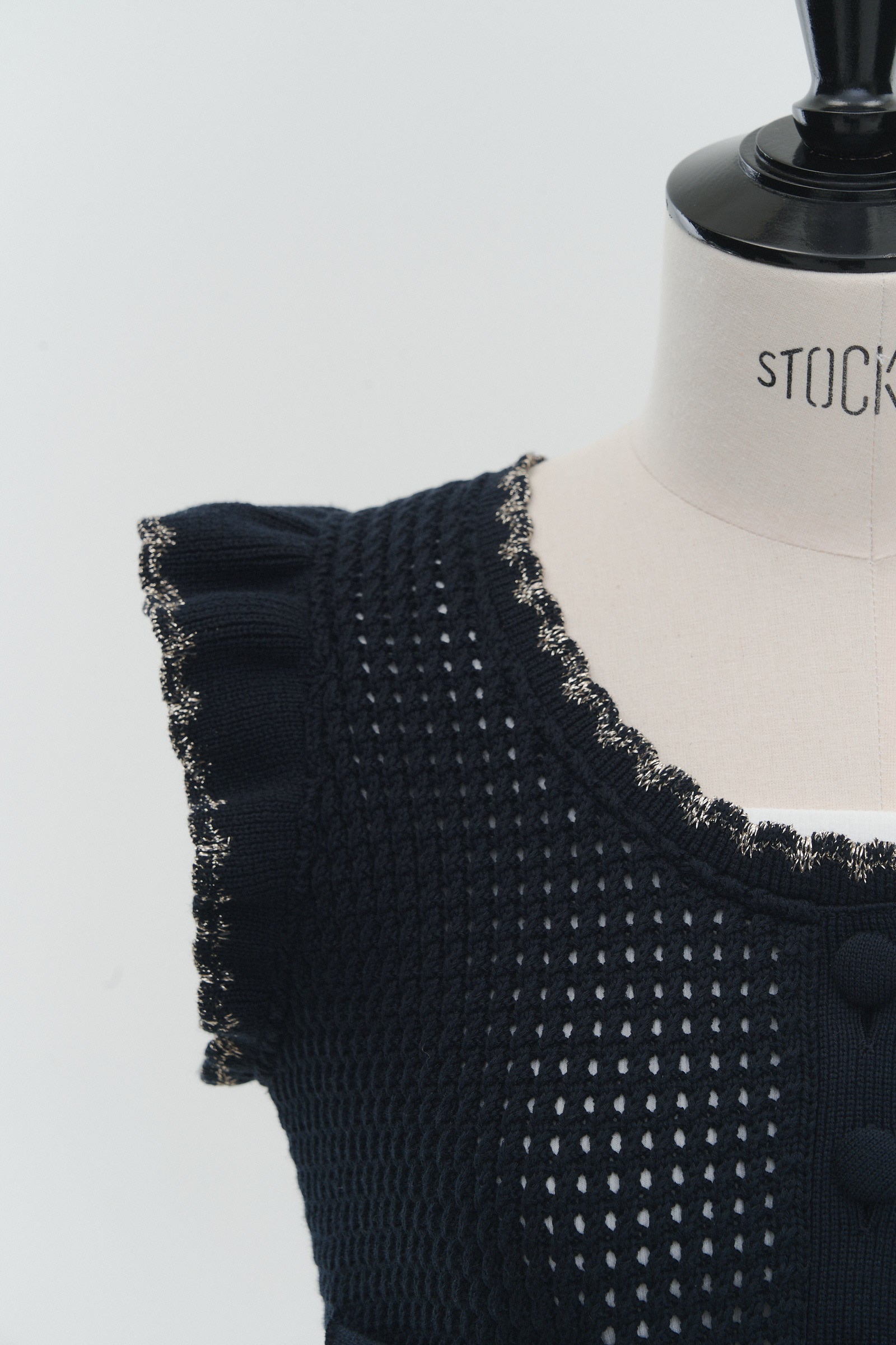 The mini gilet stands out with its compact size and unique design. Featuring scalloped accents with contrasting colors, it embodies the trendy handcrafted feel, uniquely expressed in the yori style. The piece highlights a rustic texture interwoven with intricate patterns and a voluminous, three-dimensional knit. It pairs effortlessly with simple cut-and-sew tops, as well as blouses and dresses for layered styling. A standout addition, this versatile item adds a touch of flair to any outfit. The navy version boasts a chic look with gold lamé accents, while the white version features a playful red contrast, offering two distinct color expressions.