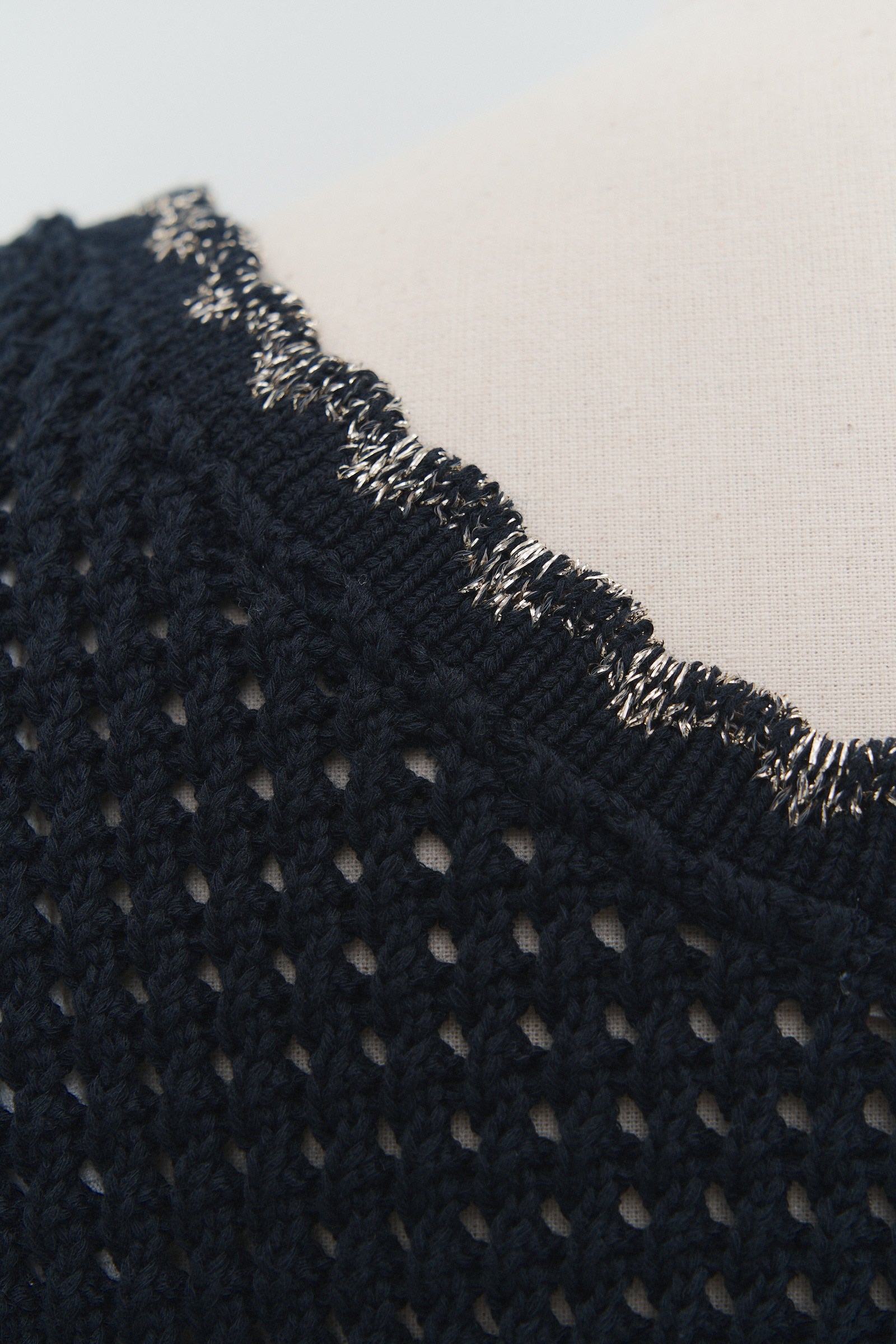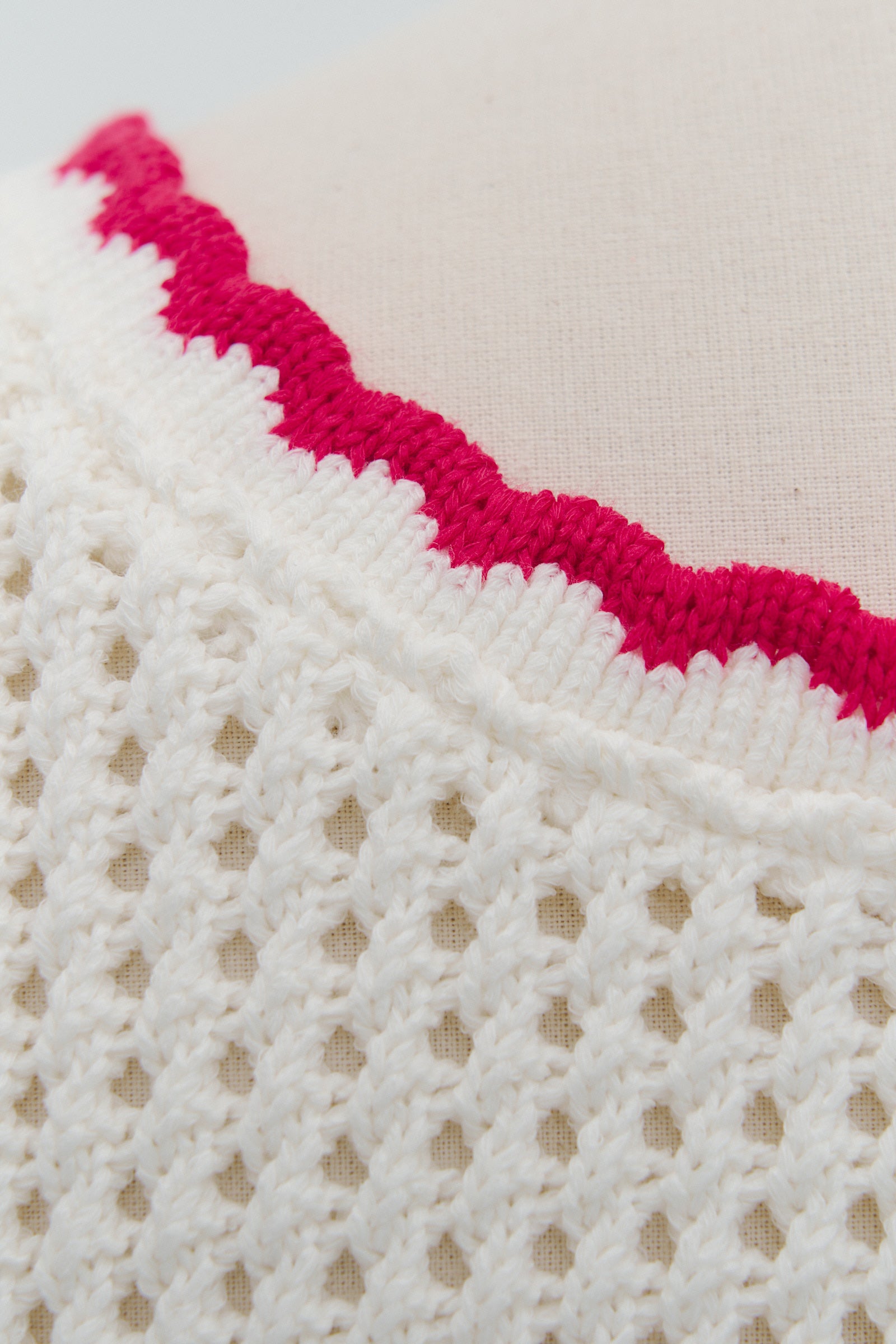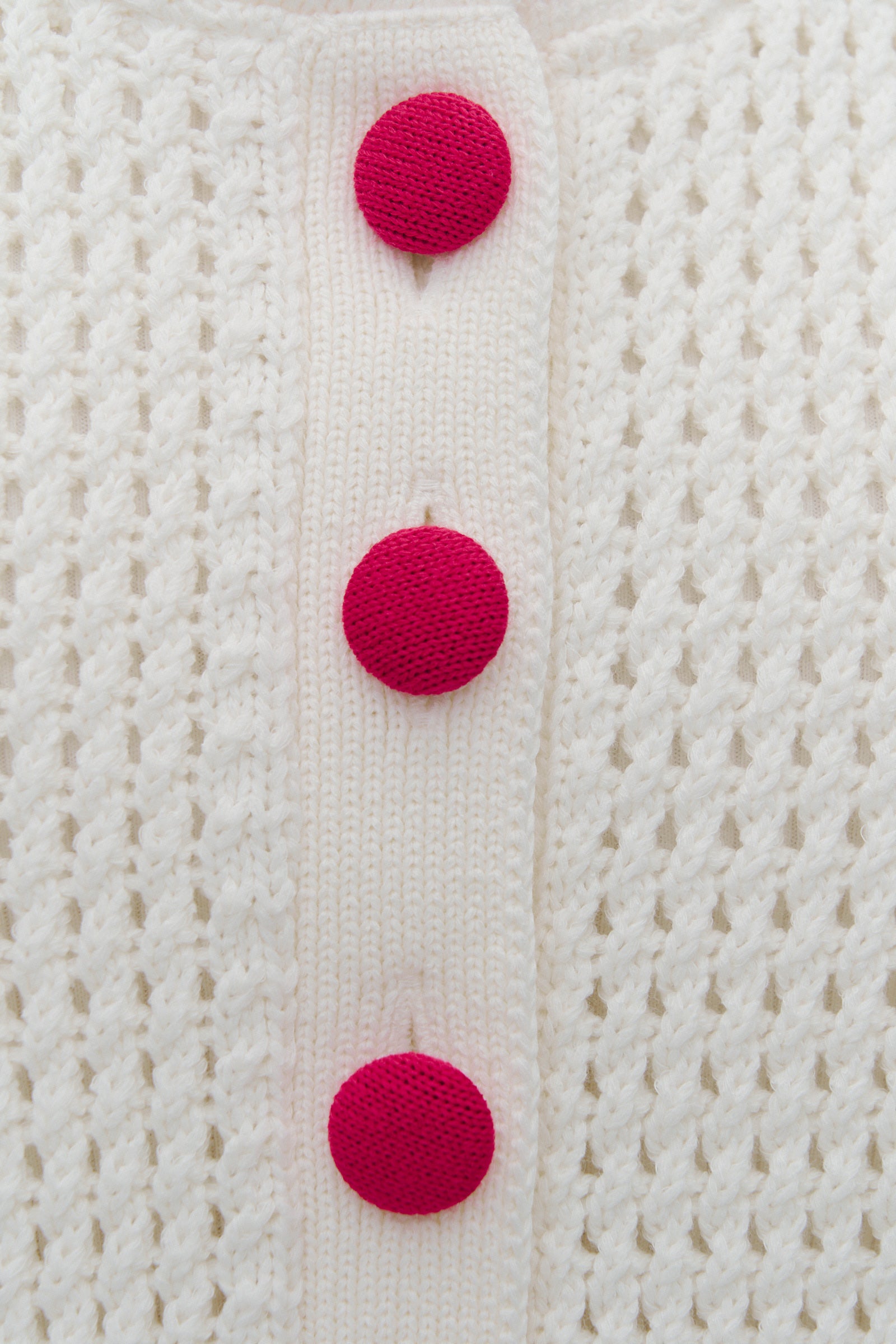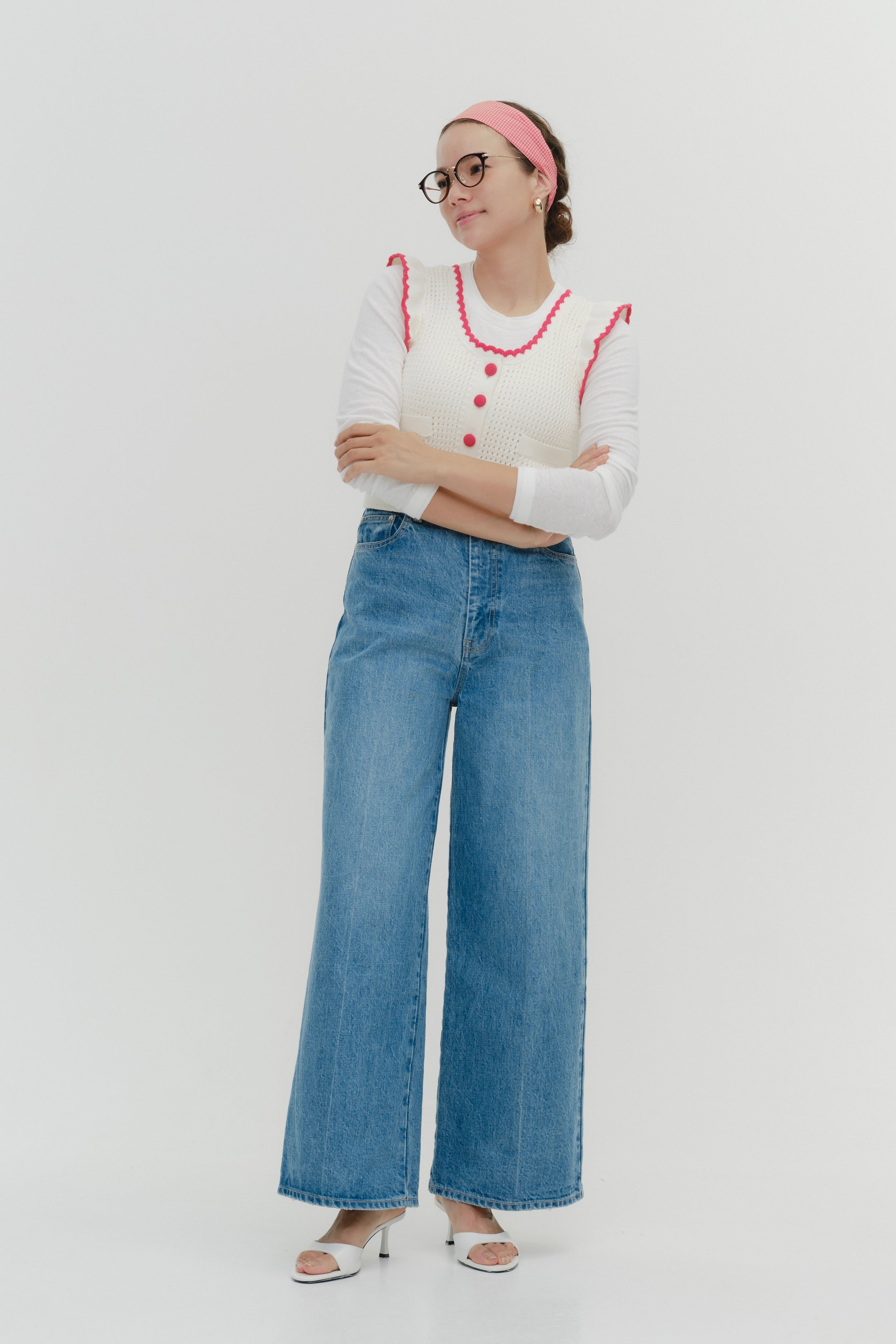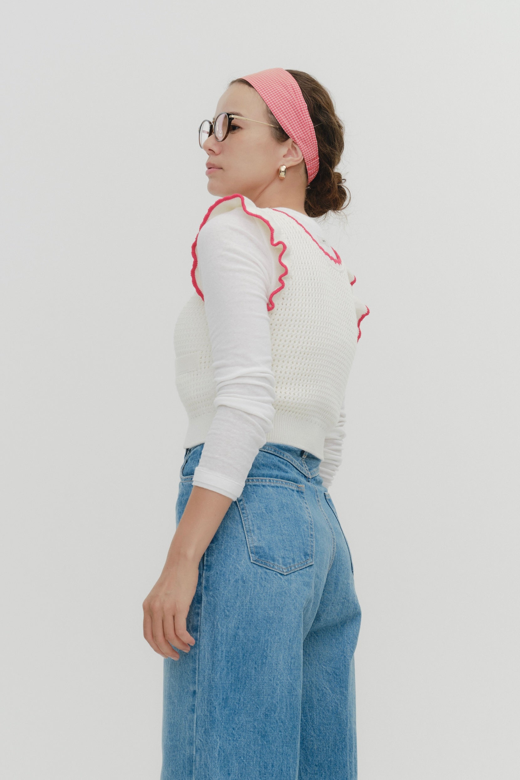 The mini gilet stands out with its compact size and unique design. Featuring scalloped accents with contrasting colors, it embodies the trendy handcrafted feel, uniquely expressed in the yori style. The piece highlights a rustic texture interwoven with intricate patterns and a voluminous, three-dimensional knit. It pairs effortlessly with simple cut-and-sew tops, as well as blouses and dresses for layered styling. A standout addition, this versatile item adds a touch of flair to any outfit. The navy version boasts a chic look with gold lamé accents, while the white version features a playful red contrast, offering two distinct color expressions.