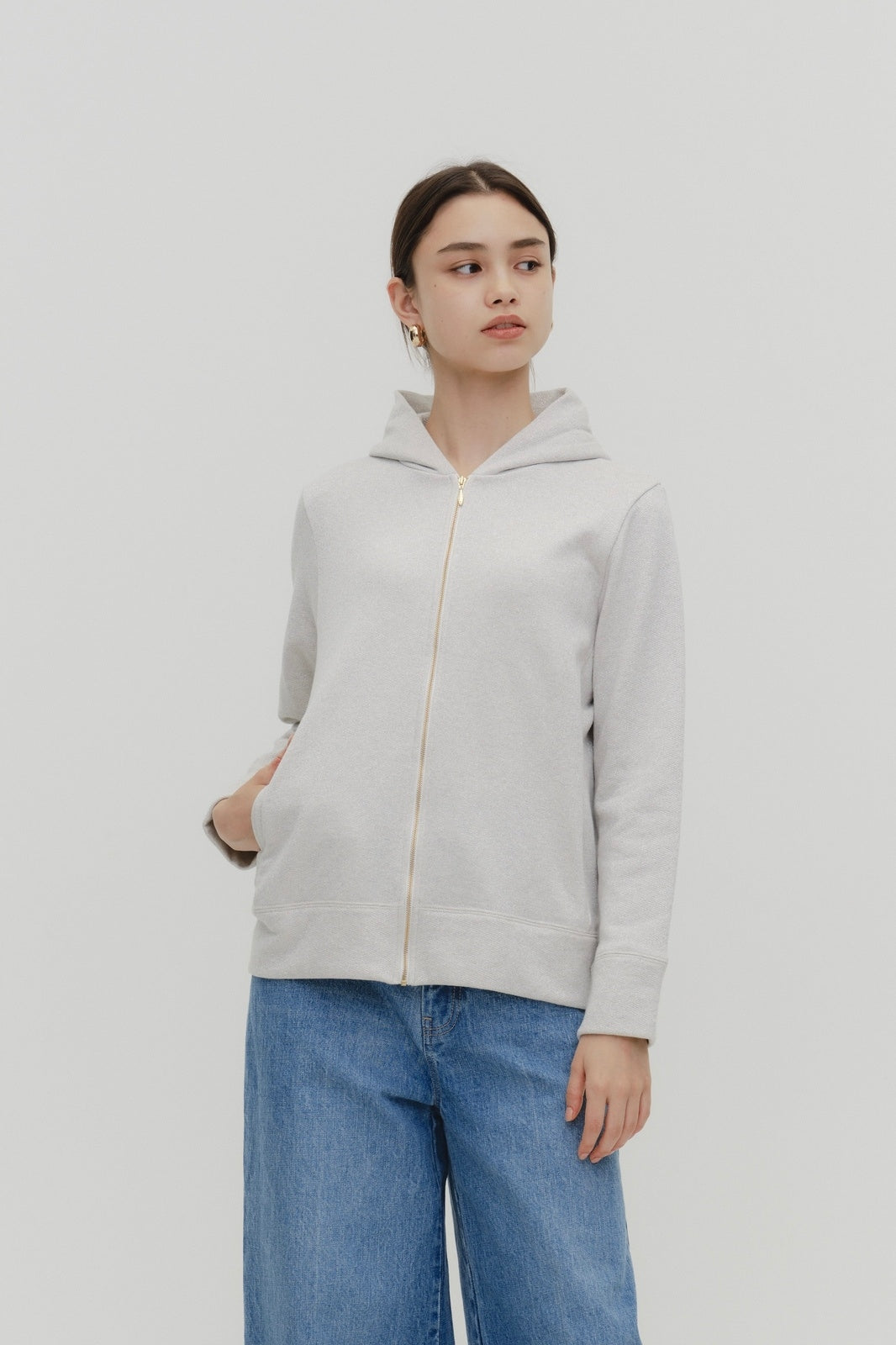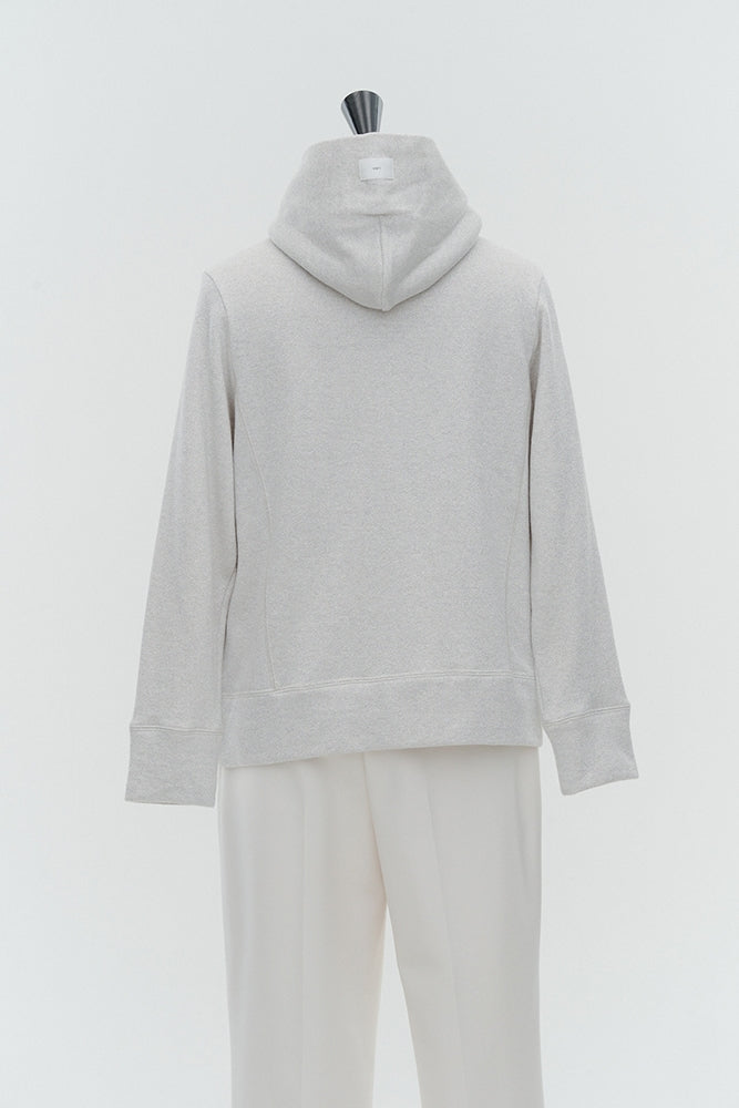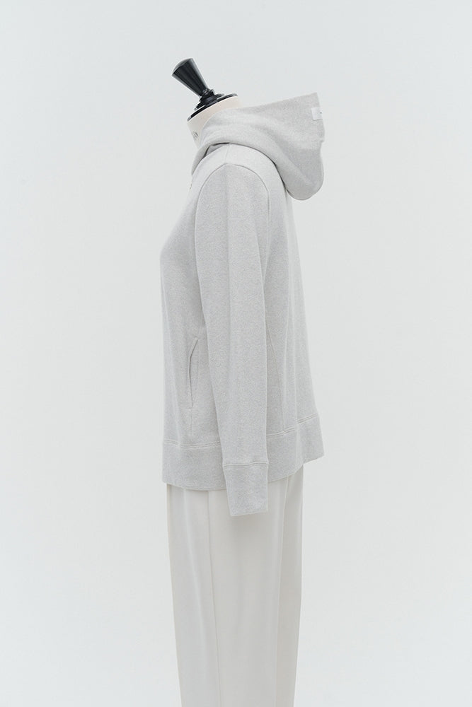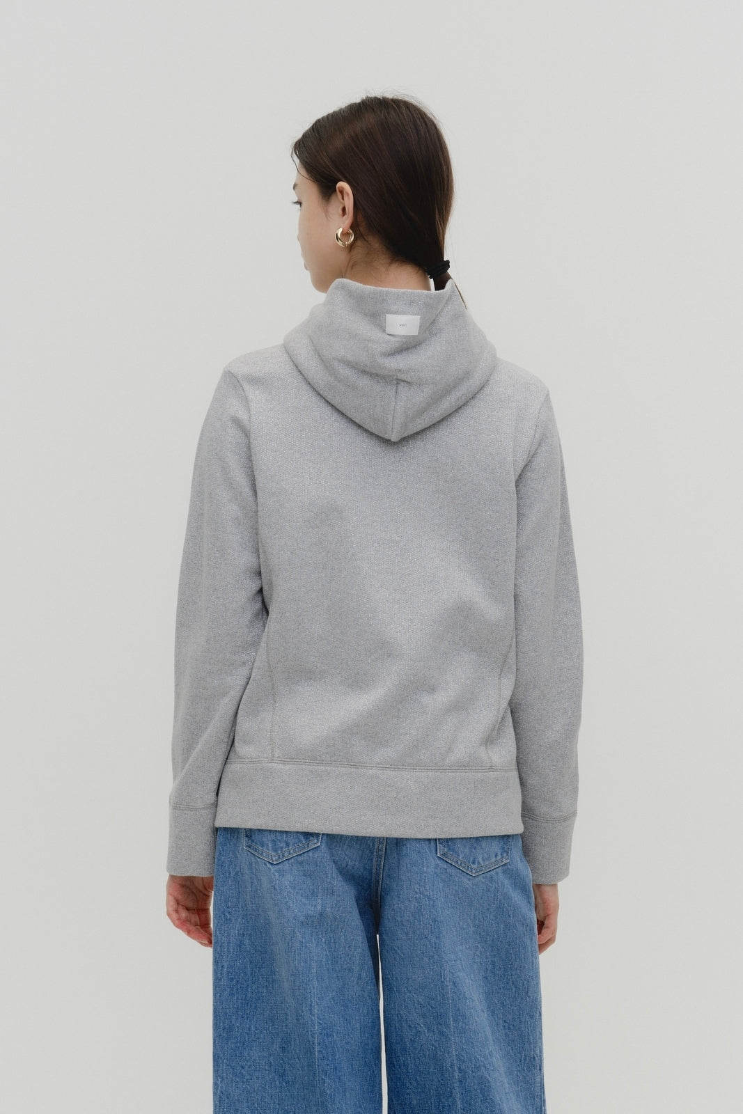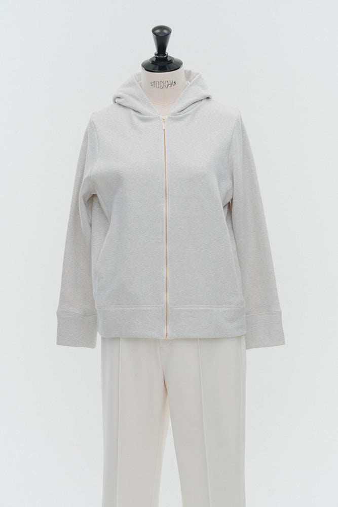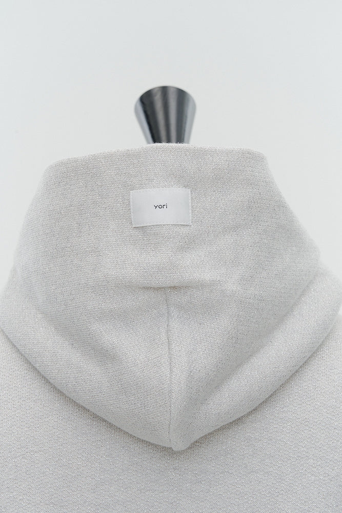 This hoodie is made from loopback fabric blended with subtly shimmering lame thread, adding a refined sparkle to the overall look. Designed with a sleek silhouette and a compact length, it offers a polished, grown-up feel without being overly casual. You can also wear it zipped up like a pullover as an inner layer under a jacket for a chic styling option. The yori brand name on the hood adds a thoughtful touch. Perfect for quick outings, this versatile piece is easy to throw on and is a must-have item for the coming season.
