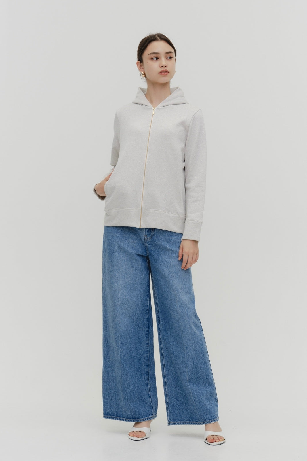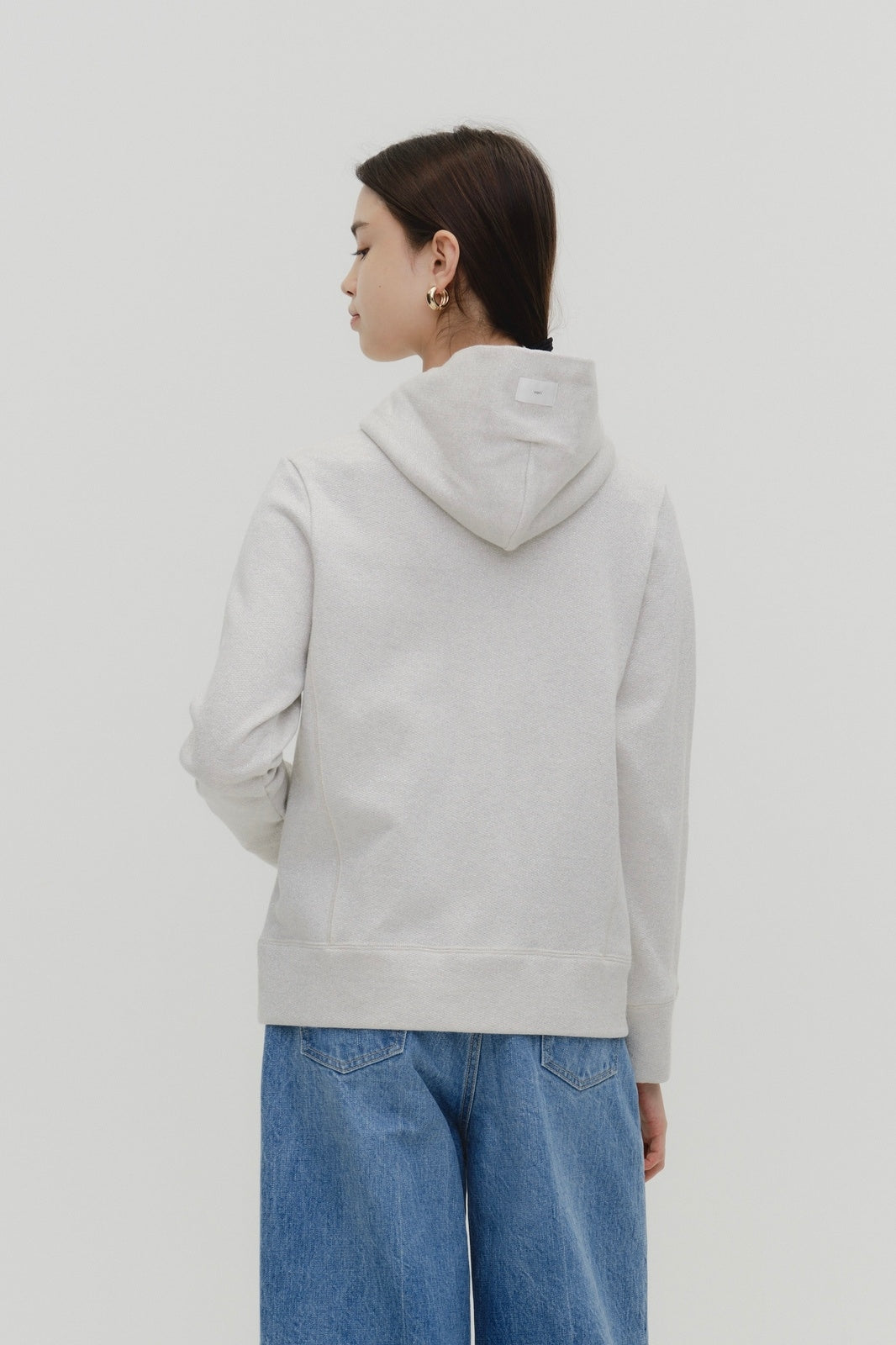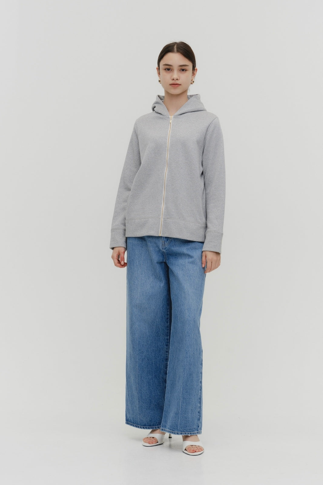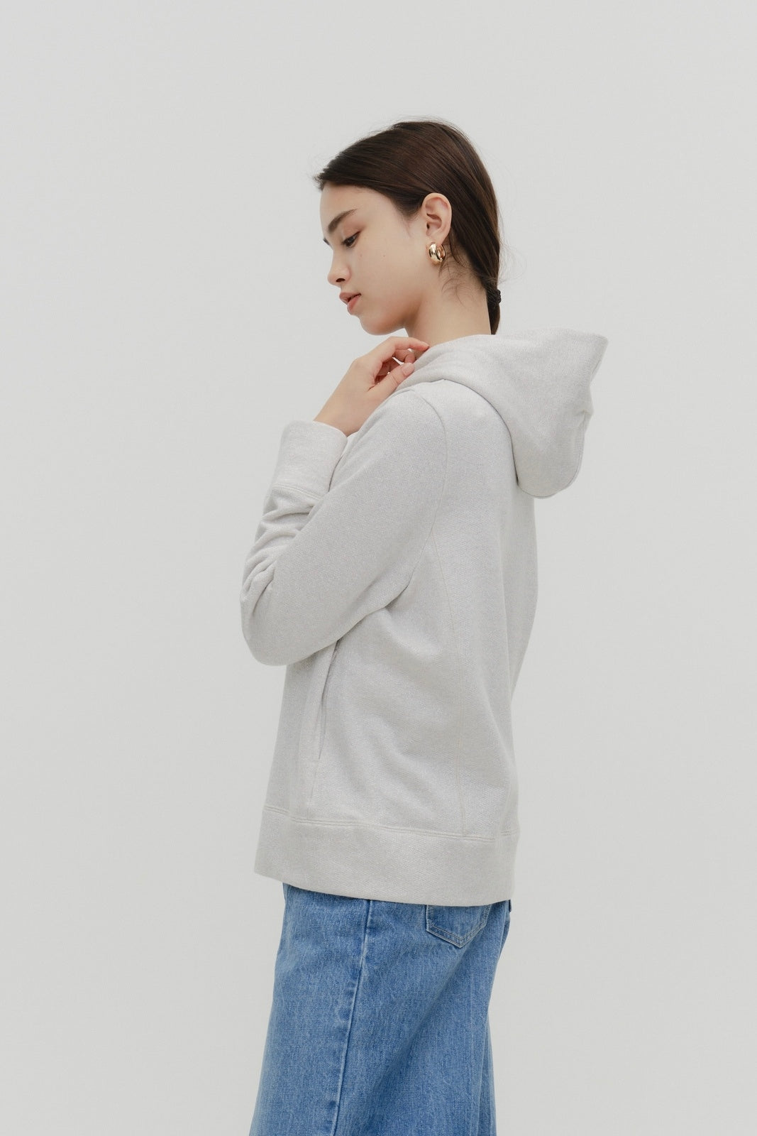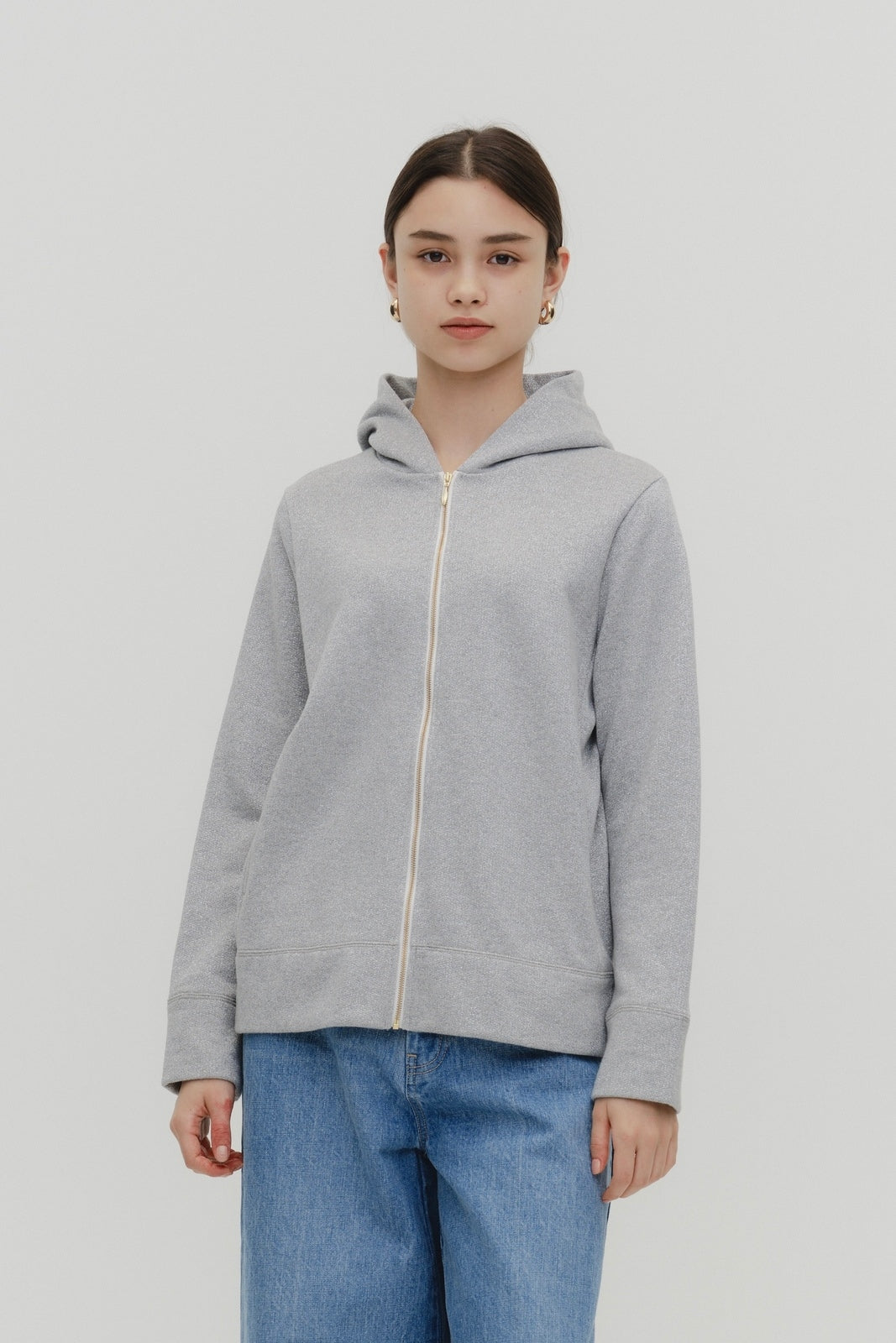 This hoodie is made from loopback fabric blended with subtly shimmering lame thread, adding a refined sparkle to the overall look. Designed with a sleek silhouette and a compact length, it offers a polished, grown-up feel without being overly casual. You can also wear it zipped up like a pullover as an inner layer under a jacket for a chic styling option. The yori brand name on the hood adds a thoughtful touch. Perfect for quick outings, this versatile piece is easy to throw on and is a must-have item for the coming season.