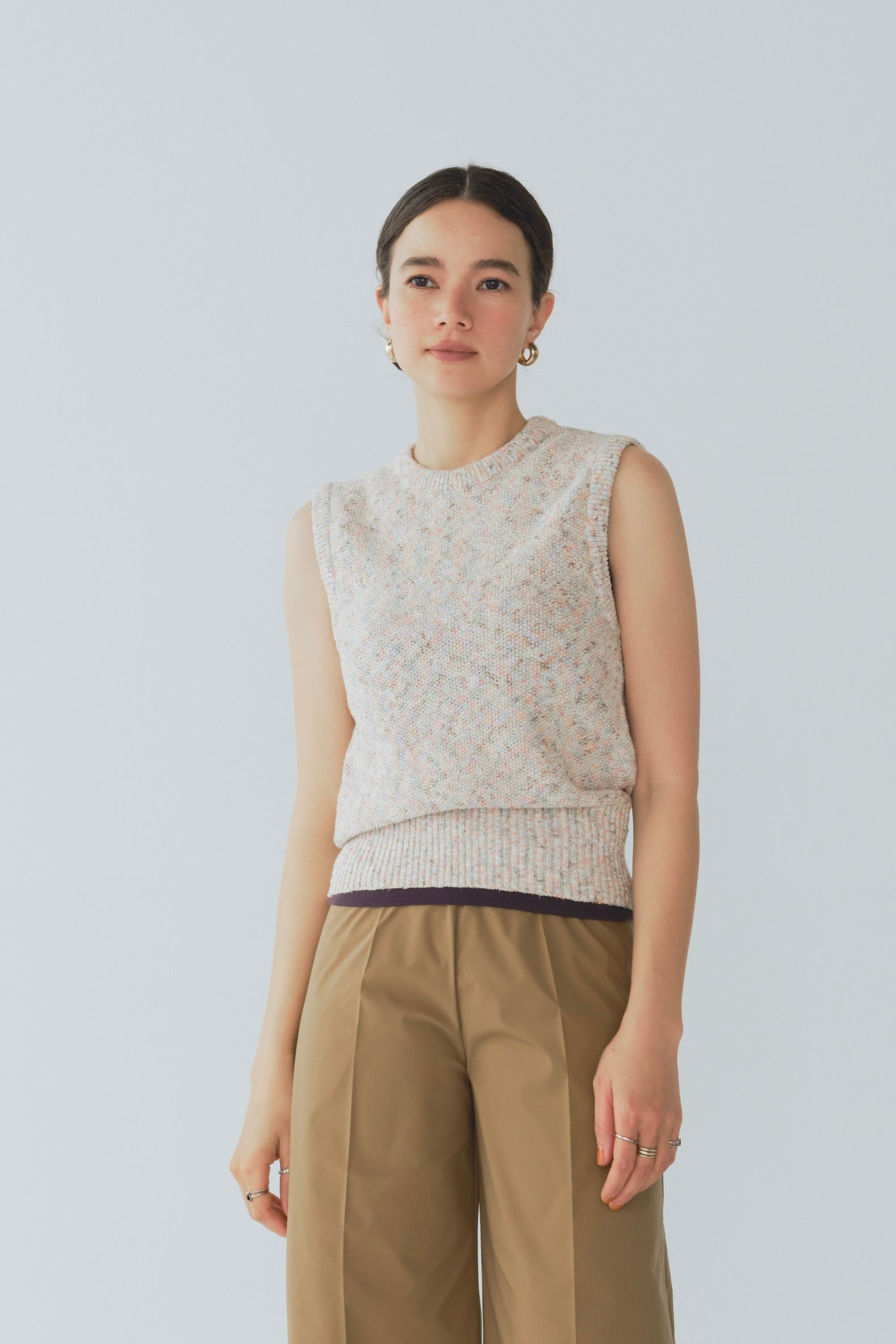 This knit tank top features a unique blend of colors and textures, offering a rich, dimensional look. Its sophisticated design and compact silhouette create a healthy, feminine impression. A subtle V-cut at the back of the neck adds an understated accent to the rear view.