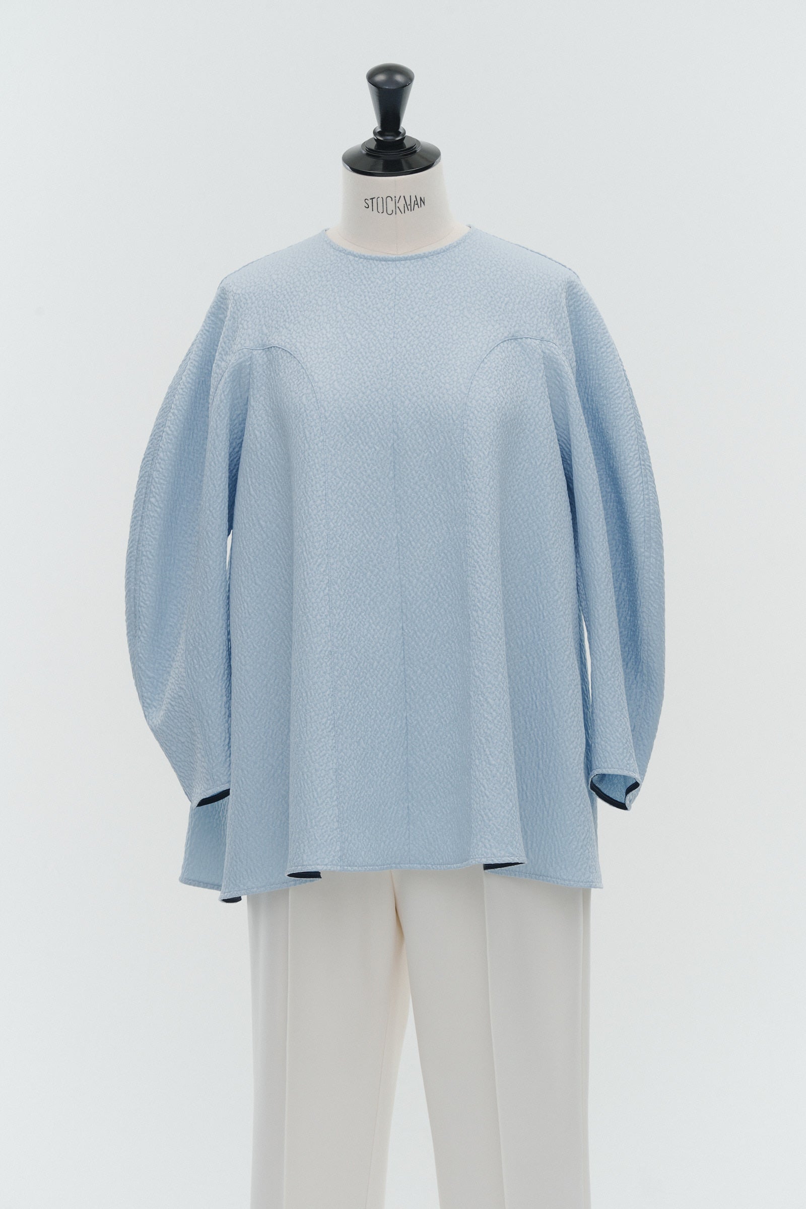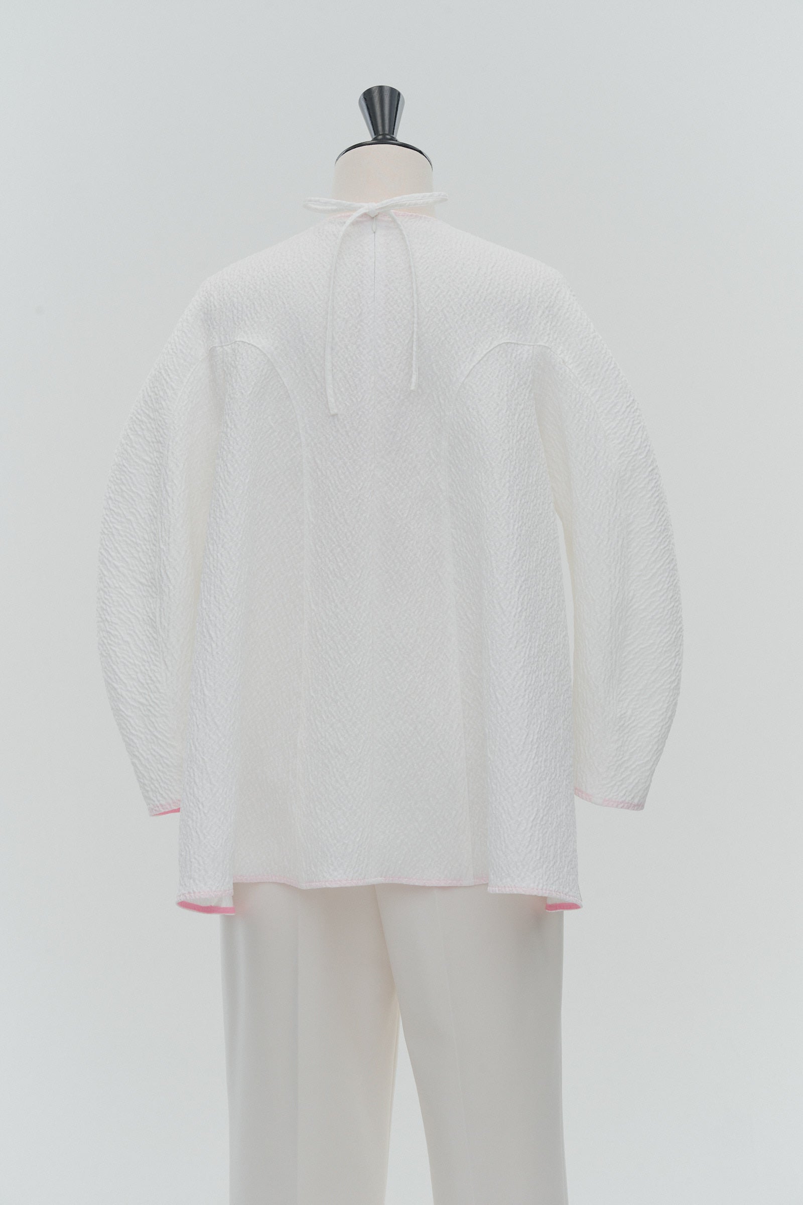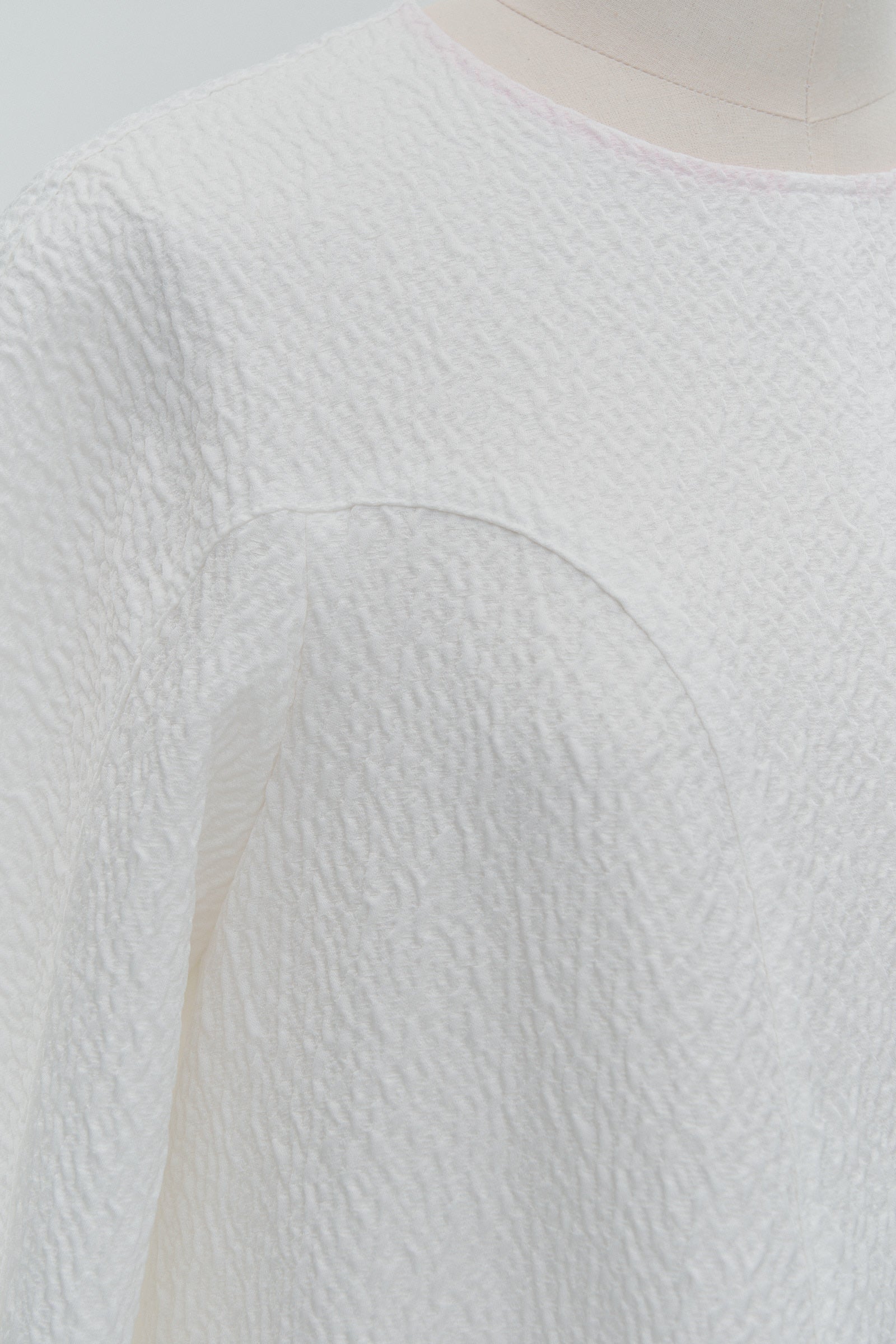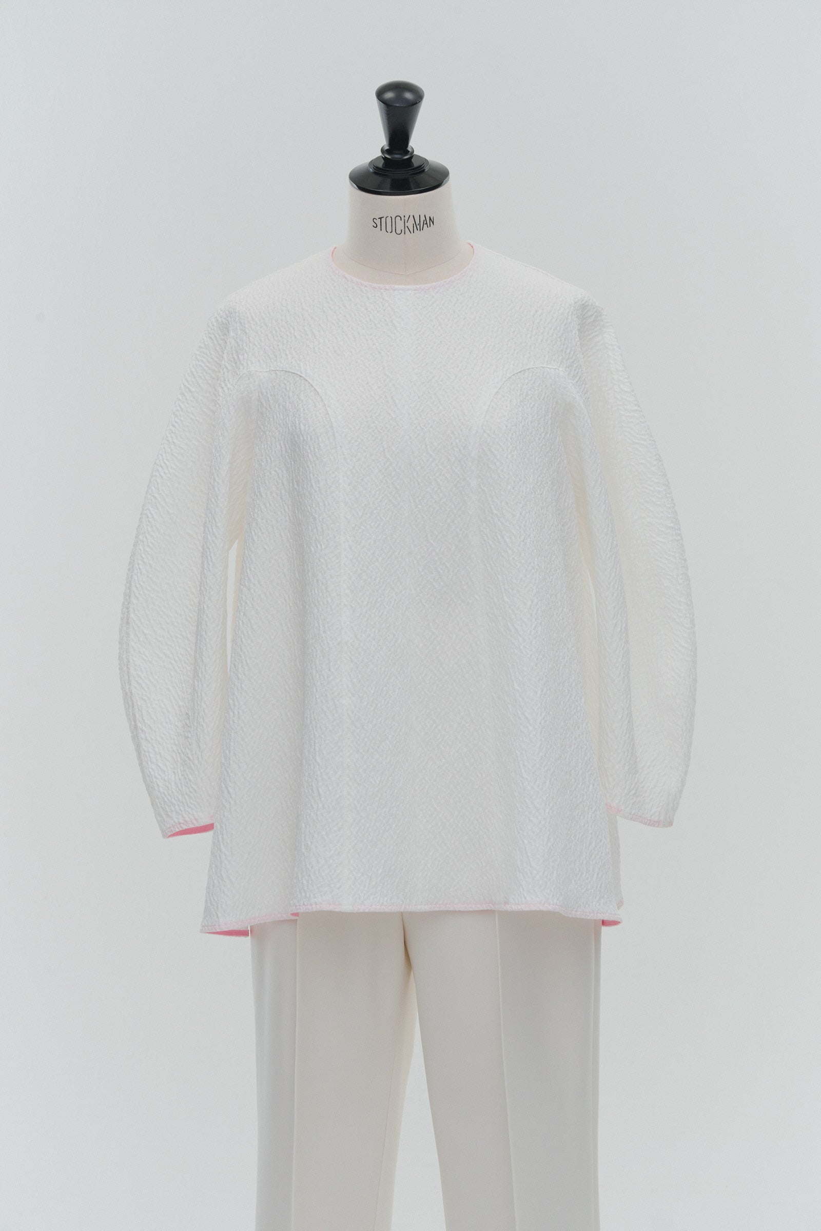 The textured jacquard fabric features a subtle elegance and refined expression. Its lightweight feel and textured material make it perfect for spring and summer, offering a smooth and pleasant touch. The top boasts a gently rounded neckline and an A-line silhouette that flares gracefully toward the hem, achieving an elegant and sophisticated balance. A unique design detail is the curved seam lines that flow from the sleeve ends to the hem, creating a circular effect. The accents of color visible at the neckline, cuffs, and hem add a charming touch when in motion. For the sheer white option, a pink lining is added, while the opaque blue features a navy lining.