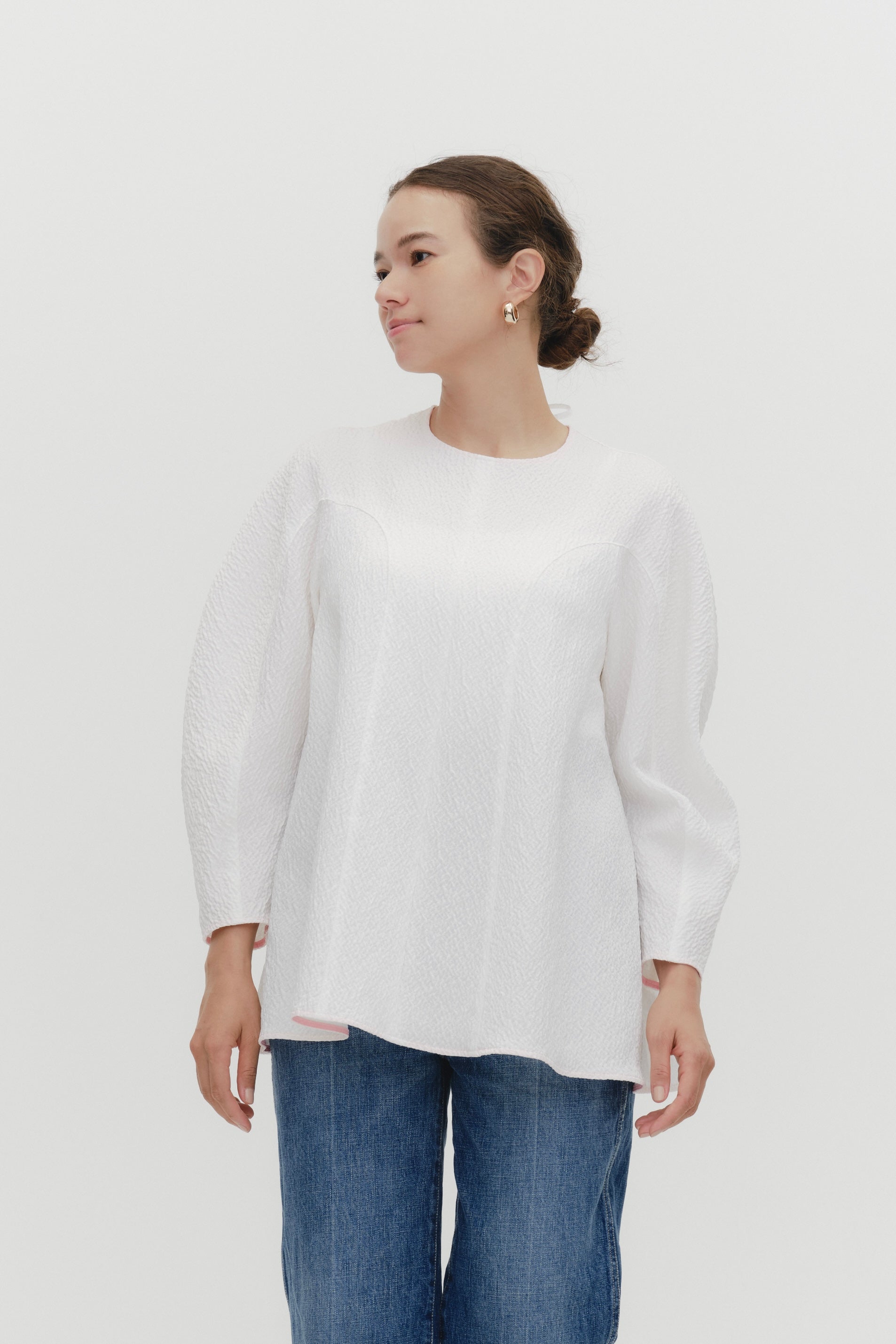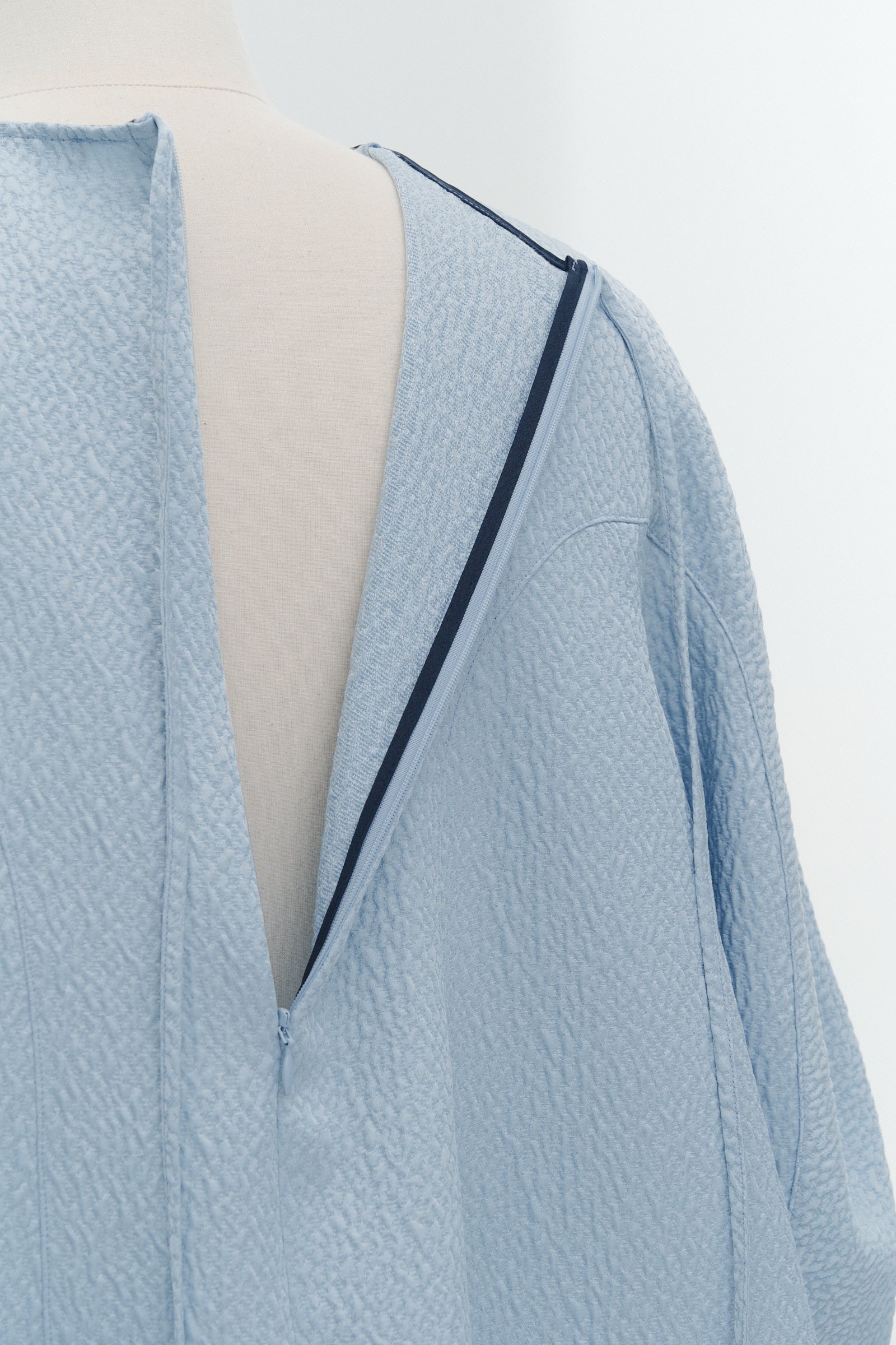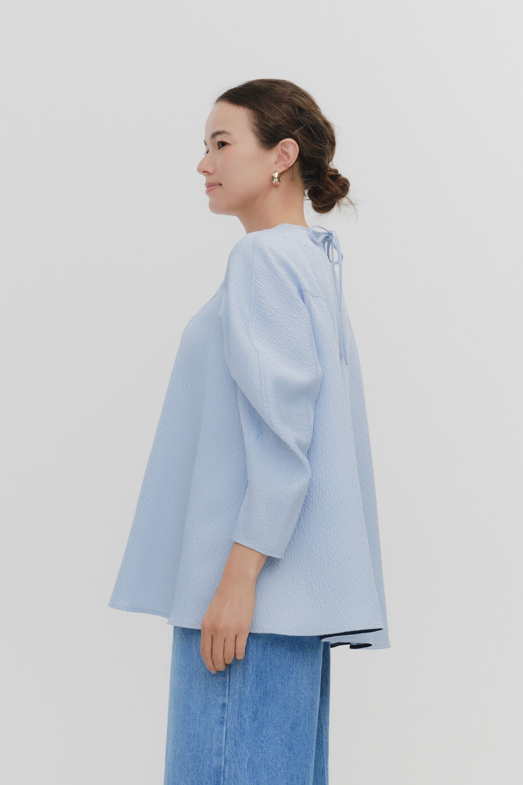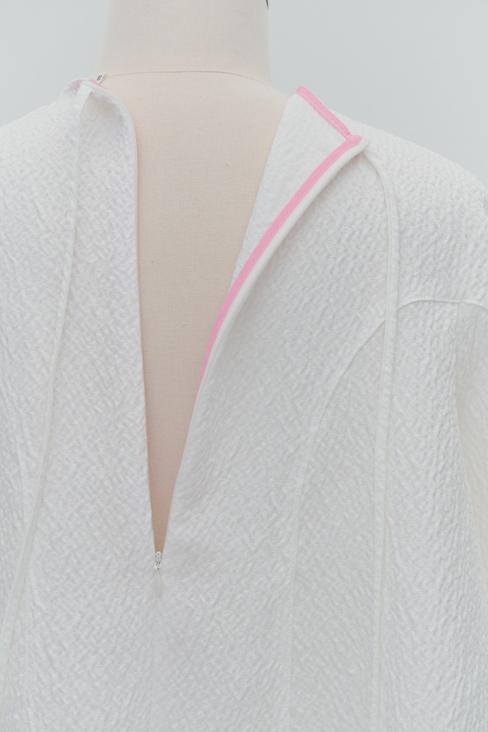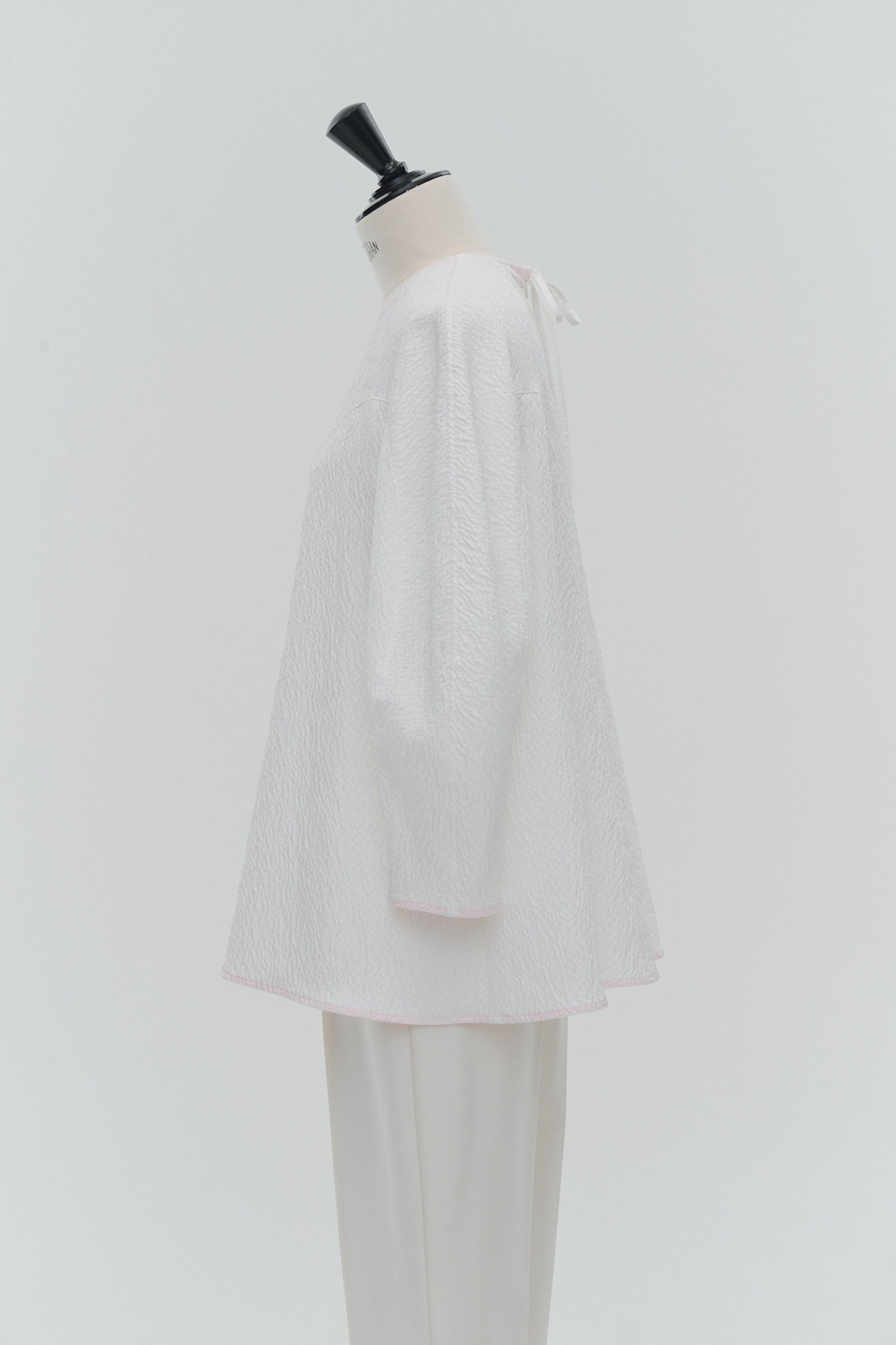 The textured jacquard fabric features a subtle elegance and refined expression. Its lightweight feel and textured material make it perfect for spring and summer, offering a smooth and pleasant touch. The top boasts a gently rounded neckline and an A-line silhouette that flares gracefully toward the hem, achieving an elegant and sophisticated balance. A unique design detail is the curved seam lines that flow from the sleeve ends to the hem, creating a circular effect. The accents of color visible at the neckline, cuffs, and hem add a charming touch when in motion. For the sheer white option, a pink lining is added, while the opaque blue features a navy lining.