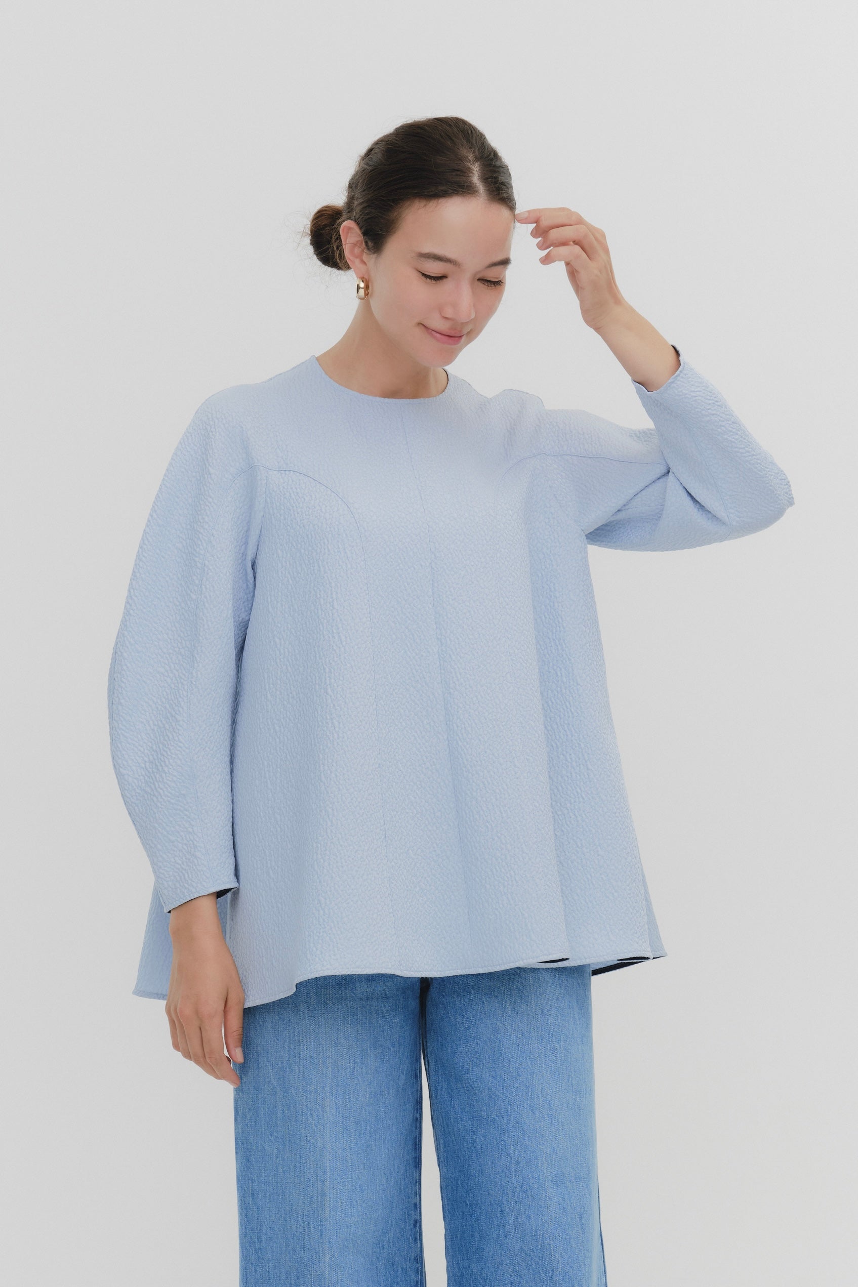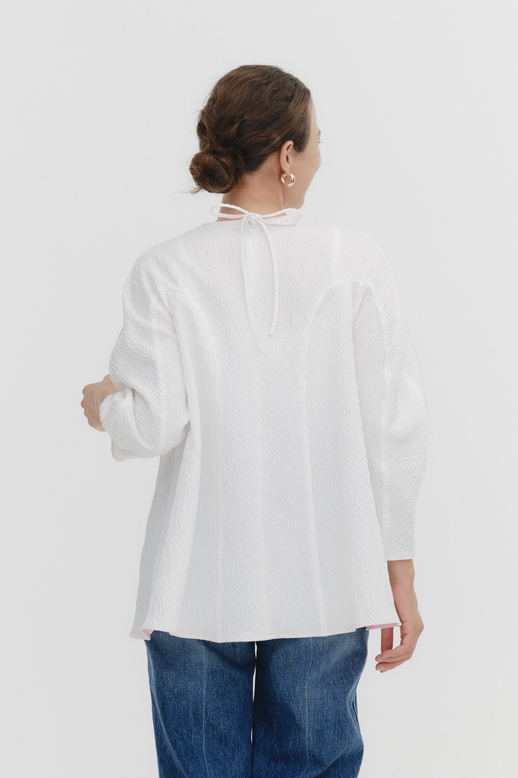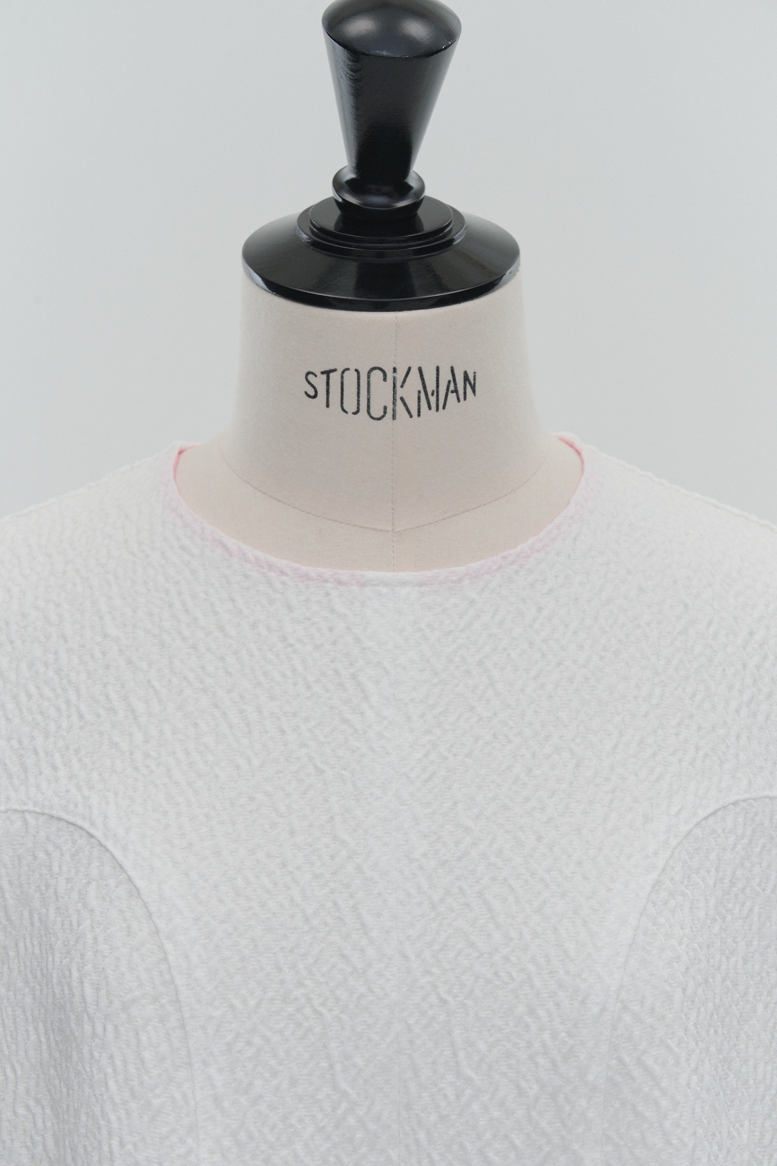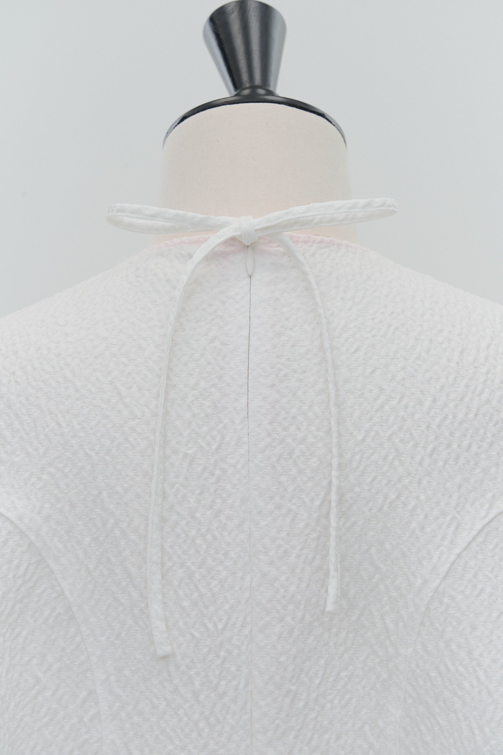 The textured jacquard fabric features a subtle elegance and refined expression. Its lightweight feel and textured material make it perfect for spring and summer, offering a smooth and pleasant touch. The top boasts a gently rounded neckline and an A-line silhouette that flares gracefully toward the hem, achieving an elegant and sophisticated balance. A unique design detail is the curved seam lines that flow from the sleeve ends to the hem, creating a circular effect. The accents of color visible at the neckline, cuffs, and hem add a charming touch when in motion. For the sheer white option, a pink lining is added, while the opaque blue features a navy lining.
