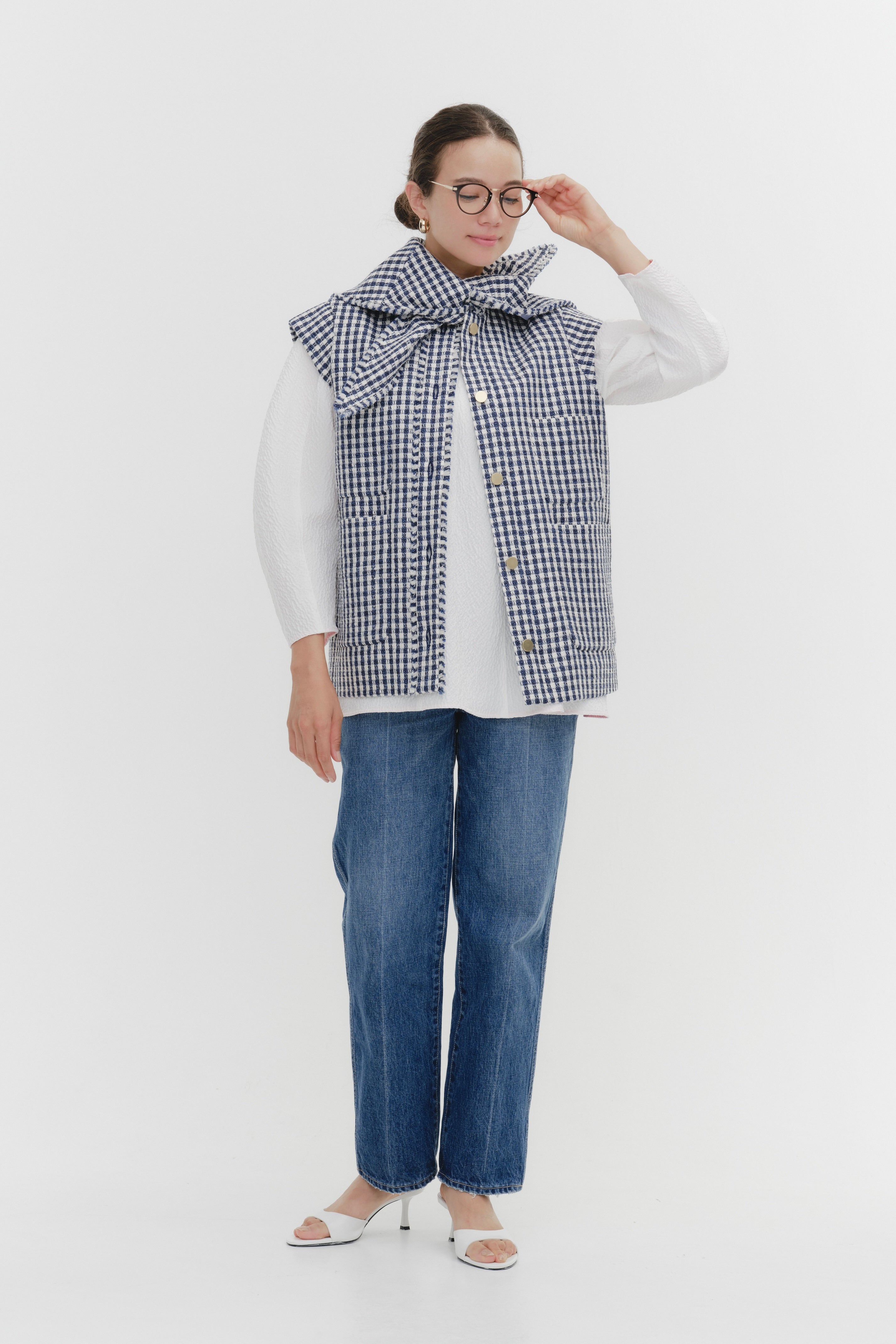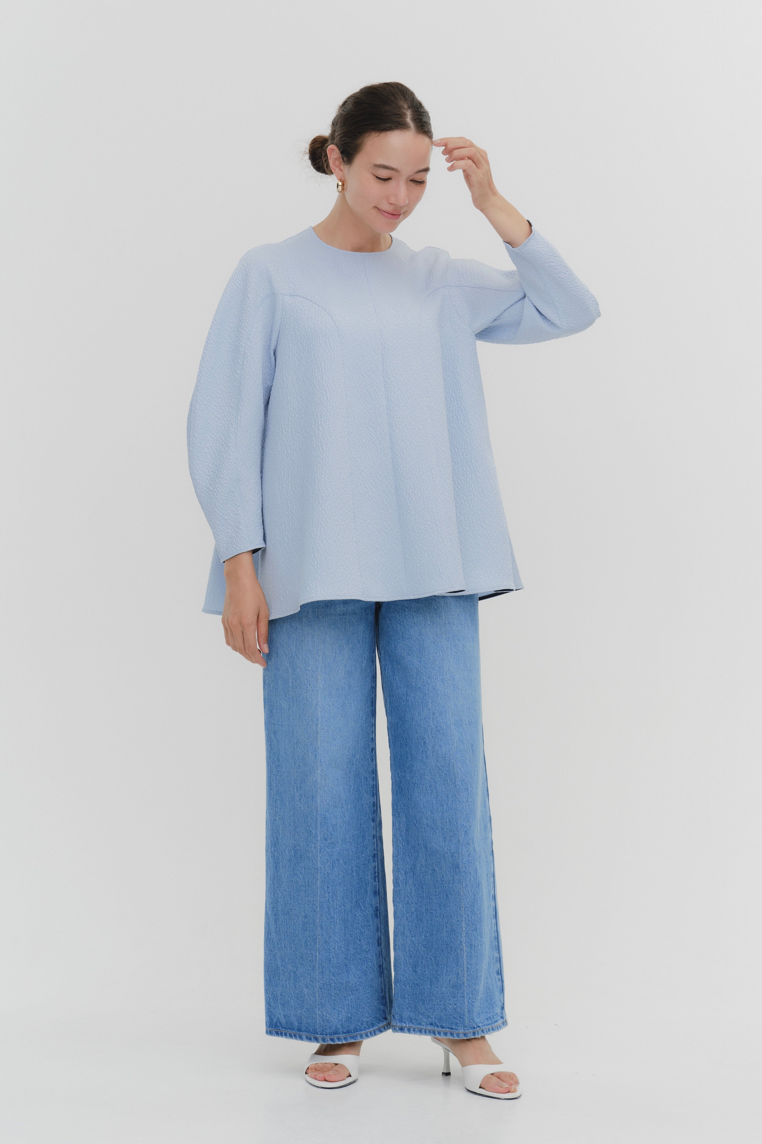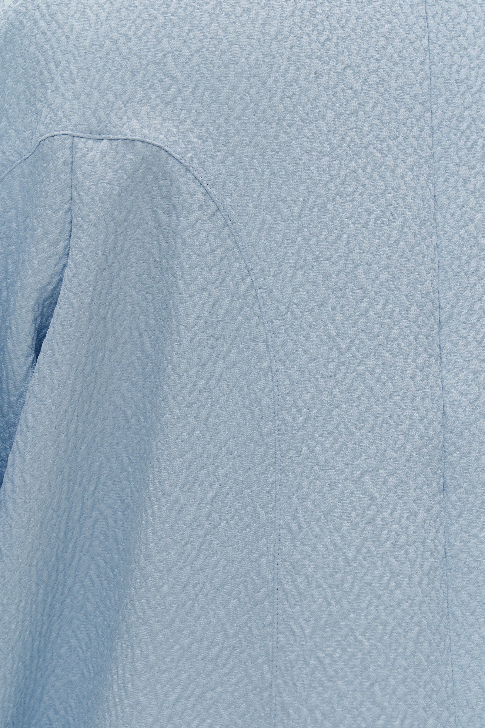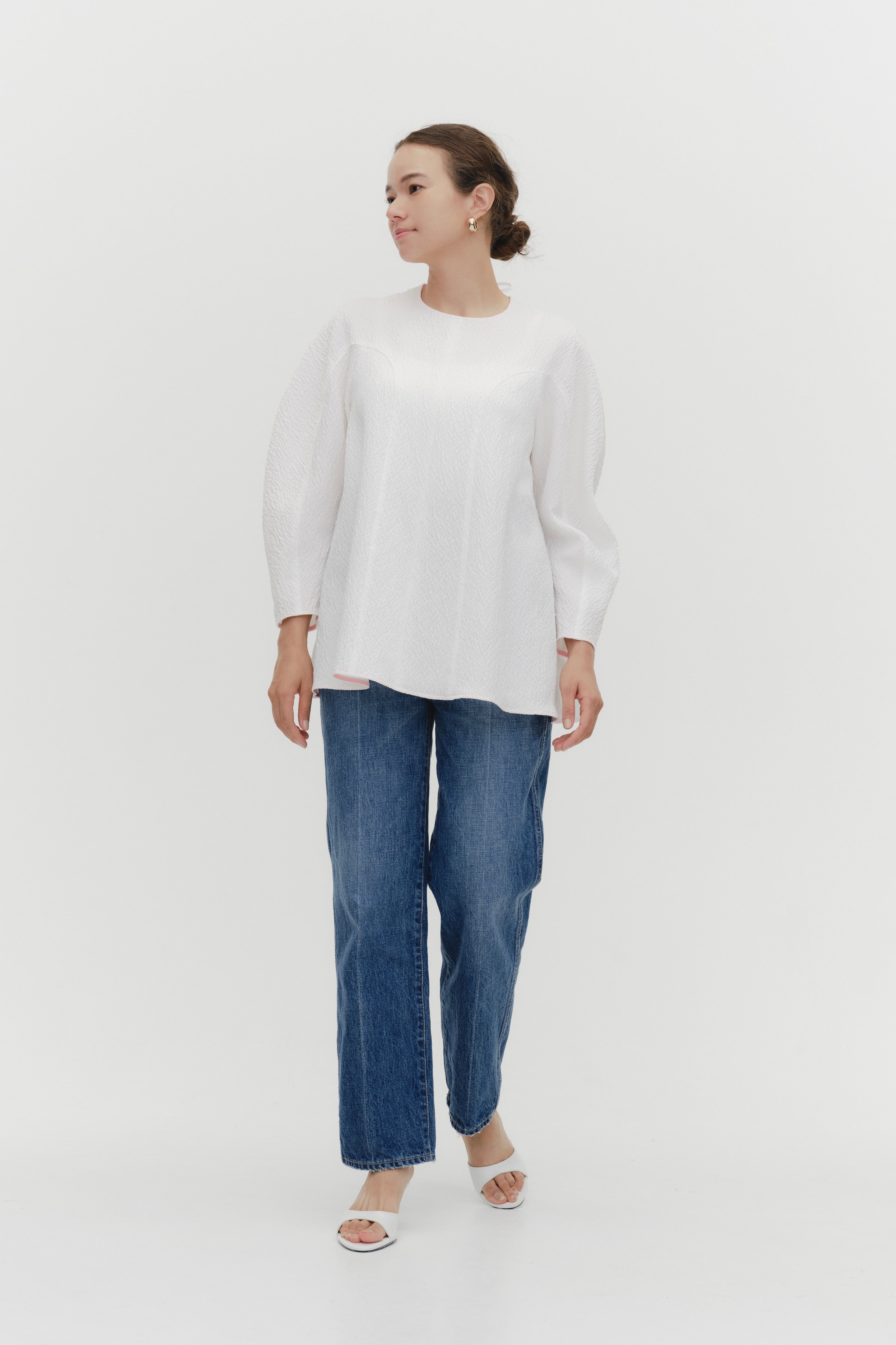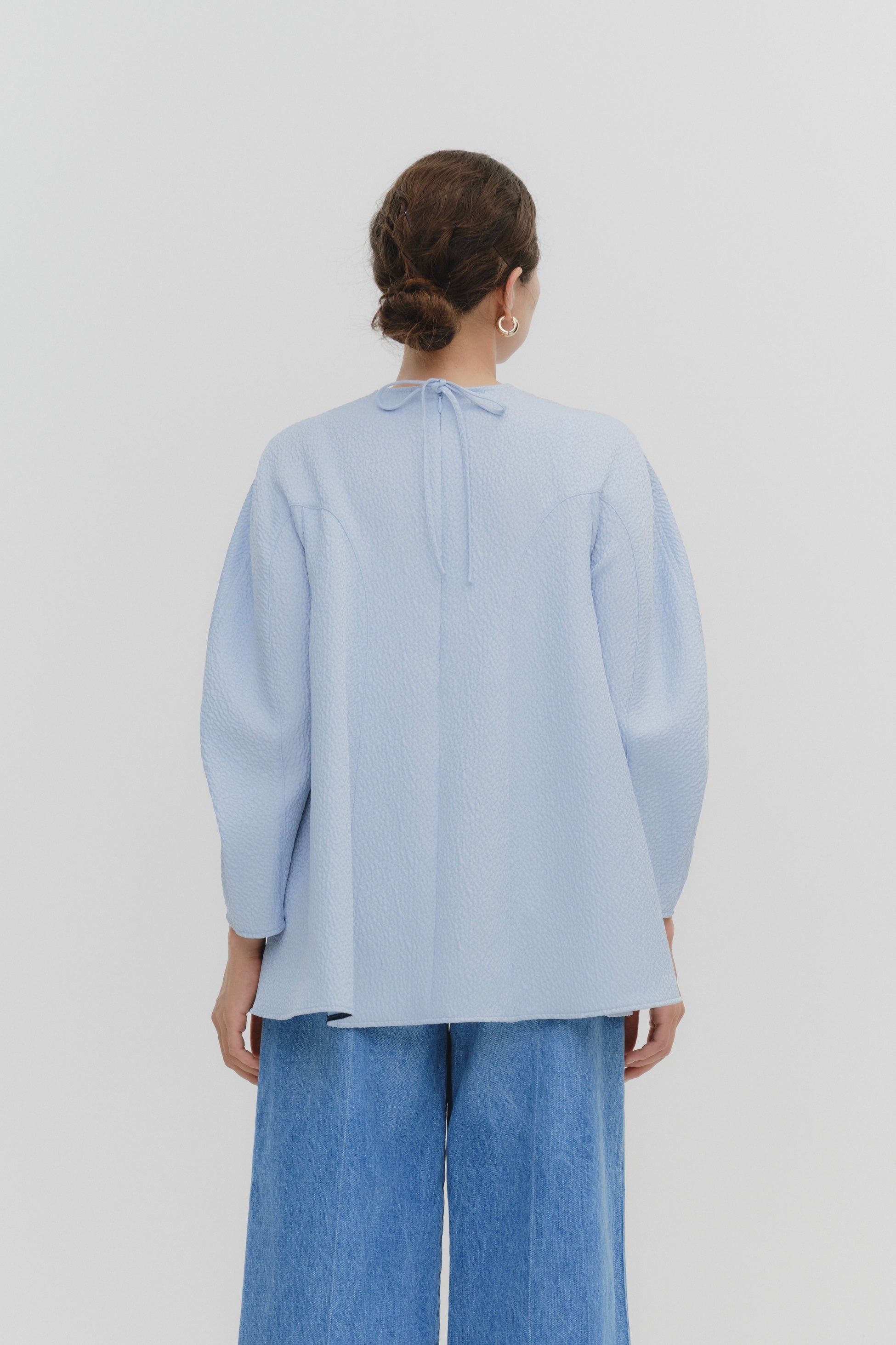The textured jacquard fabric features a subtle elegance and refined expression. Its lightweight feel and textured material make it perfect for spring and summer, offering a smooth and pleasant touch. The top boasts a gently rounded neckline and an A-line silhouette that flares gracefully toward the hem, achieving an elegant and sophisticated balance. A unique design detail is the curved seam lines that flow from the sleeve ends to the hem, creating a circular effect. The accents of color visible at the neckline, cuffs, and hem add a charming touch when in motion. For the sheer white option, a pink lining is added, while the opaque blue features a navy lining.