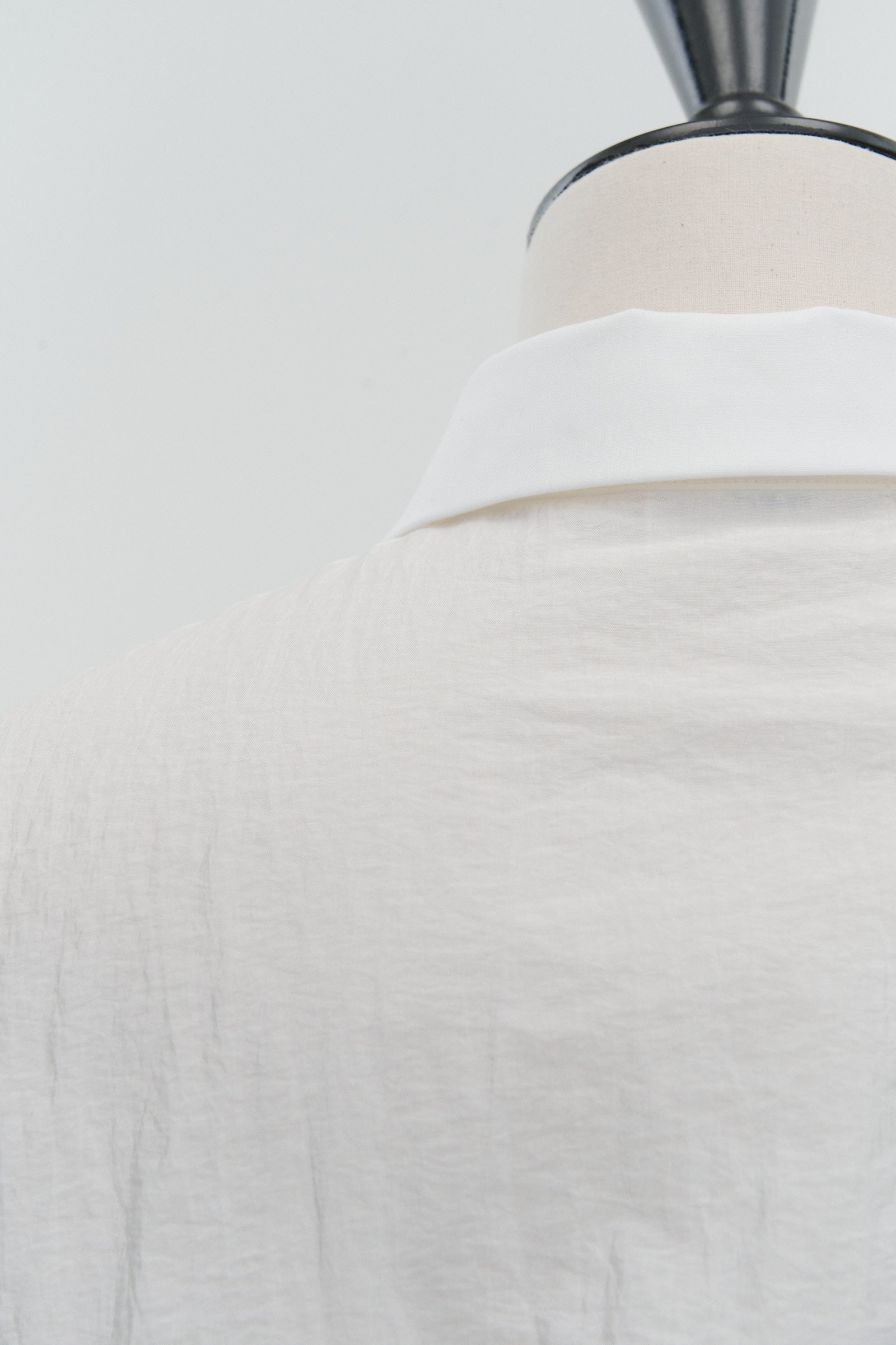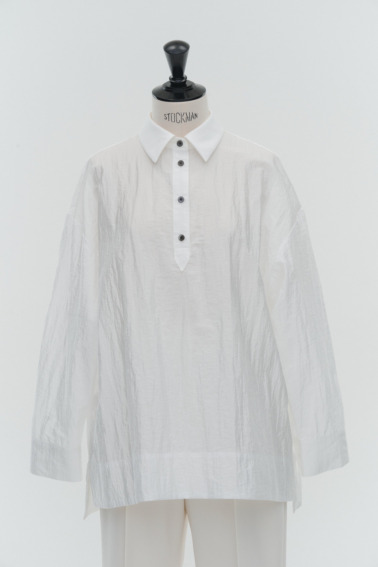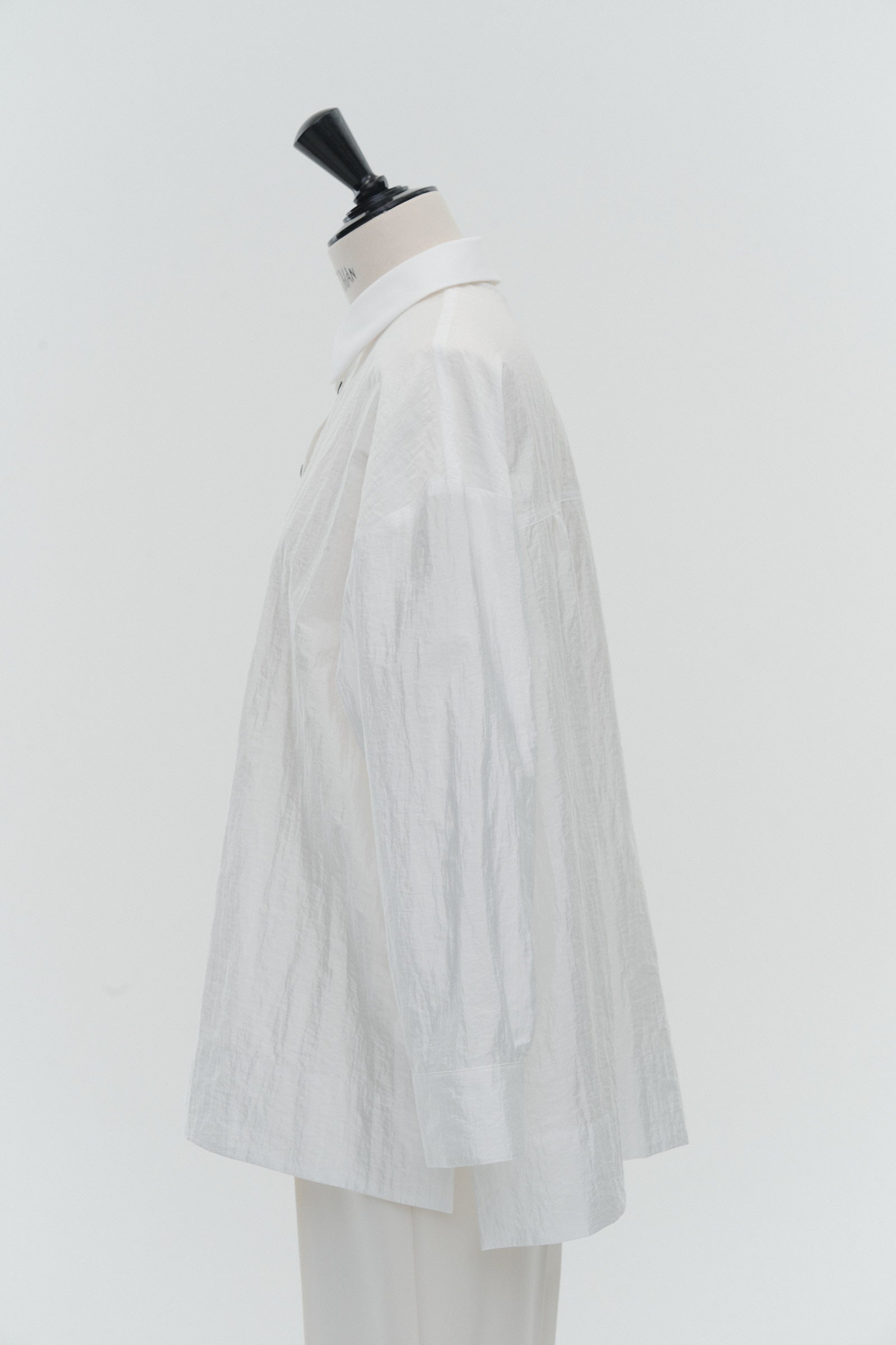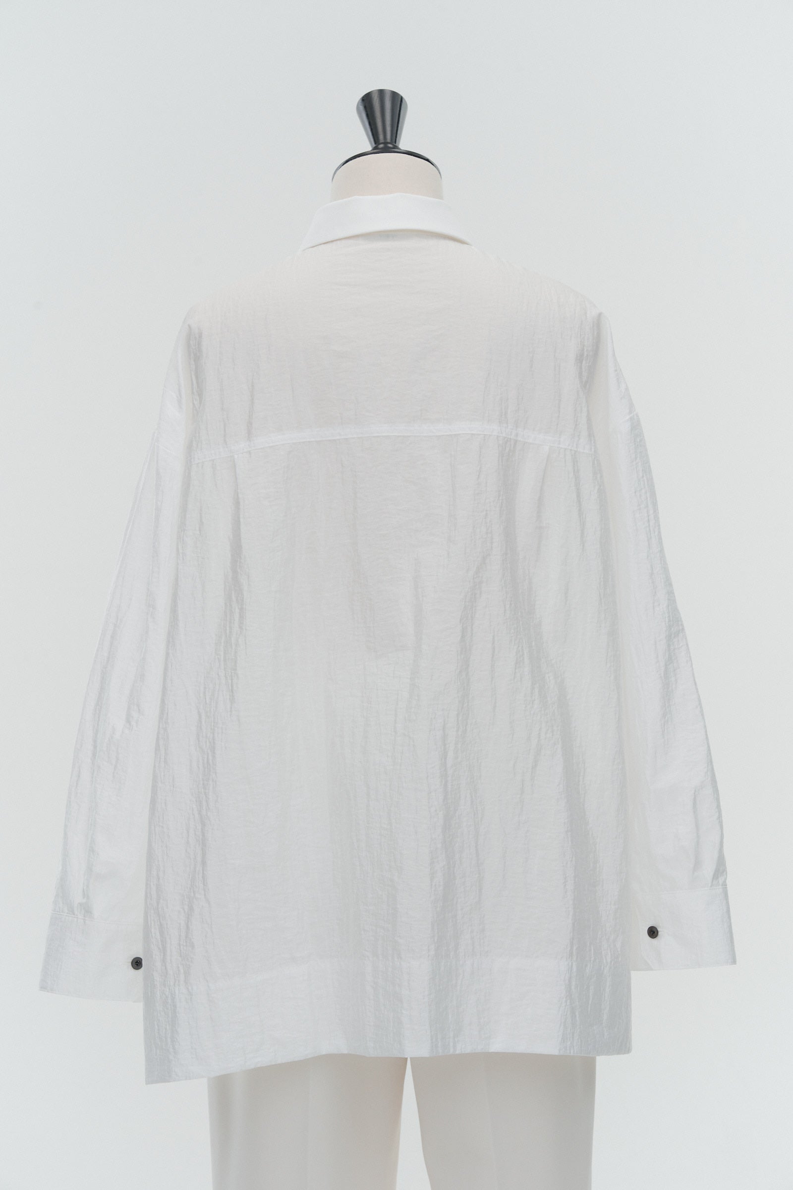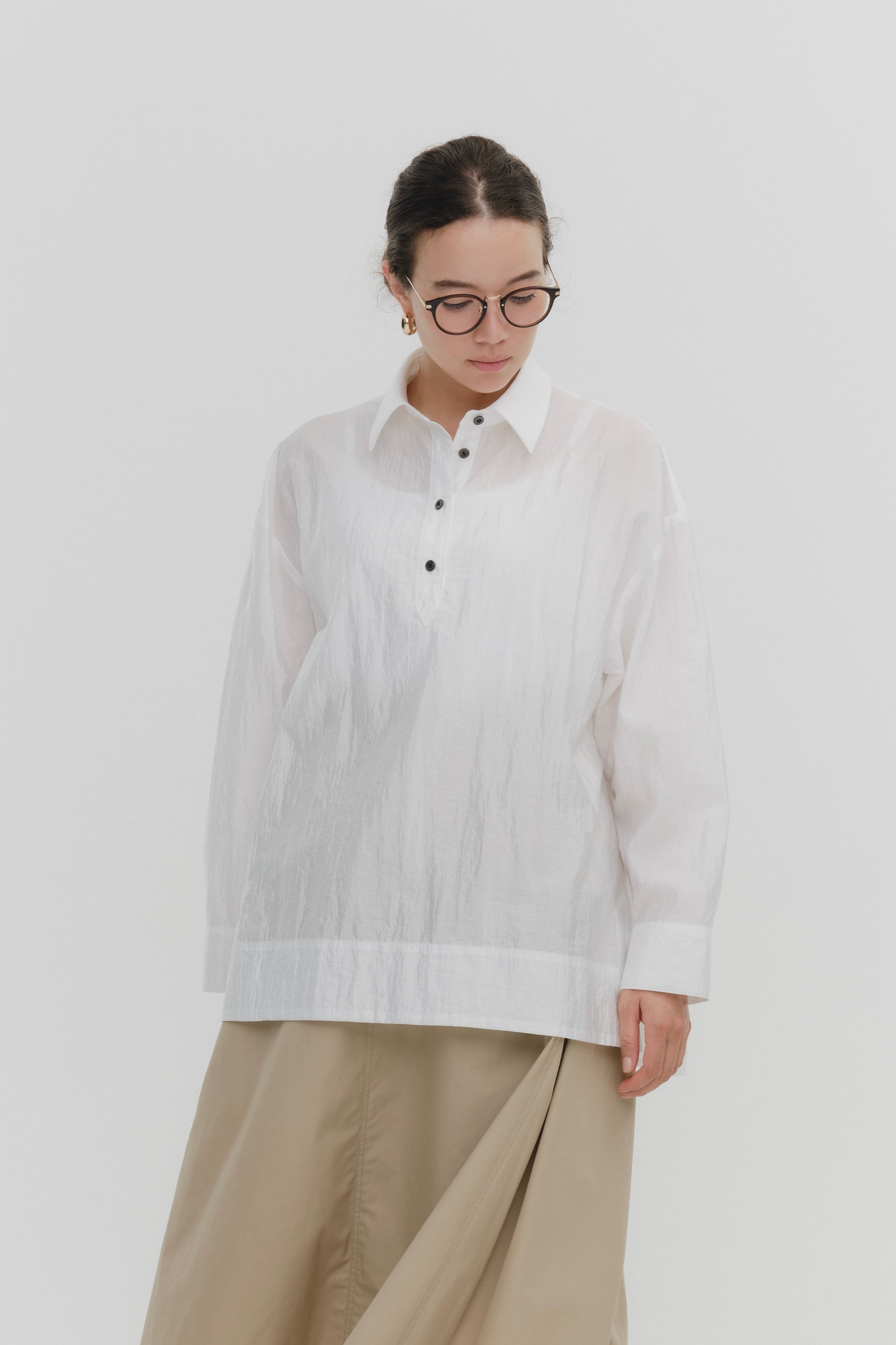 A shirt made from combed lawn fabric, featuring a sheer texture and a glossy finish. The material boasts a textured surface, shiny luster, and a soft feel, offering a rich and expressive appearance with a moderate stiffness and sheer quality. The collar area is crafted with clean and classic Oxford fabric, using 100% cotton with a special finish. This open-collar shirt combines a relaxed fit and an open-collar design to create a laid-back and effortlessly balanced look.