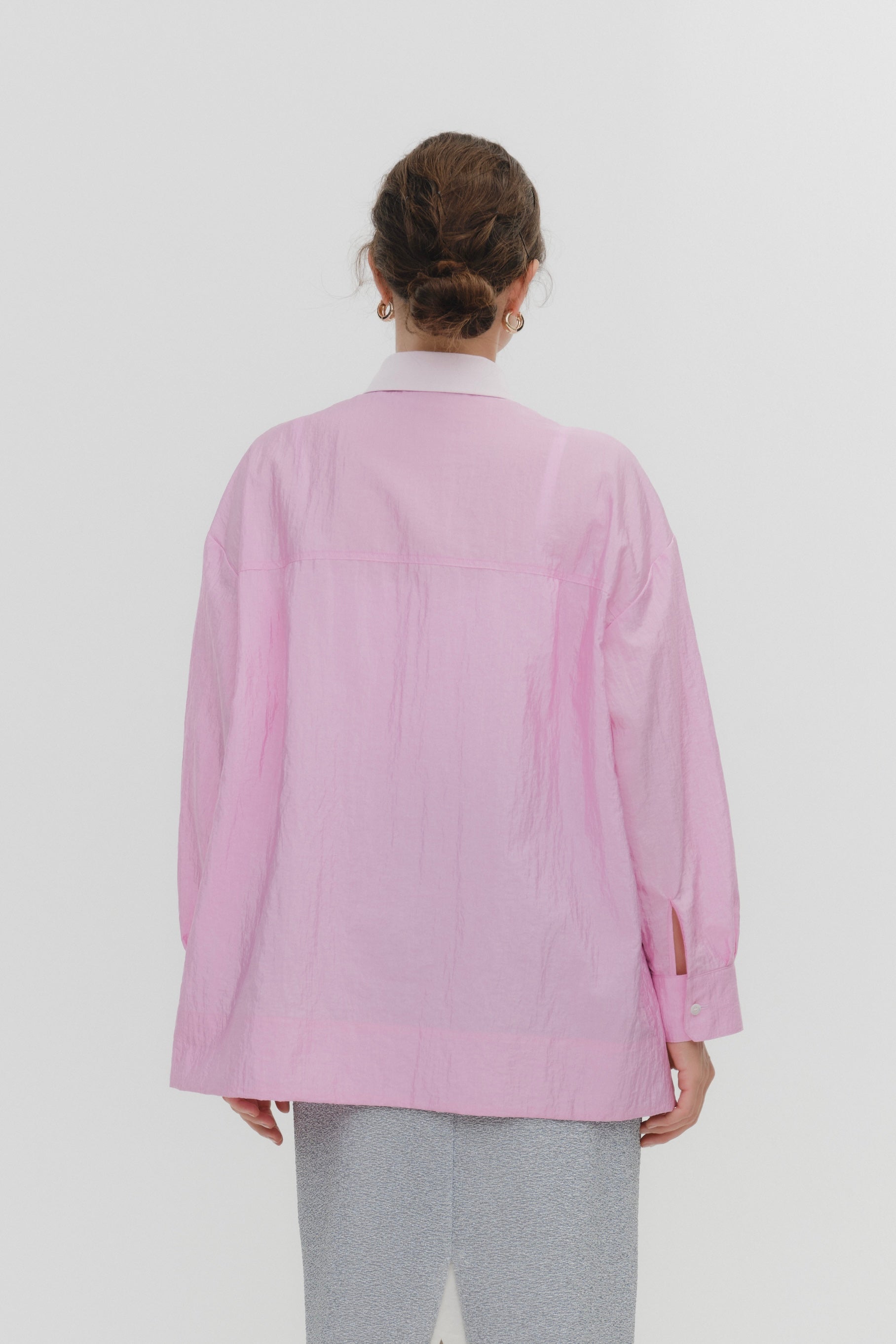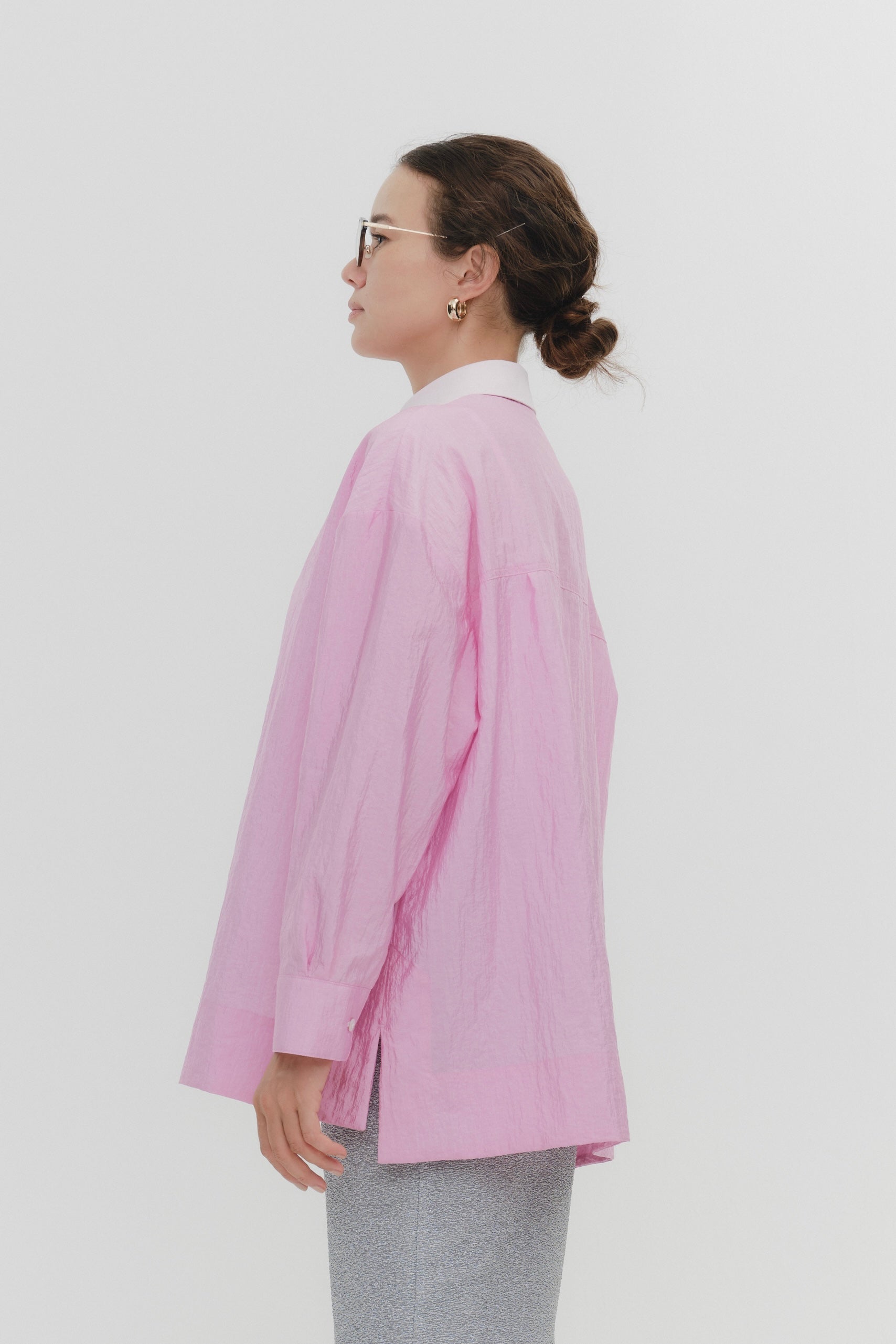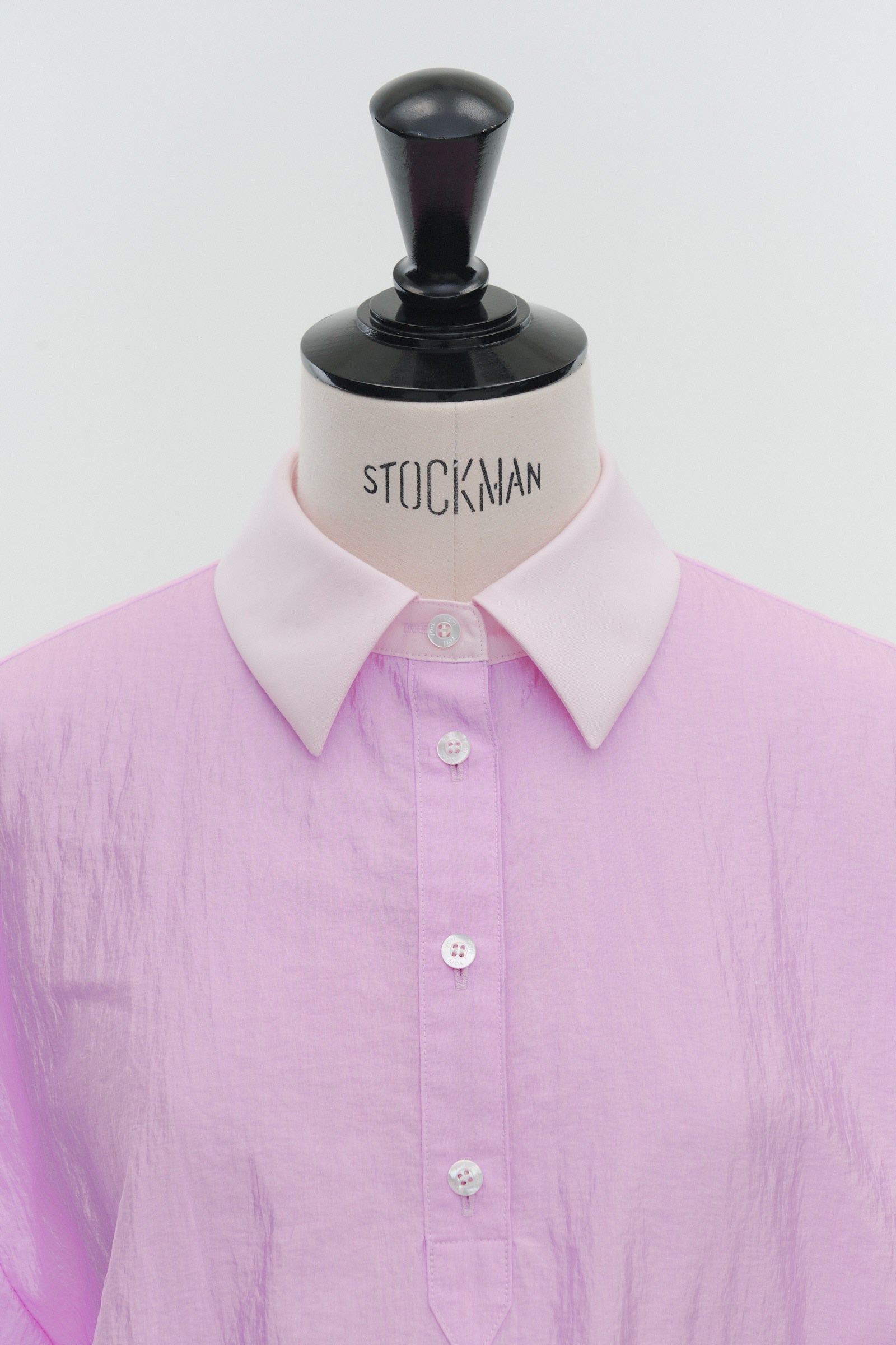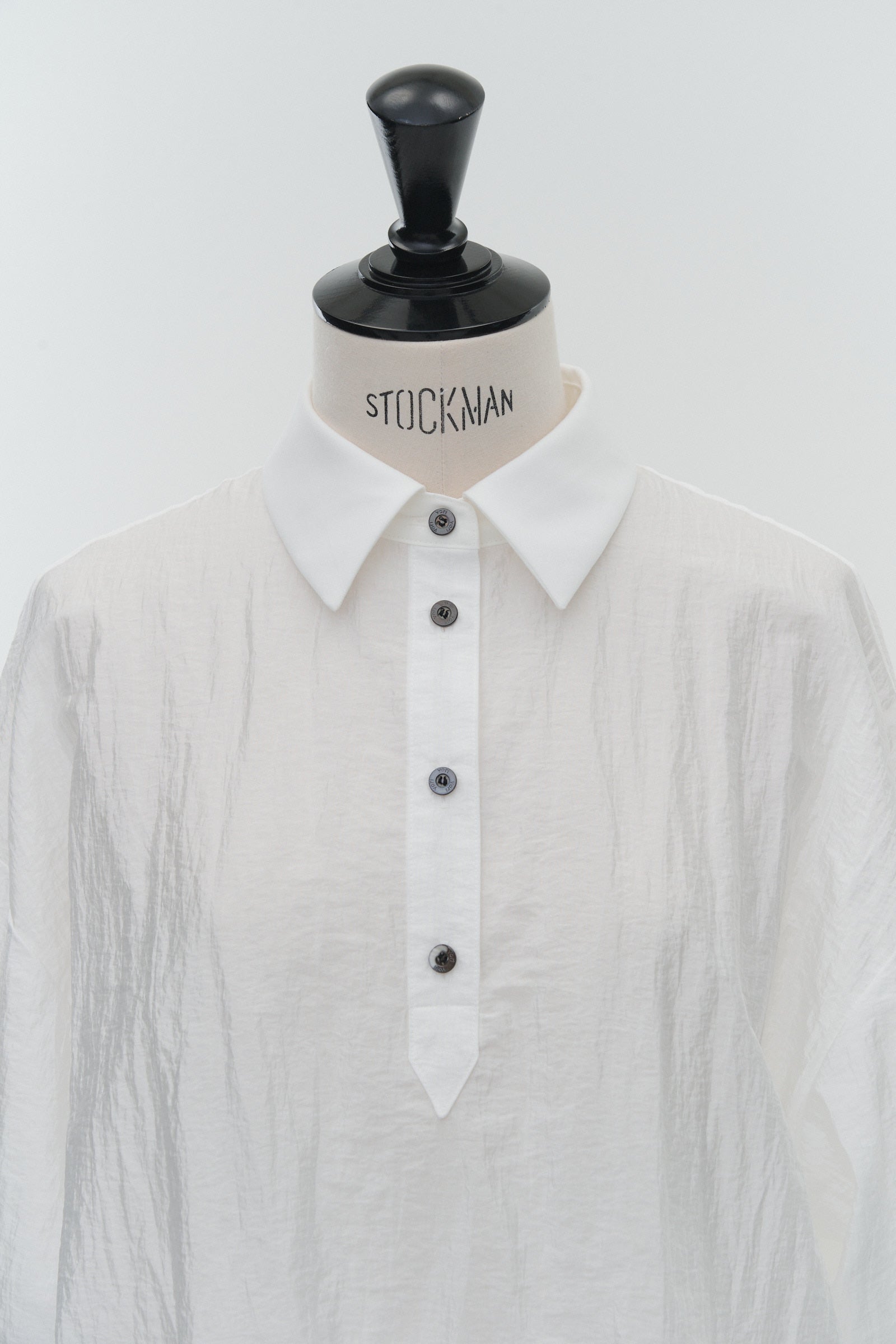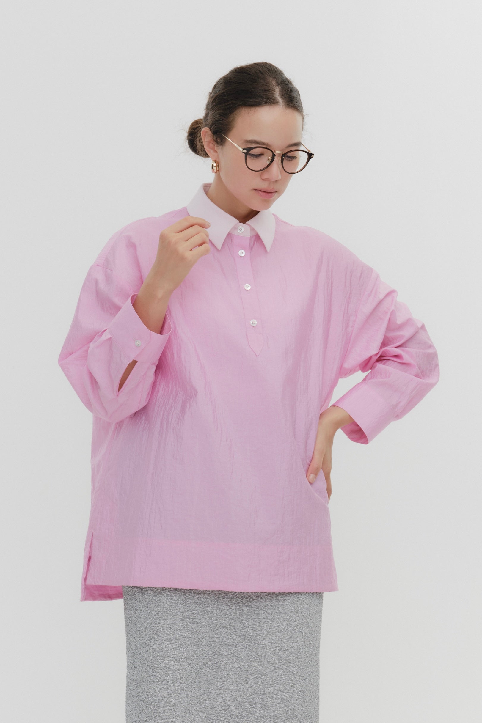 A shirt made from combed lawn fabric, featuring a sheer texture and a glossy finish. The material boasts a textured surface, shiny luster, and a soft feel, offering a rich and expressive appearance with a moderate stiffness and sheer quality. The collar area is crafted with clean and classic Oxford fabric, using 100% cotton with a special finish. This open-collar shirt combines a relaxed fit and an open-collar design to create a laid-back and effortlessly balanced look.